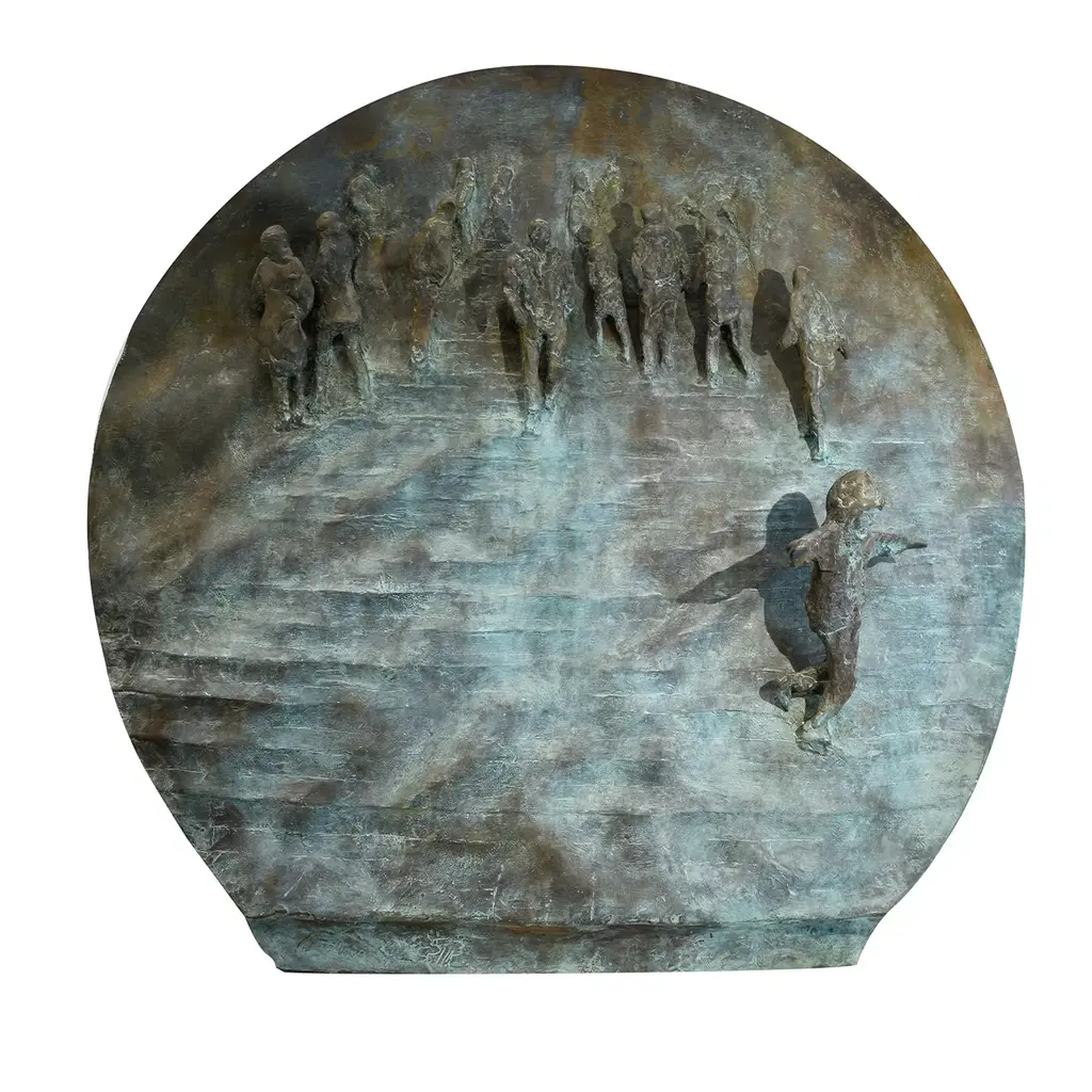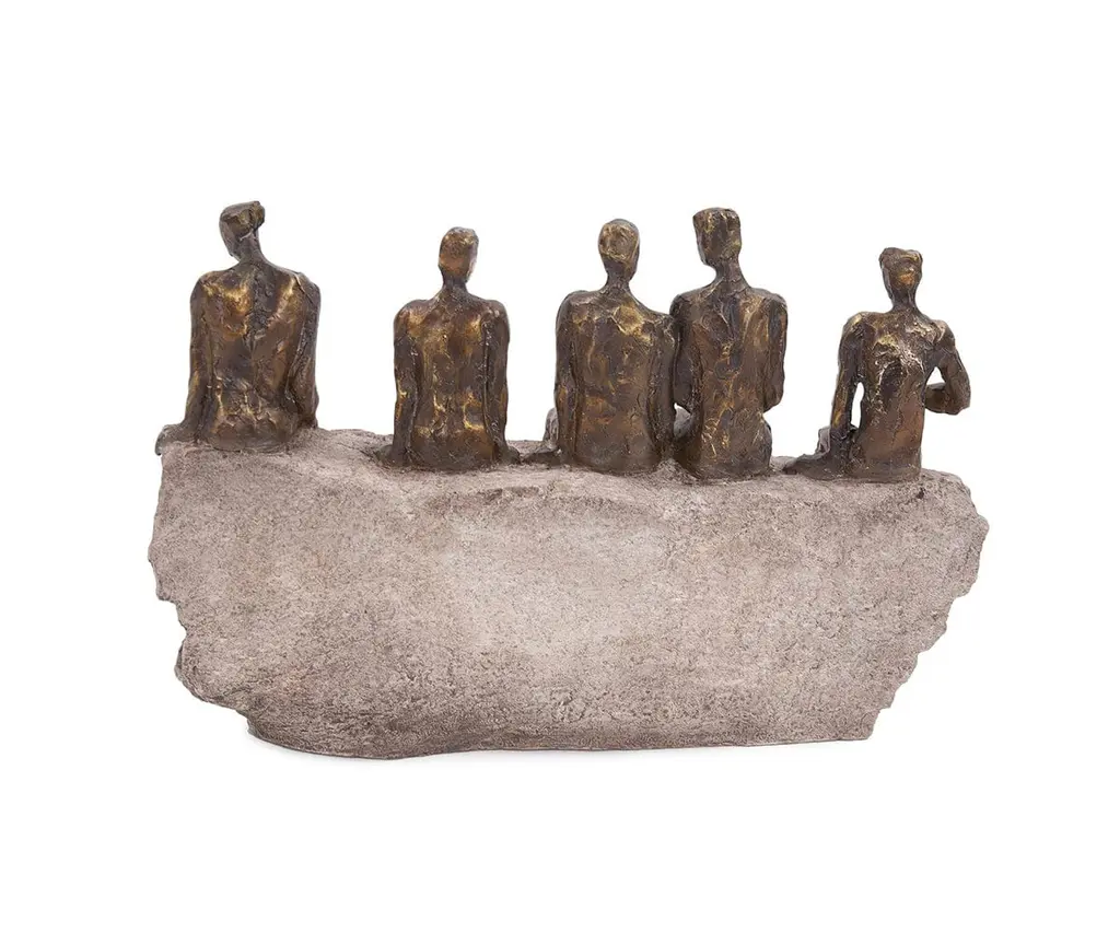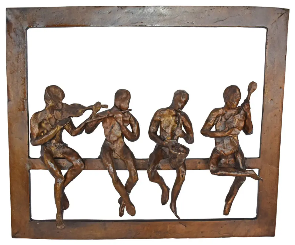 This impressive jazzy wall frame made of 4 musicians can be mounted on any wall desiring a happy addition for any music lover. The immense detail in both the iridescent color of the patina and the shape makes it both surrealistic looking and unique in design. The frame features 4 musicians playing the Violin, Flute, Saxophone, and guitar in a natural form. This bronze statue is cast in the traditional lost-wax method, which highlights the exceptionally fine detail and guarantees lasting heirloom beauty. This work of art would pair well with any of the other musical art you may have. Size: 21"L x 25"W x 4"H. Weight is: 20Lb
