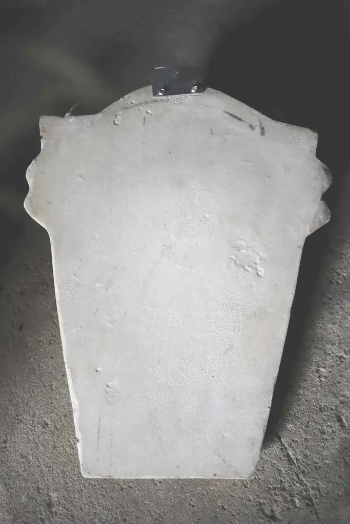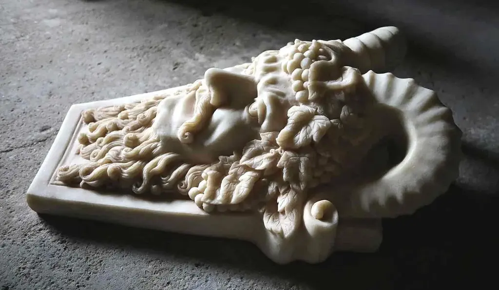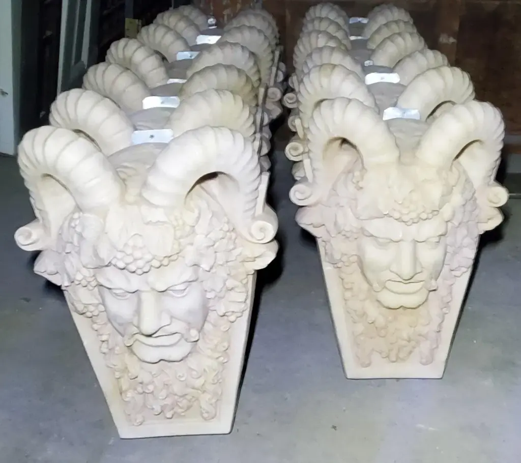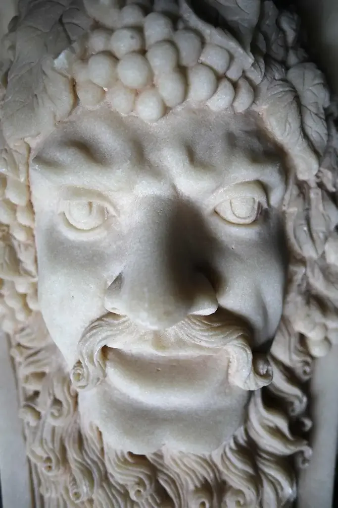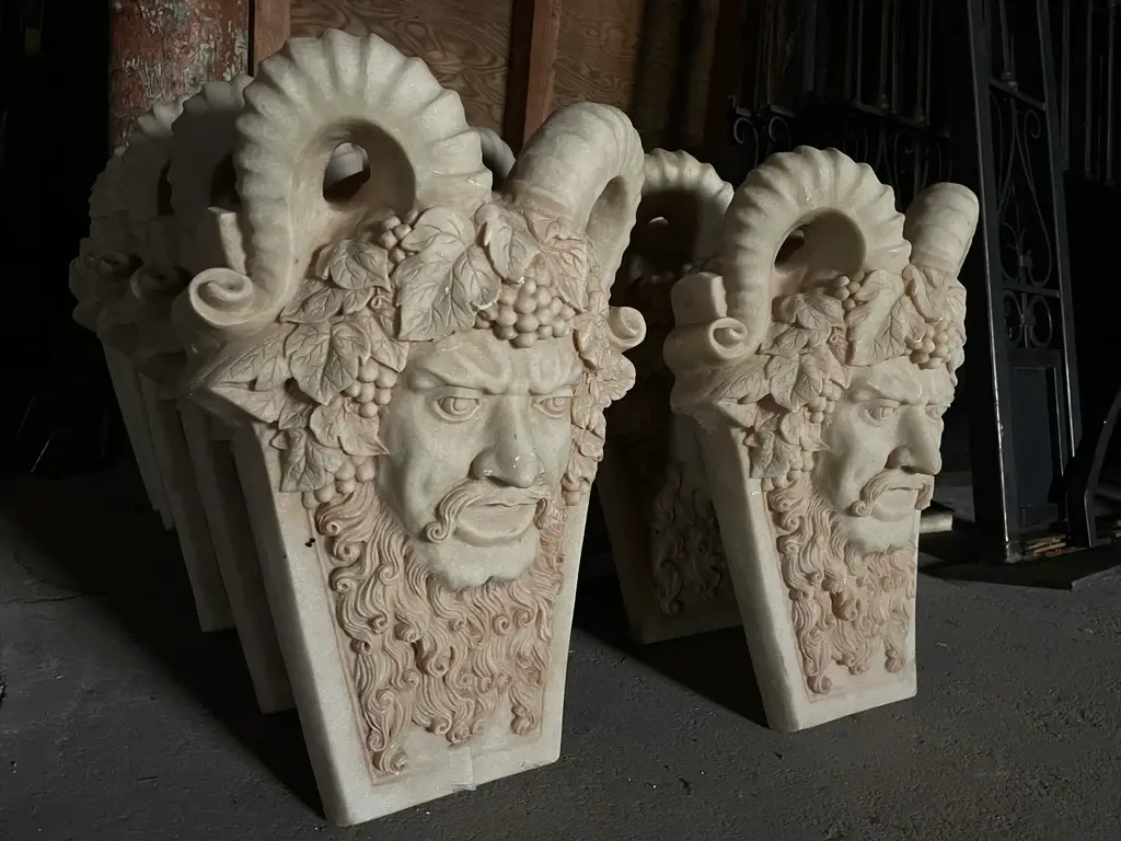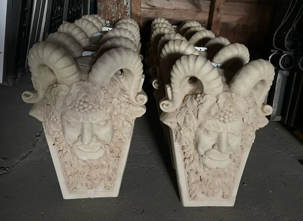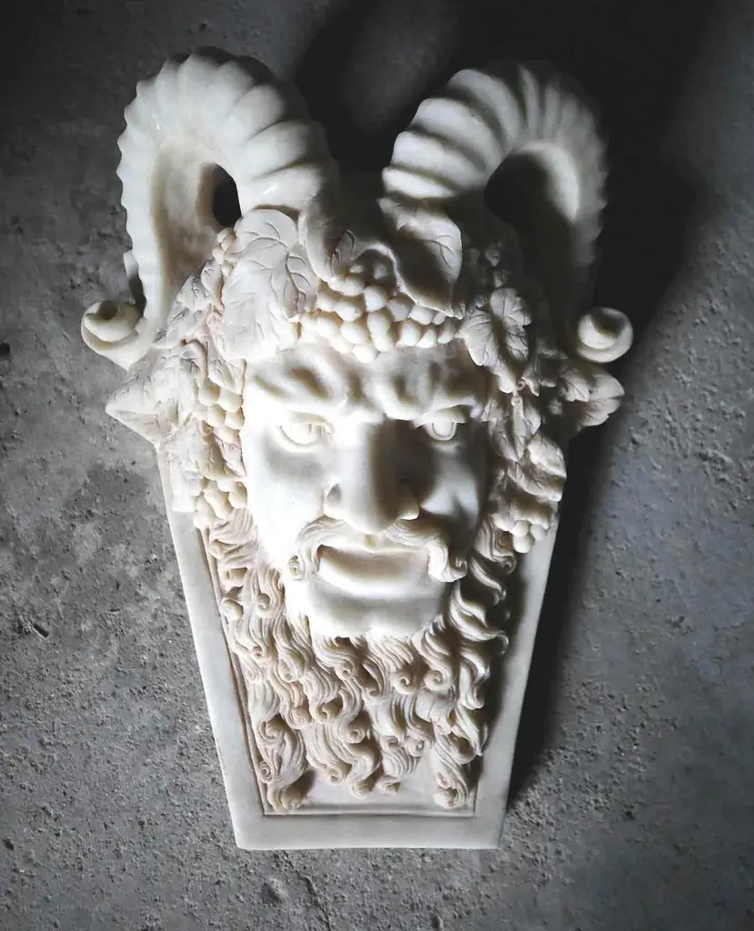 Vintage mythological high relief sculpture of a satyr in the form of a surface mounted keystone plaque. Nicely detailed features include large horns and a head ornament of grapes and grape leaves, expressive face and curly beard. Copied from an original 19th century Beaux Arts style building ornament in cold cast marble resin.