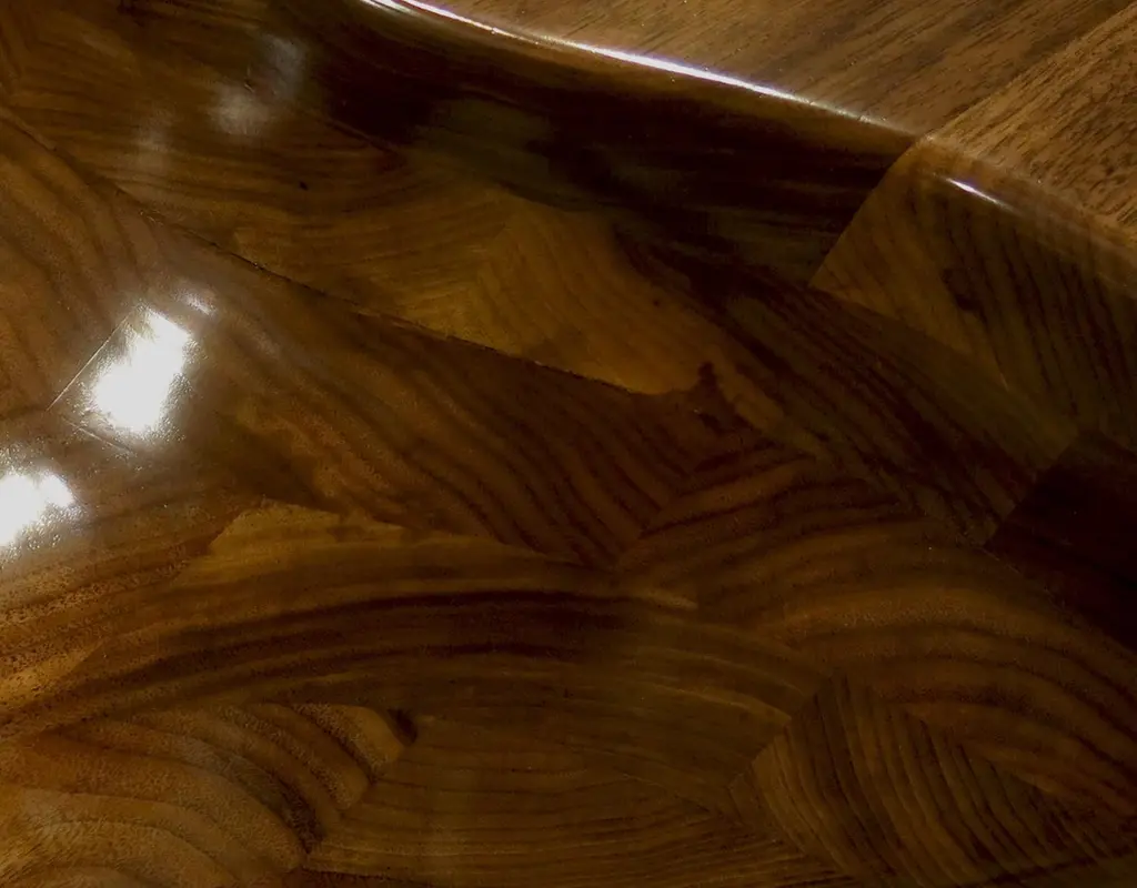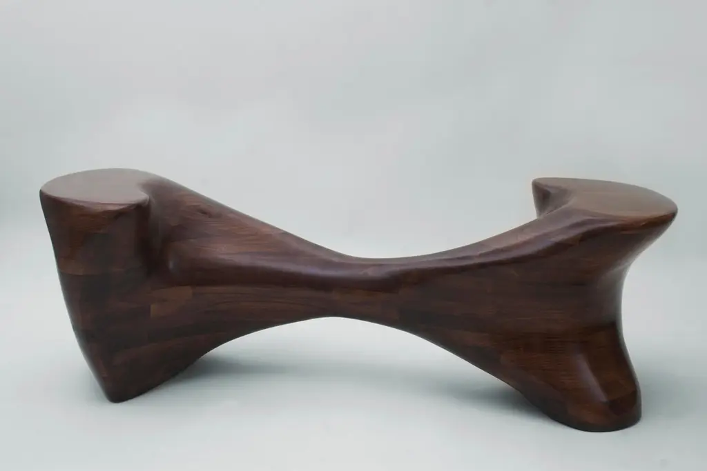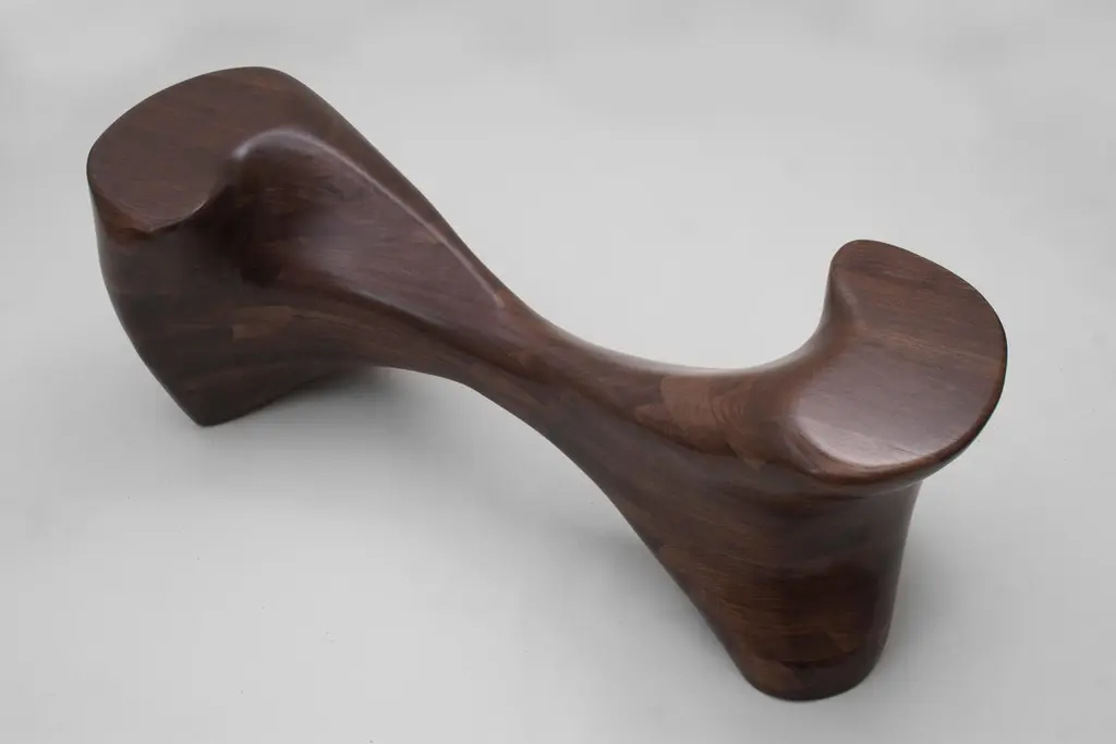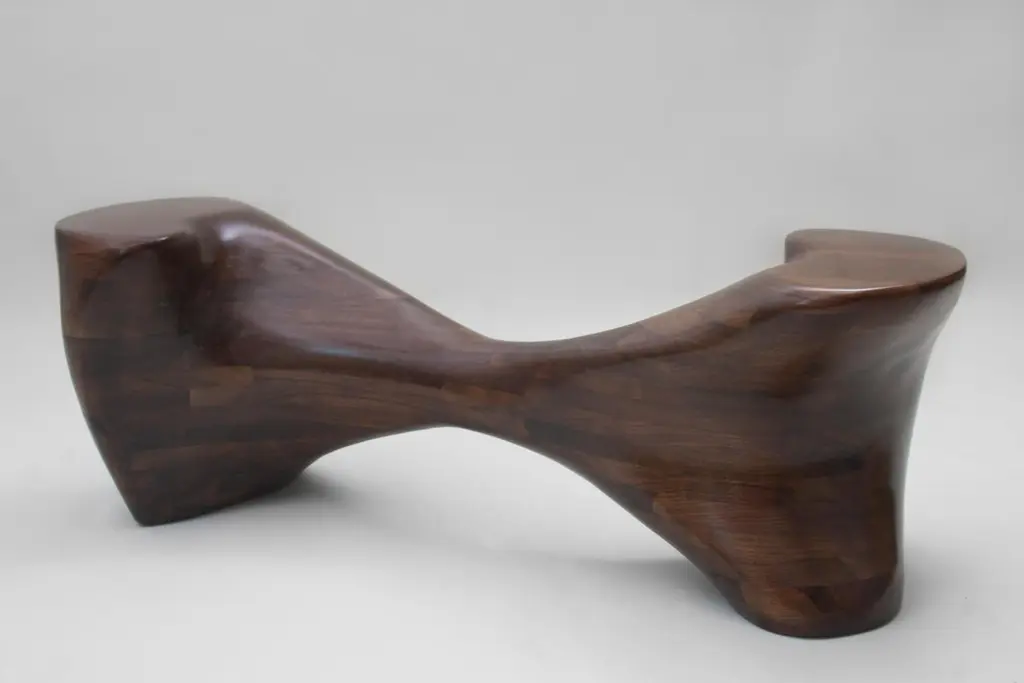 N2 TÊTE À TÊTE by Aaron ScottDimensions: D 43.5 x W 124.5 x H 43.5 cmMaterials: Walnut. Brooklyn-based designer Aaron Scott was raised in the mountains and forests of Southwest Oregon. He studied philosophy at the University of Colorado,Boulder, followed by fine art at the San Francisco Art Institute. Since moving toNYC in the late 90s Scott has worked in a variety of mediums – film, sculpture,writing and furniture design. Drawing inspiration from nature, science andmathematics, Scott’s work explores relationships of space, light and movement.Using a meticulous, labor-intensive process that relies on the hand and the eye, improvisation and experimentation, Scott has developed a body of sculptural furniture characterized by complex geometries, rotational symmetry and unconventional engineering. Since the early 2000s Scott’s furniture has been built using the stacked-laminate method – a technique that relies on the careful laying-out of alternating grain patterns on parallel pieces of wood, overlapped in successive layers. The process is both additive and subtractive. In the first stage the rough form is built by stacking glued-up layers, each corresponding to a given point on the x, y or z axes. These layers, laminated together in a stair-like or topographical form, are then sculpted with handheld power tools to obtain the final, smooth surface. With each new piece Scott attempts to push the boundaries of the medium of wood and his own imagination, posing and re-posing the question to himself: Which parts of the form are essential and which can be removed?.