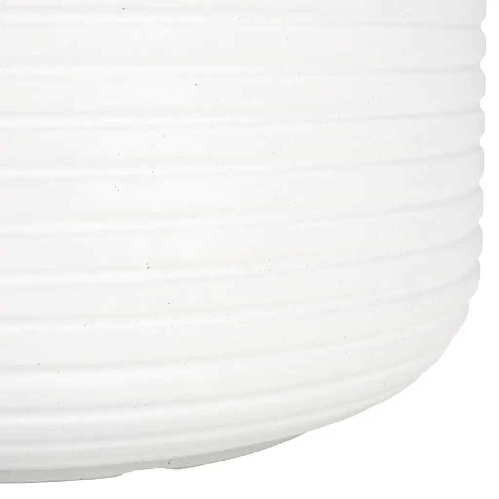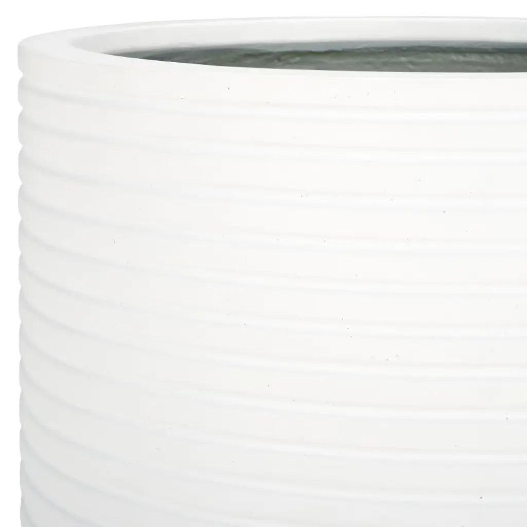 Natural stone meets minimalist design in the Nardo Large Planter Set of 2 Pots. Crafted from robust, weatherproof Ficonstone, these pots are designed to showcase your favorite greenery both indoors and outdoors, with a look that seamlessly transitions between the two. Each planter in this duo flaunts an elegant white color, offering a crisp, clean look that enhances the natural vibrance of your plants. Their design is tastefully accentuated by simple yet striking horizontal stripes, adding a touch of modern sophistication to your decor. The Nardo Large Planter Set not only cocoons your plants in luxurious style, but also imparts an aesthetic essence to any space. Whether you're looking to create an urban jungle or a rustic garden retreat, these pots ensure your plants take center stage. Experience the timeless elegance of the Nardo Large Planter set - where quality material meets innovative design.