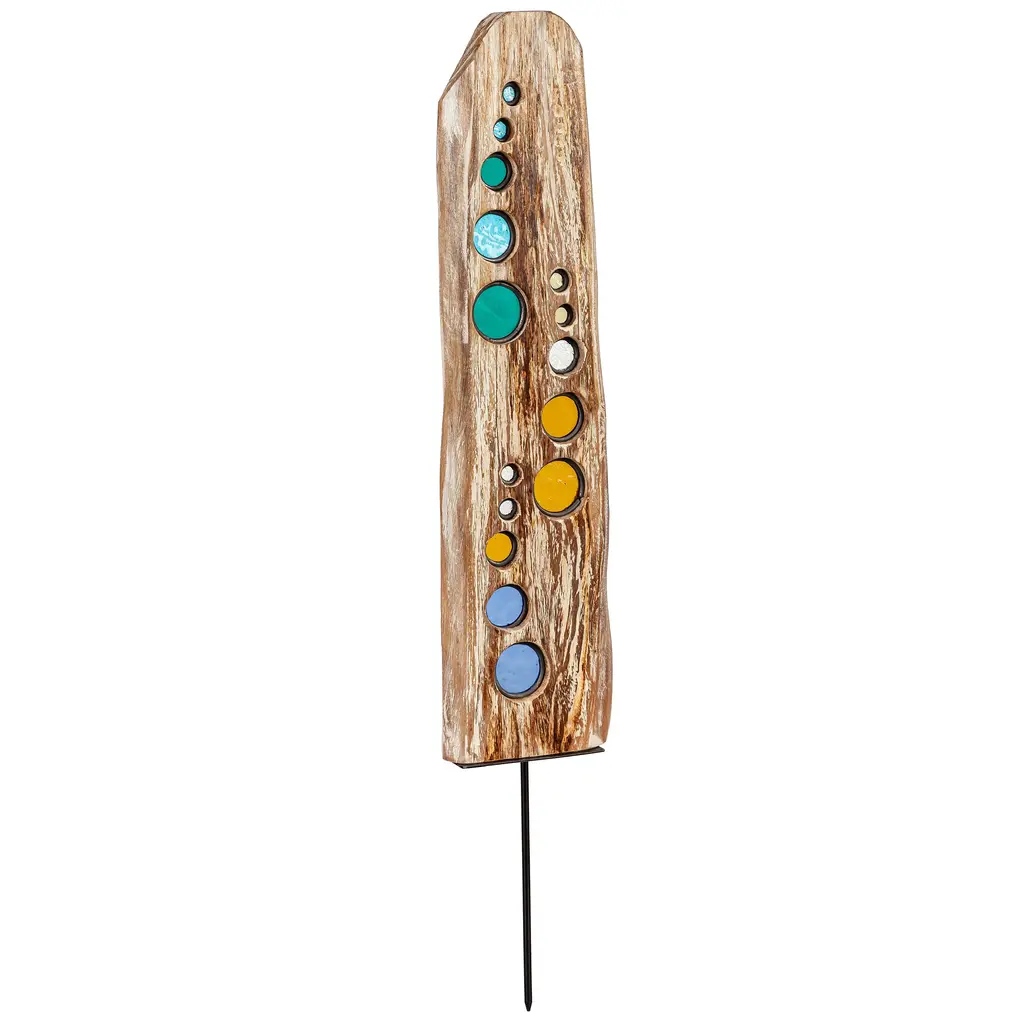 Charming Natural Driftwood and Colorful Glass Statue will bring the feeling of the beach to any space. Reclaimed driftwood is assembled with serene-colored sea glass for an accent with organic and artisan-made appeal. This coastal sculpture will make a beautiful addition to any home; pair with other natural styles and neutral colors to bring a little nature indoors. Single metal stake makes it easy to place in any planter.