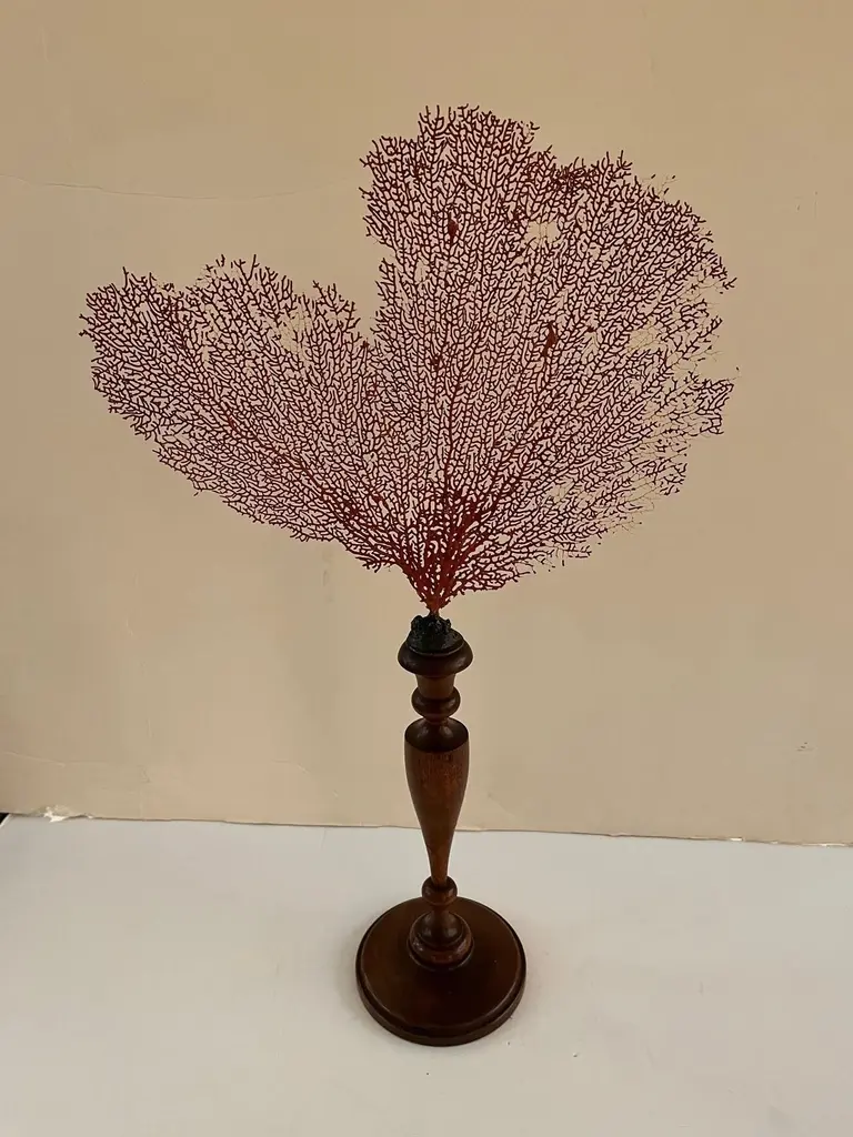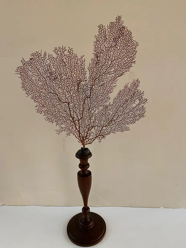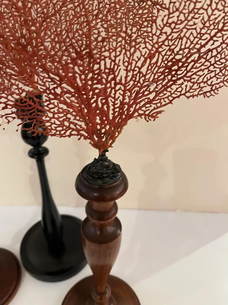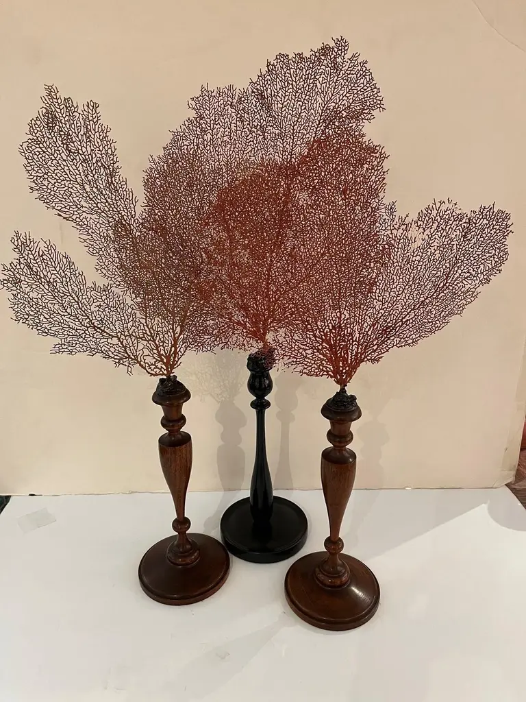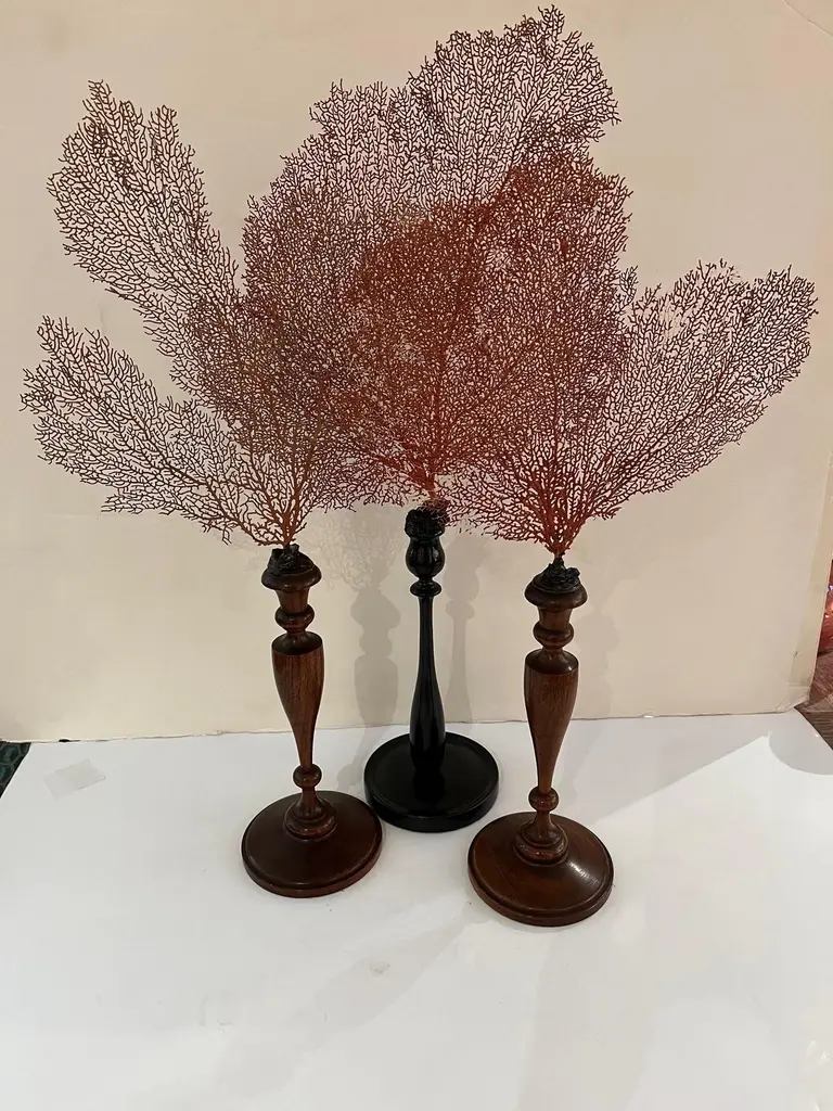 Vintage Set of Three Natural Sea Fan Sculptures on One Black Candlestick Stand and Two on Medium Walnut Color Candlestick, Clear Lacquered to Preserved Natural Color, real preserved dried Sea Fan, Soft cool Coral Home Decor.Dimensions: 14" W X 5" Base X 26" H15"W X 5" Base X 28" H15" W X 5.5" Base X 28" H