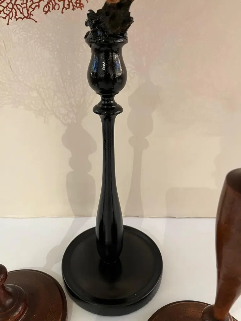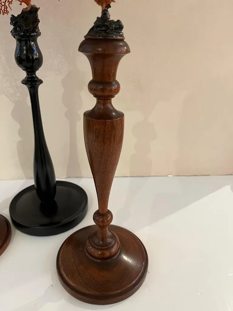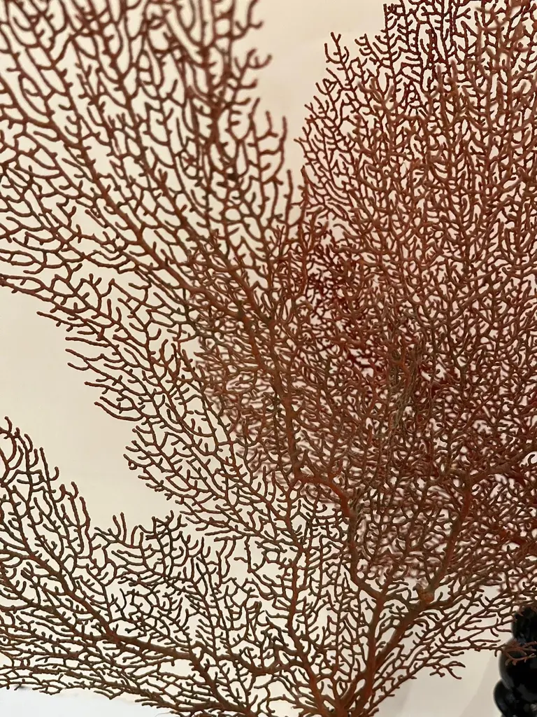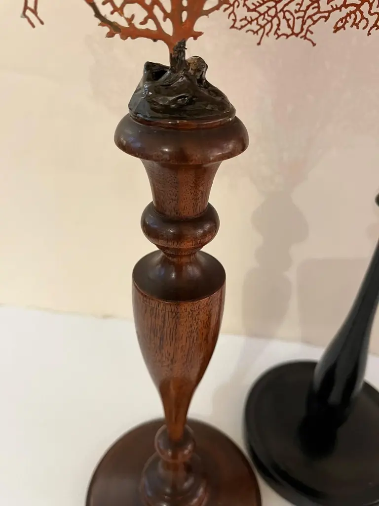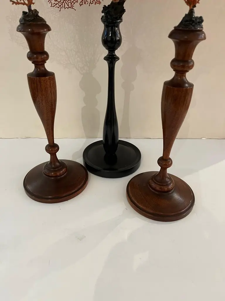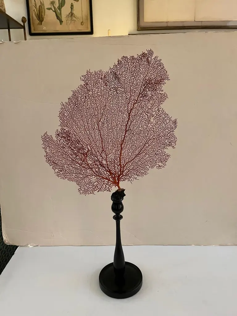 Vintage Set of Three Natural Sea Fan Sculptures on One Black Candlestick Stand and Two on Medium Walnut Color Candlestick, Clear Lacquered to Preserved Natural Color, real preserved dried Sea Fan, Soft cool Coral Home Decor.Dimensions: 14" W X 5" Base X 26" H15"W X 5" Base X 28" H15" W X 5.5" Base X 28" H