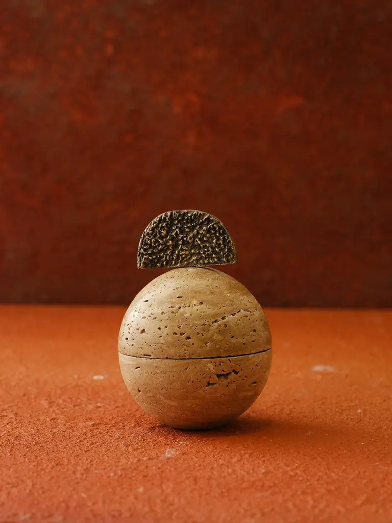 Elevate your interior with this sculptural fusion of earth-born elegance and contemporary design. Crafted from 100% natural travertine stone, the spherical base exudes warmth through its organic veins and rich caramel tones. Resting atop is a textured bronze semicircle, hand-finished to add a sense of ancient artistry and tactile intrigue. This unique decorative object blurs the line between art and function—ideal as a centerpiece on a coffee table, console, or bookshelf. Each piece is one of a kind, celebrating the natural variations and raw beauty of its materials. Perfect for modern, minimalist, or earthy interiors seeking a refined, grounding presence.