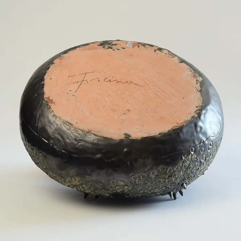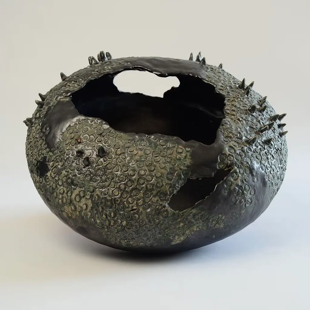 This one-of-a-kind sculpture is part of the Naturalia series and was made entirely by hand in terra cotta using the coiling technique, and then covered in rich glazes and oxides in anthracite and green. This unique piece is not reproducible.