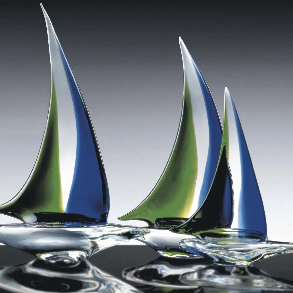 Crafted and decorated by hand, this refined Murano glass sculptures masterfully expresses the beauty of sailboats out at sea. The billowing of the boats is evoked in the delicate curve of the two-toned sail, which combines harmoniously with the clear boat-shaped base. A perfect gift for a collector, this set will make a statement in a modern or traditional decor. The pieces measure 43 cm, 28 cm and 33 cm (height) and can be sold separately. Ask the Concierge for details and pricing for each item.