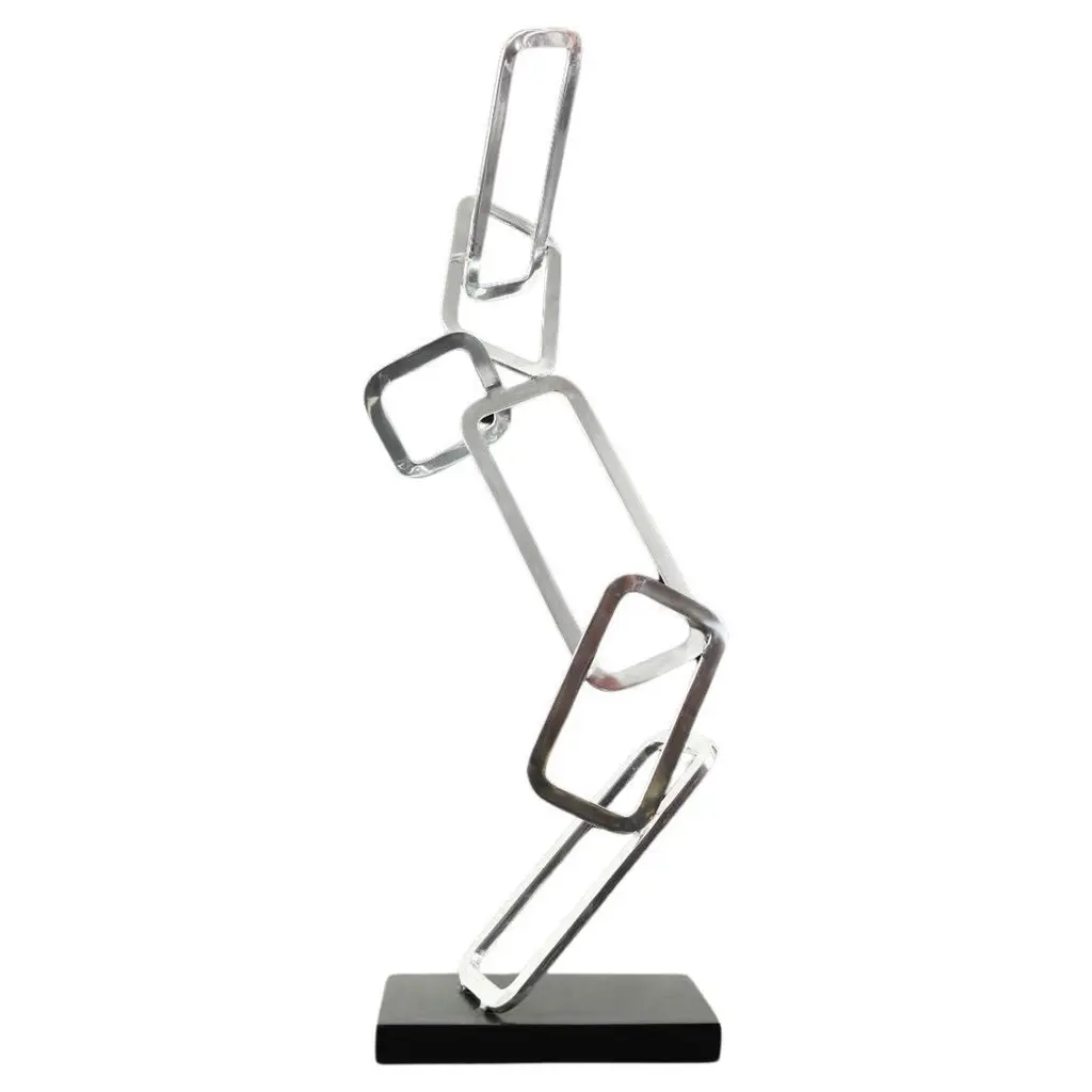A contemporary sculpture that functions as a bookcase, this striking piece boasts a unique composition entirely made of steel using traditional techniques. Composed of a rectangular base, a series of rings of different sizes are balanced on a vertical line creating a sense of lightness and a stunning visual effect.