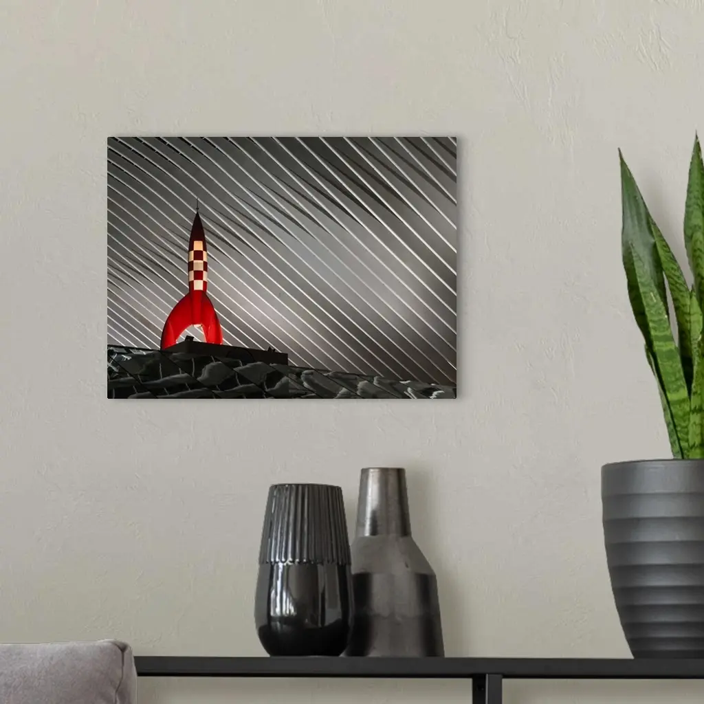 Sculpture of Tintin's rocket from the book series by Herge, illuminated from below.