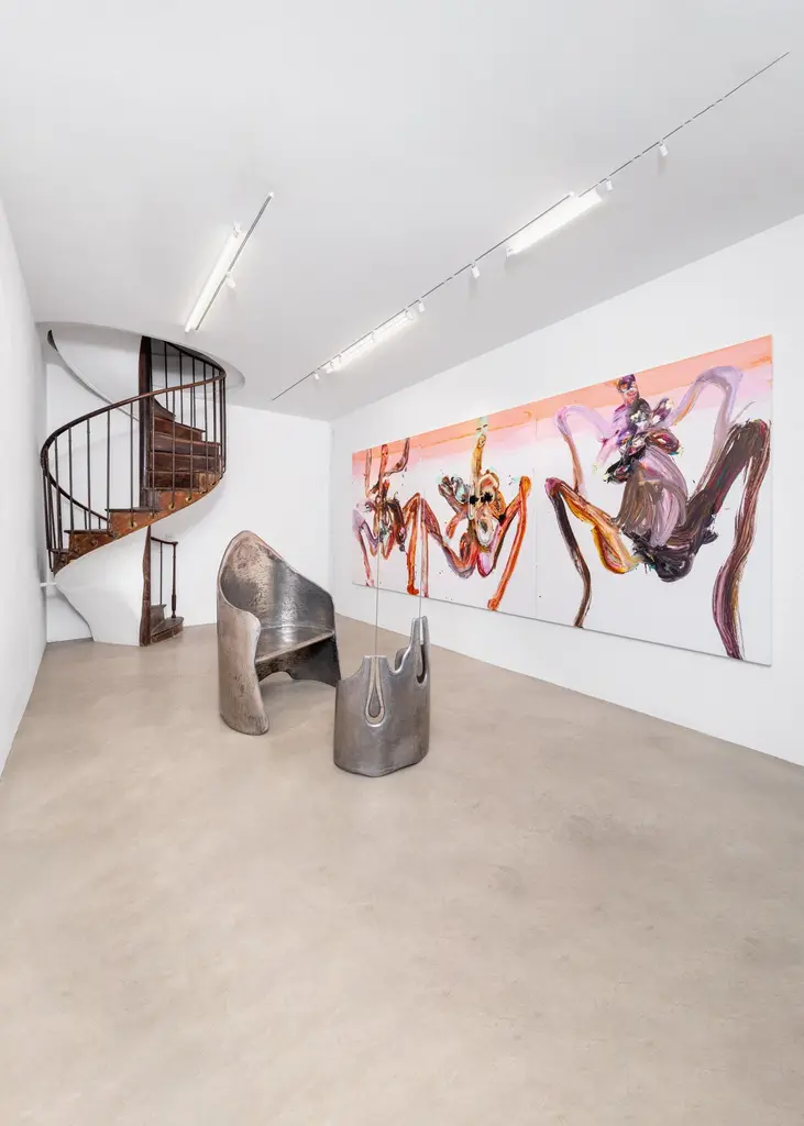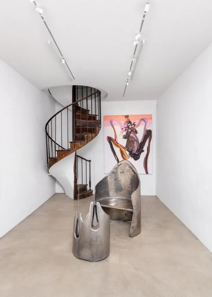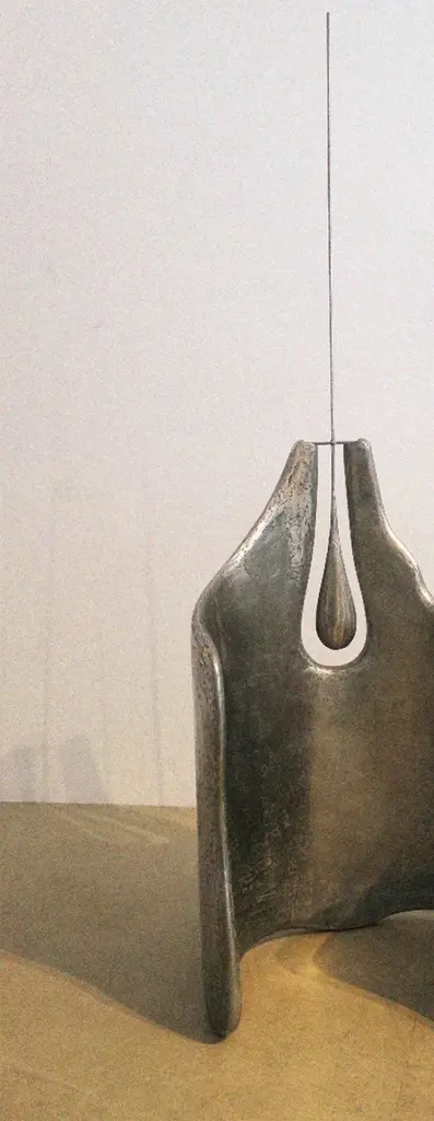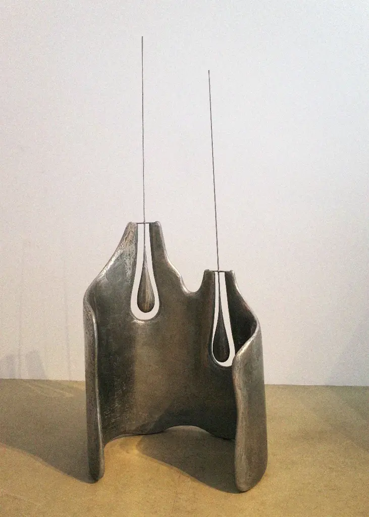 No Center, No Above, No Below Kinetic Sculpture by Atelier ElleryOne Of a Kind.Dimensions: D 36 x W 85 x H 145 cm.Materials: Metal resin, plaster, and iron.Available in different finishes and material options. Prices may vary. Please contact us.Atelier ElleryMy practice is rooted in architectural form, material tension, and the relationship between object and body. I work primarily with metals—materials that carry weight, memory, and permanence—shaped into sculptural pieces that invite both physical and visual interaction. These objects often explore gravitational dynamics, considering how weight, balance, and form affect the way the body approaches, responds to, or is held by a structure.These forms often explore boundaries: between intimacy and distance, stillness and movement, structure and softness. Many of my works can be touched, sat in, or moved; kinetic elements are introduced to create a sense of calm, presence, and responsiveness. A movement might echo the body’s gesture or rhythm, subtly shifting how one relates to space.I’m interested in how sculpture can function as a site; something to enter into, rest within, or observe quietly. By folding materials around imagined or real bodies, I seek to create objects that hold a charge: sculptural presences that feel at once solid and open, architectural and emotional.Each piece is a study in form, but also feeling; how a curve invites approach, how a divide becomes a threshold, how metal, when worked by hand, retains the trace of care.