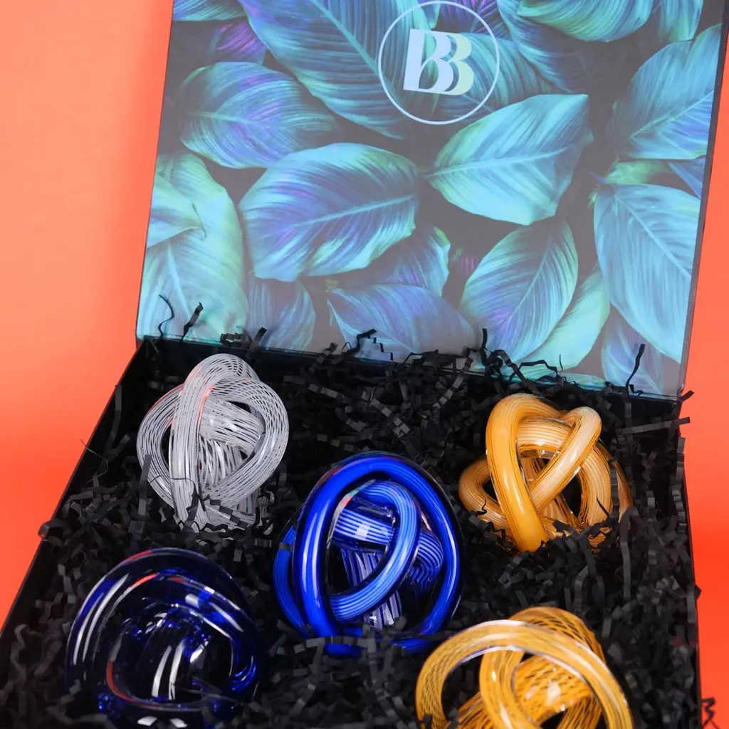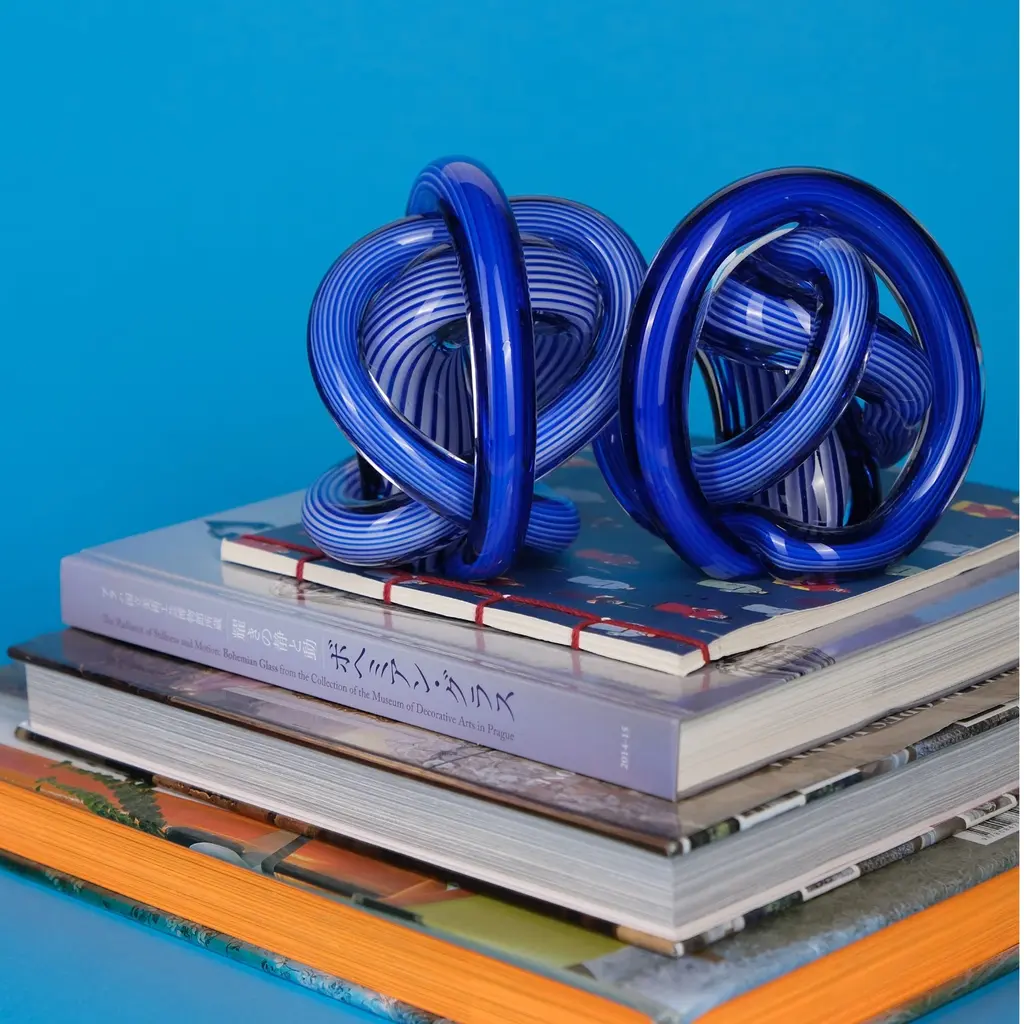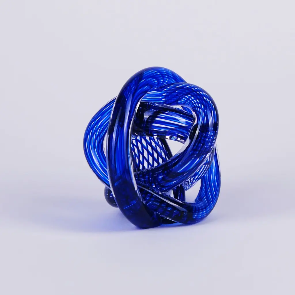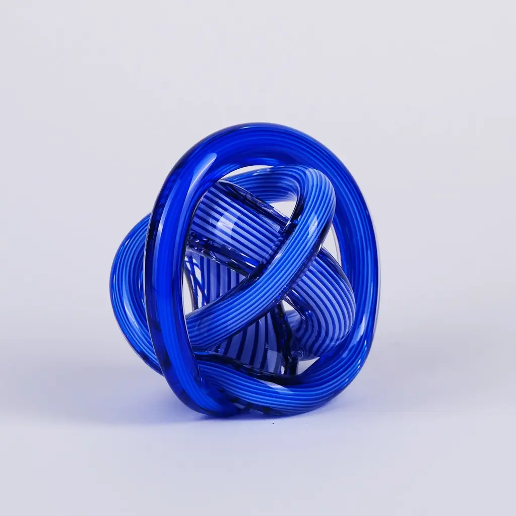 The Cobalt Loop Hand-Blown Glass Sculpture is a bold expression of movement and artistry. Twisting and interlocking in an intricate knot, this sculptural piece is formed from deep cobalt blue glass with fine linear detailing that reflects and refracts light from every angle. Its striking color and dynamic form bring energy and sophistication to contemporary interiors, making it the perfect conversation piece for shelves, desks, or display pedestals. Each curve tells a story of craftsmanship, precision, and timeless design.