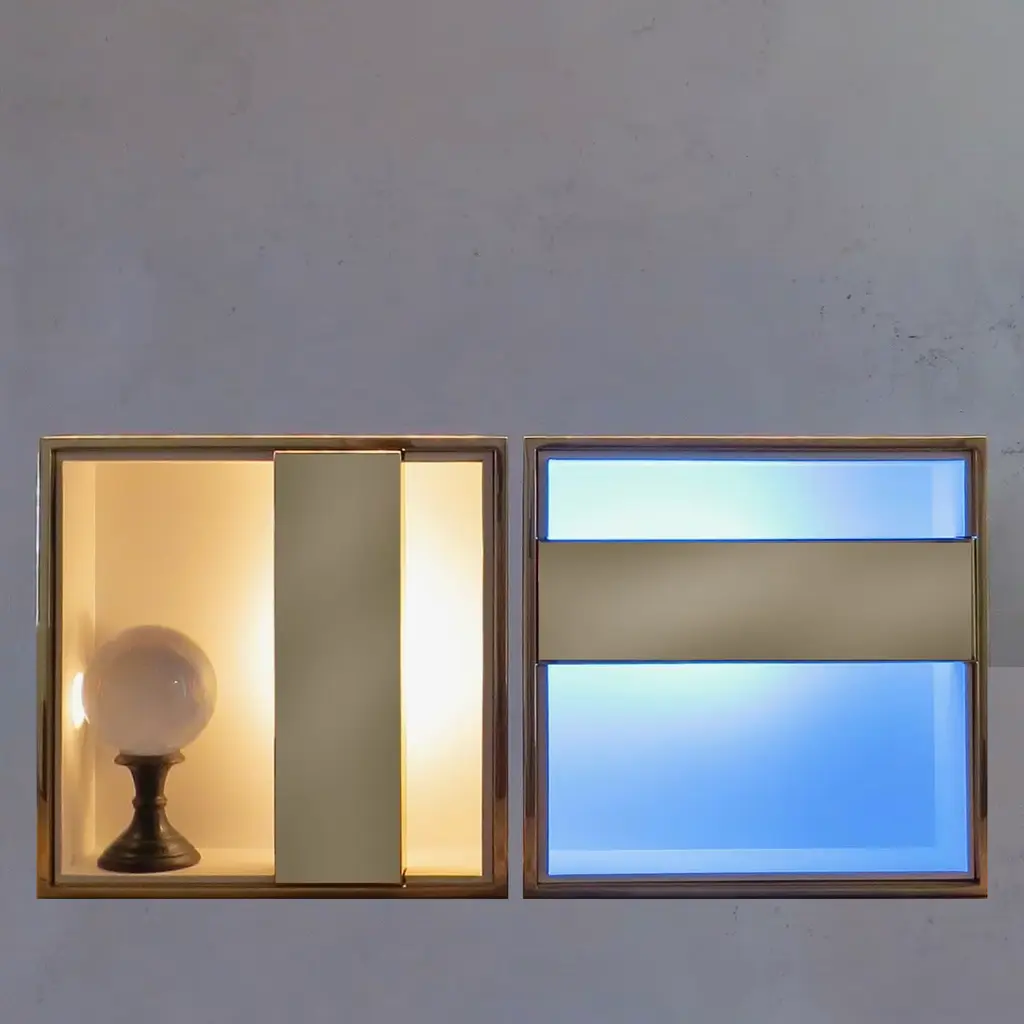 Designed by Giuseppe & Lazzaro Raboni and Marco Zanuso Jr. as part of the Quadri di Luce Collection, this bronzed brass light sculpture is made of and produced in a limited edition of 10 certified and numbered pieces. This innovative, modular design places the E27 230V 22W light source behind the panel suspended in the square frame and the back completely empty, therefore reflecting indirect illumination. A multi-functional piece that can be used on a table, wall, ceiling, or luminous display box, the basic module can be assembled with others to create customized geometric and abstract compositions. The light includes healthy dim to warm technology. Please contact the Concierge for further information.