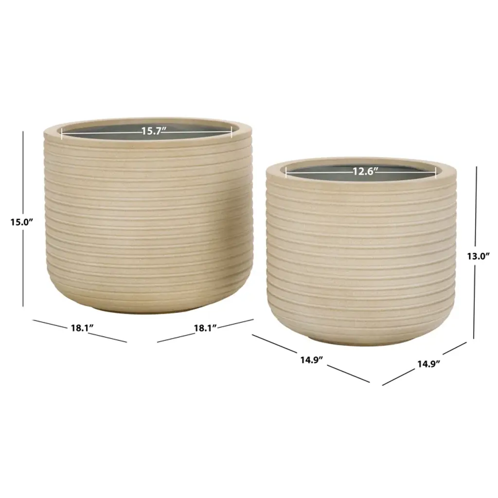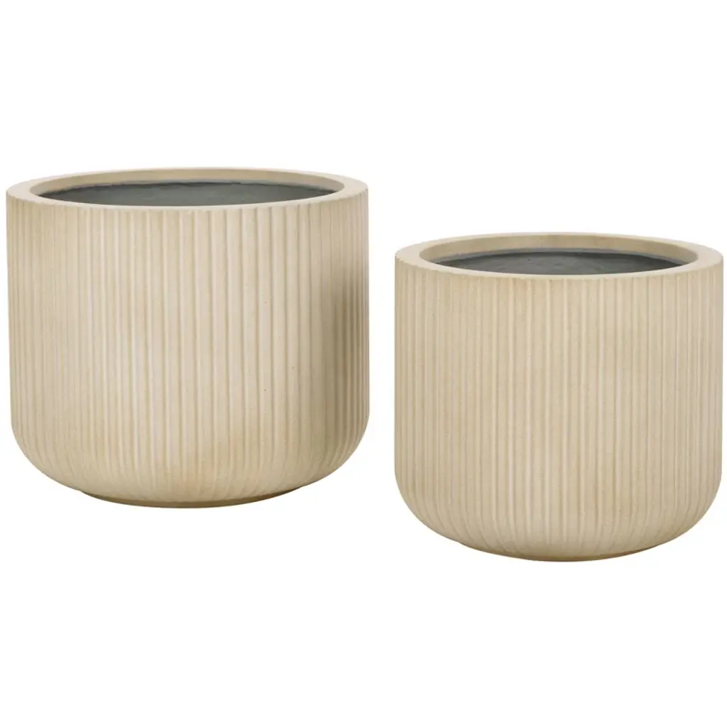 Natural stone meets minimalist design in the Nardo Large Planter Set of 2 Pots. Crafted from robust, weatherproof Ficonstone, these pots are designed to showcase your favorite greenery both indoors and outdoors, with a look that seamlessly transitions between the two. Each planter in this duo flaunts an elegant white color, offering a crisp, clean look that enhances the natural vibrance of your plants. Their design is tastefully accentuated by simple yet striking horizontal stripes, adding a touch of modern sophistication to your decor. The Nardo Large Planter Set not only cocoons your plants in luxurious style, but also imparts an aesthetic essence to any space. Whether you're looking to create an urban jungle or a rustic garden retreat, these pots ensure your plants take center stage. Experience the timeless elegance of the Nardo Large Planter set - where quality material meets innovative design.