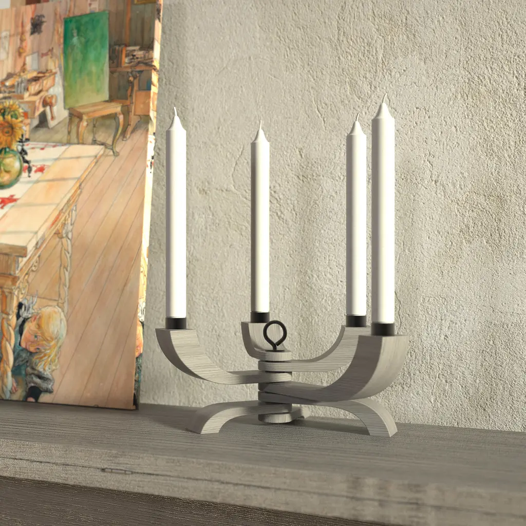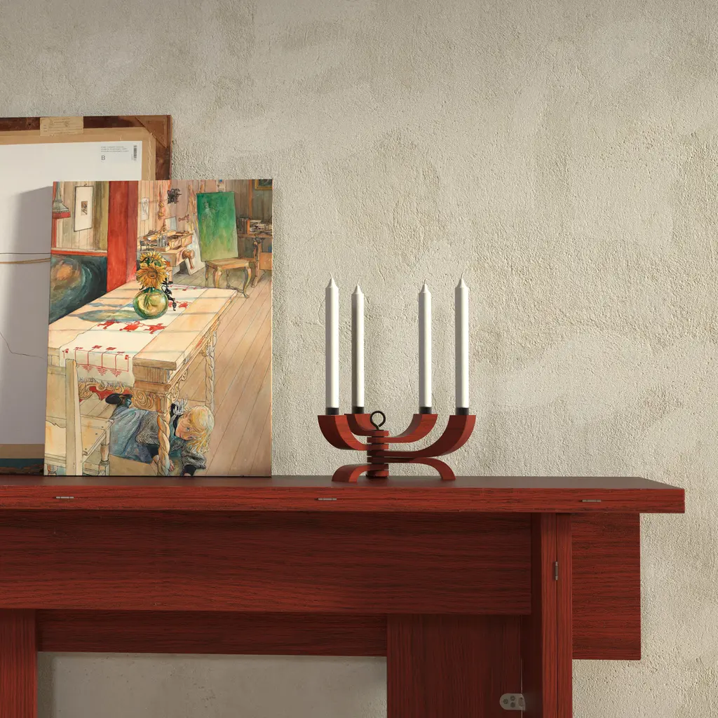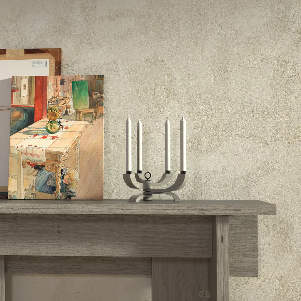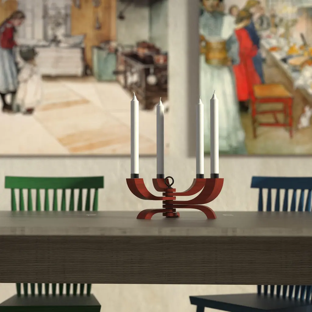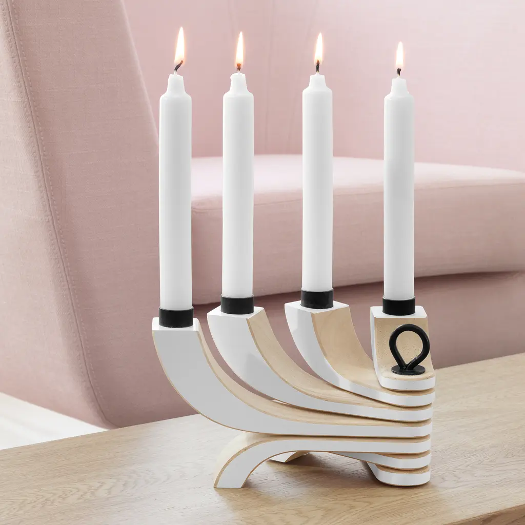 A dynamic sculpture that will never go unnoticed, the Nordic Light Foldable Candelabra features moving arms that you can arrange and fold to your heart’s desire. With this ingenious design, Jonas Grundell has transformed the traditional candle holder into an interactive object that can change its appearance in seconds. The curved arms move on the central axis, with a handy loop providing an easy way to separate or connect the different parts. Whether spread out, with the four candles oriented in four directions, or placed in a spiraling arrangement, Nordic Light will steal the show in any décor. The choice of materials enhances the design further. Crafted from lacquered or stained rubber wood, the arms boast a matte surface. The steel candle rings and the hinge feature a contrasting black finish that makes them resemble cast iron. When not in use, this flexible candle holder folds neatly to occupy a minimum of storage space, but you’ll probably want to leave it out on display, anyway.