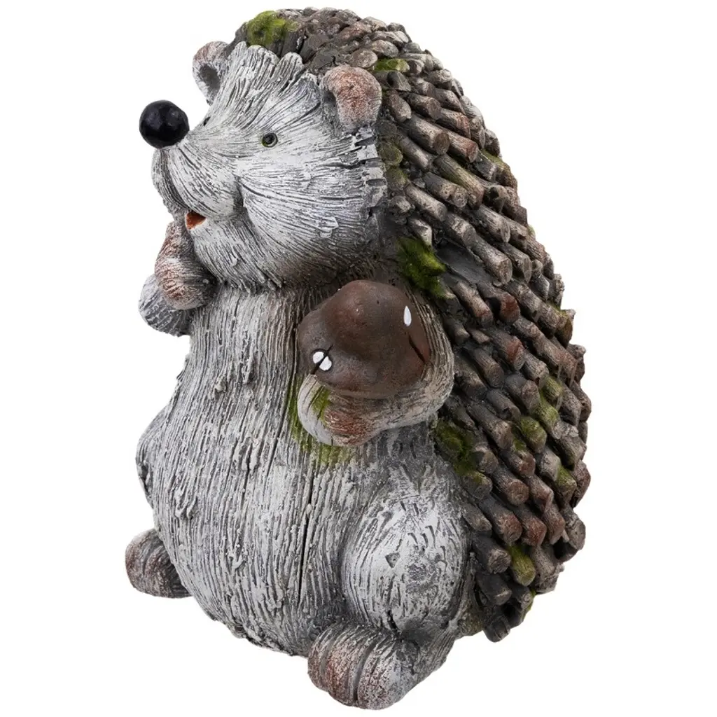 Add a touch of whimsy to your outdoor garden with this charming hedgehog statue. Crafted with intricate detailing, this statue features hues of gray, white, brown, yellow, and green, mimicking the natural tones of carved wood. The adorable hedgehog holds a mushroom, adding a playful accent to any garden or patio space. Product Features: Owl outdoor garden statue Color hues of gray, white, brown, yellow and green Accented with a mushroom Intricate details for a realistic look Recommended for indoor or outdoor use Dimensions: 7.5"H x 8.5"W x 8.5"D Material(s): ceramic