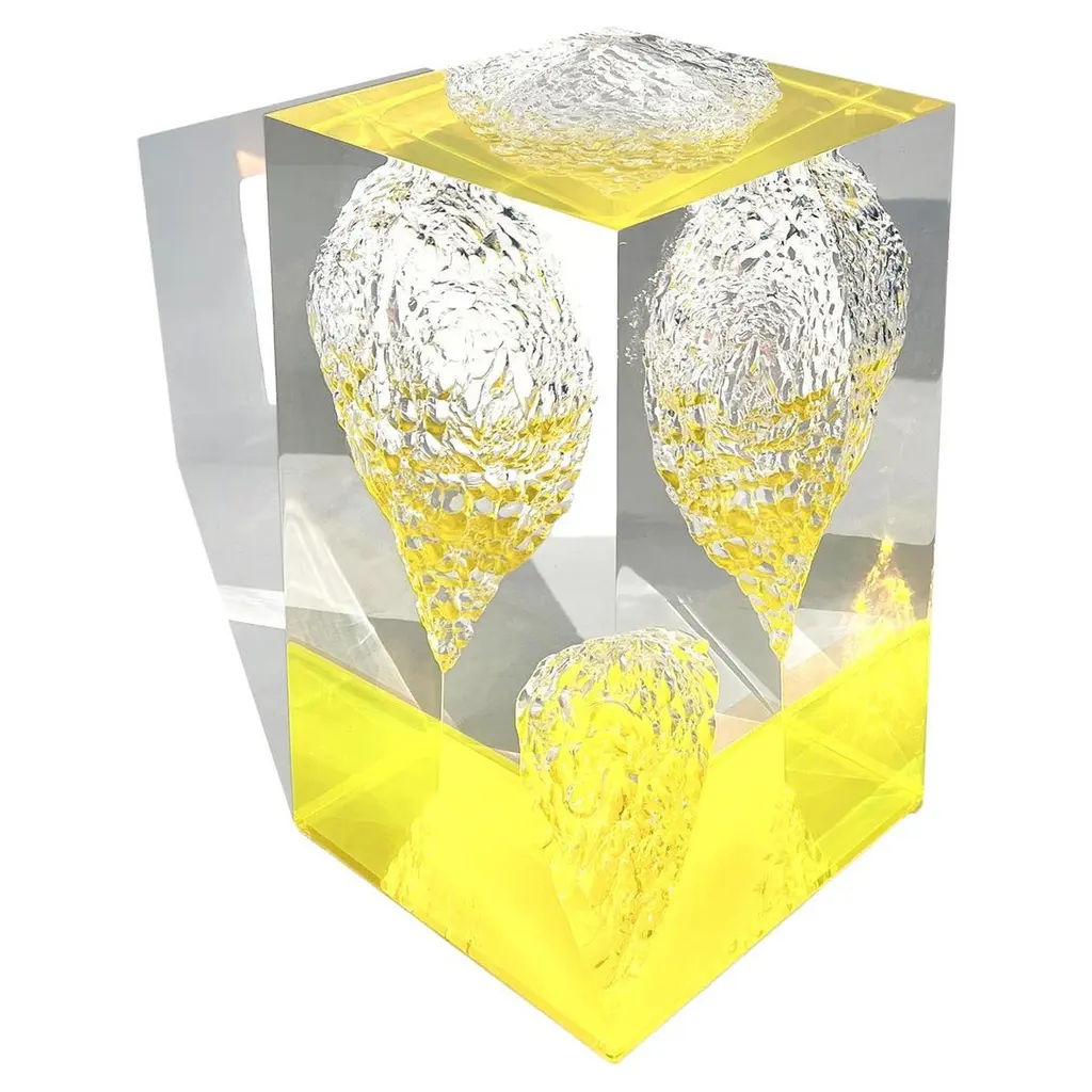 A nod to rock crystal, the Nova White Objects Set includes two balls sitting atop rectangular bases both the orbs and the supports made of clear composite swirling with white. The billowing effect, which mimics milk that has been poured into water and frozen in time, gives the decorative sculptures a sense of movement. Though these will be unobtrusive decorative objects given their transparency, they will effervesce when light strikes them. Because of the nature of the material, each sculpture will vary slightly.
