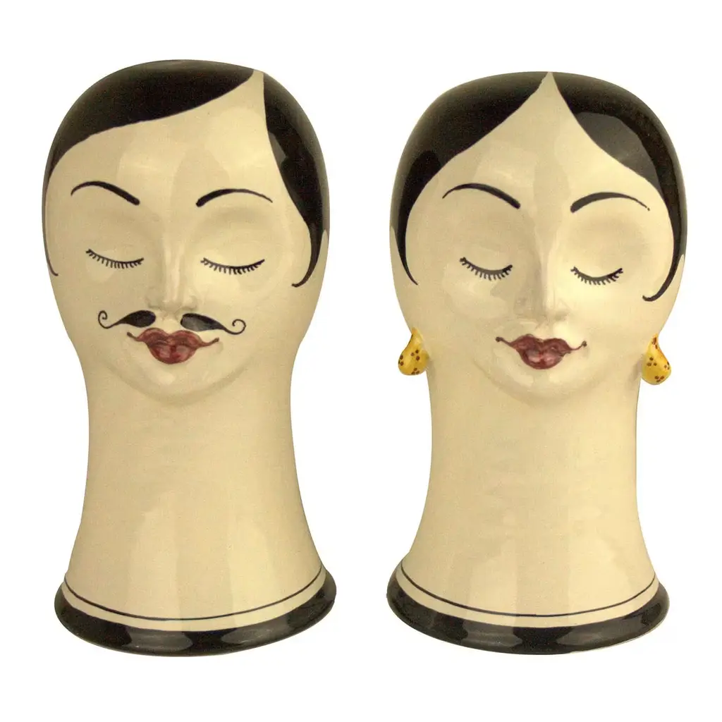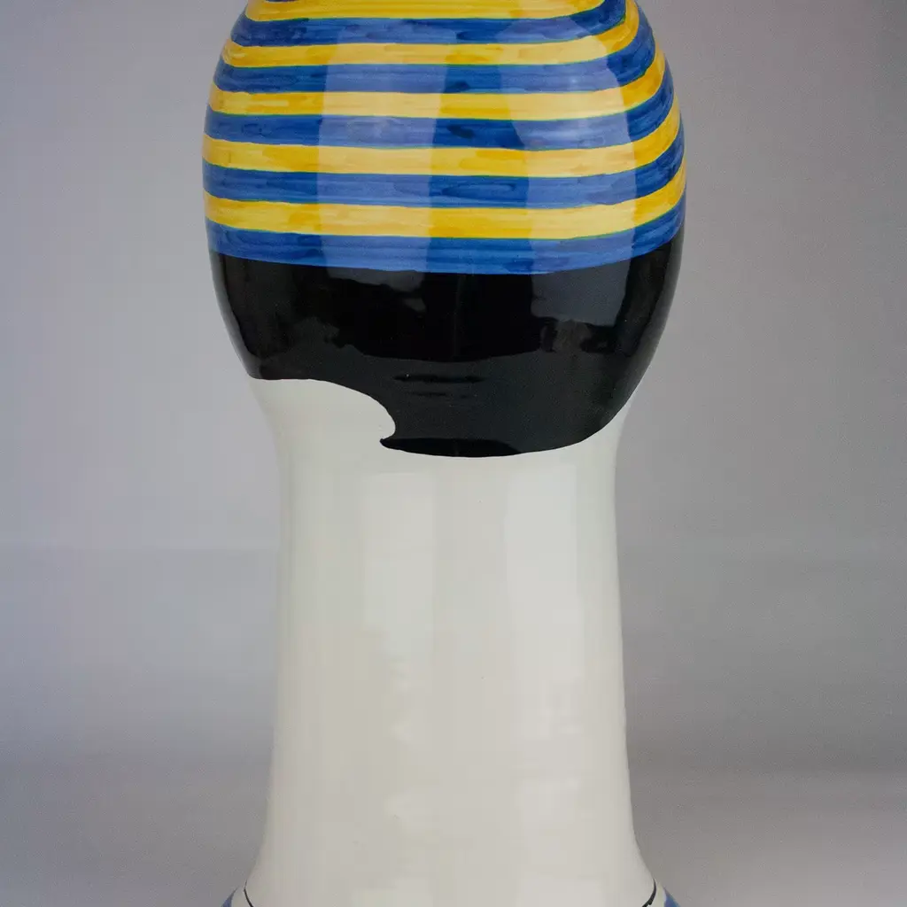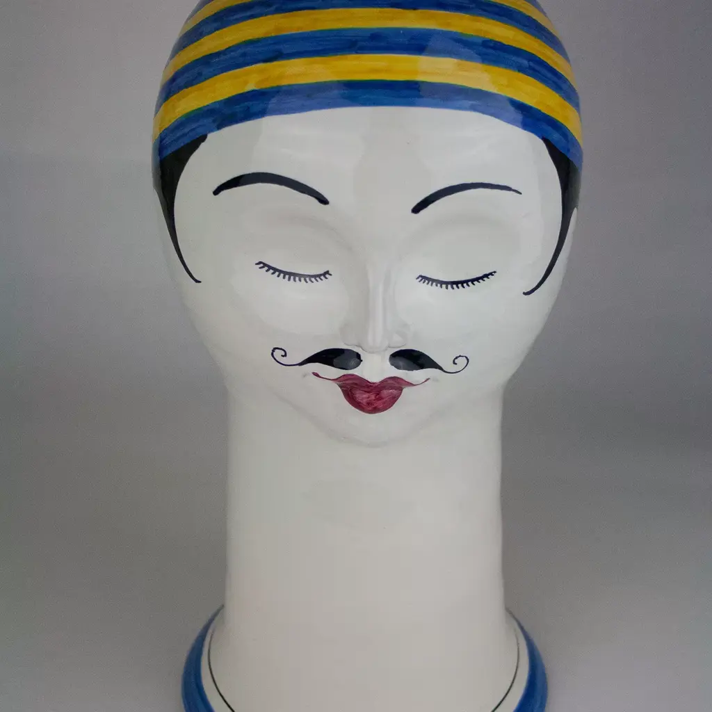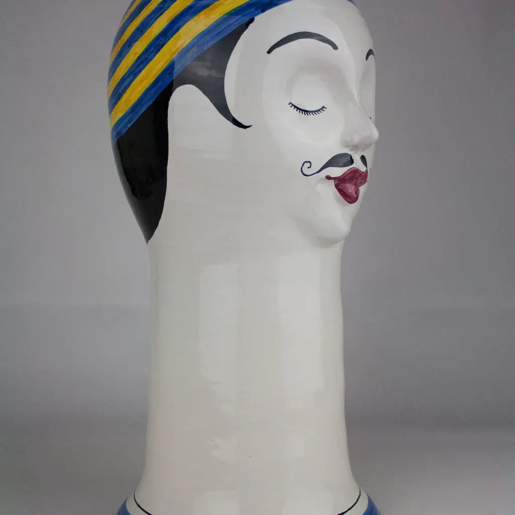 Elegantly depicting a turn-of-the-century swimmer with his polished mustache, neatly curled hair, and cap, this ceramic sculpture was made on a lathe, serving as a playful and poetic addition to a modern or eclectic decor. The white of the elongated neck and the delicate features of the face are painted by hand with red for the smile, black for hair, mustache, arched eyebrows, and closed eyes, and green for the base, also occurring on the headpiece, where it alternates with yellow stripes. Delicate and sophisticated, this is a work of art to display anywhere in the house.