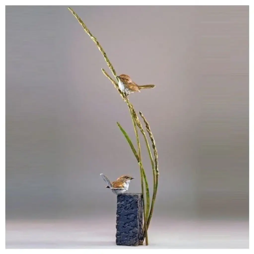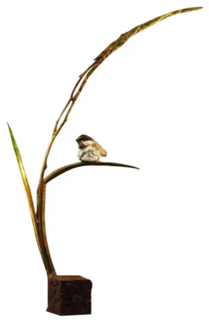 An elegant depiction of the delicate bird in its natural habitat, this Nuthatch Bird Sculpture in Bronze by Mark Hopkins is titled August Breeze. This piece portrays a peaceful gathering of nuthatches resting in late summer on a patch of tall blowing reeds. From a limited edition of only 10 pieces, the Nuthatch Bird Sculpture Bronze August Breeze represents the impeccable attention to detail and natural inspiration characteristic of celebrated artist Mark Hopkins. Internationally renowned American artist Mark Hopkins creates bronze sculptures that have thrilled collectors and casual art fans alike for more than two decades. Mark Hopkins'' unique balance of organic inspiration and singular contemporary design has been called "bronze in motion" for its fluid look, which often appears to display natural beauty in defiance of gravity. About Mark HopkinsMark Hopkins takes his inspiration for every facet of life on Earth, from the majesty of wildlife to mankind''s interaction with nature, and produces limited-edition pieces that evoke a sense of awe and respect for the mysteries and loveliness of the world around us. Collectors of his work include Barbara Mandrell, Clint Eastwood, Bill Clinton, Colin Powell, George and Barbara Bush and a host of other luminaries and corporations including the National League Association of Baseball Club Owners, the Atlanta National Golf Club, Humana, Coca-Cola and others. Each Mark Hopkins sculpture is crafted with pride in the USA. Captivated by form and design, Mark has personally created a signature style of vibrant vitality resulting from decades of study. Encouraged by parents and teachers from an early age, Mark''s unique talent developed alongside his technical skills of sculpting and casting. As an artist, Mark is constantly challenging himself to render the rich beauty of life and the deep emotion of the human soul into flowing sculptural form, noting "I strive to express beyond the image, to catch spirit, to reveal deeper emotions, and to share joy. "About the Production ProcessFrom the artist''s hand to the final polishing stages, many intricate steps go into the creation of a limited edition bronze sculpture. First the reproduction mold is made in which layers of silicone rubber and plaster are delicately applied to the original work. Then hot wax is poured into the reproduction mold to form an exact replica of the original sculpture. When the wax replica is removed from the mold, it is then inspected and refined or "chased" by hand to remove any imperfections that may have occurred in the reproduction process. Next, ceramic cup and wax sprues, or gates, are added which later will help channel the molten bronze into the shell to create the sculpture. The next step is creating the ceramic shell by alternately dipping the wax replica over a period of several days into a vat of liquid slurry, then a vat of silica crystals. The shell is then set to dry, and the process repeats until the shell has reached the appropriate thickness and strength. The finished shell is placed in a high temperature oven that melts and removes the wax (the traditional "lost wax" method). The hardened or "fired" shell is secured, so the molten bronze can now be poured into the wax impression.
