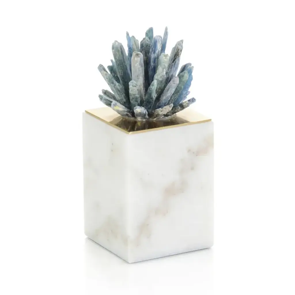 A celebration of the ocean’s natural beauty, the Ocean Floor Sculpture on Crystal Base features a rugged blue stone that nests within a bed of brass in a nickel finish. A small conch shell rests gently on top of the stone, with a large block of clear acrylic introducing transparent hues and smooth lines to the organically shaped piece.