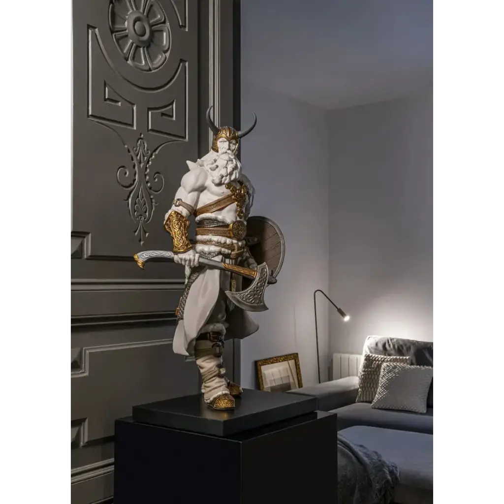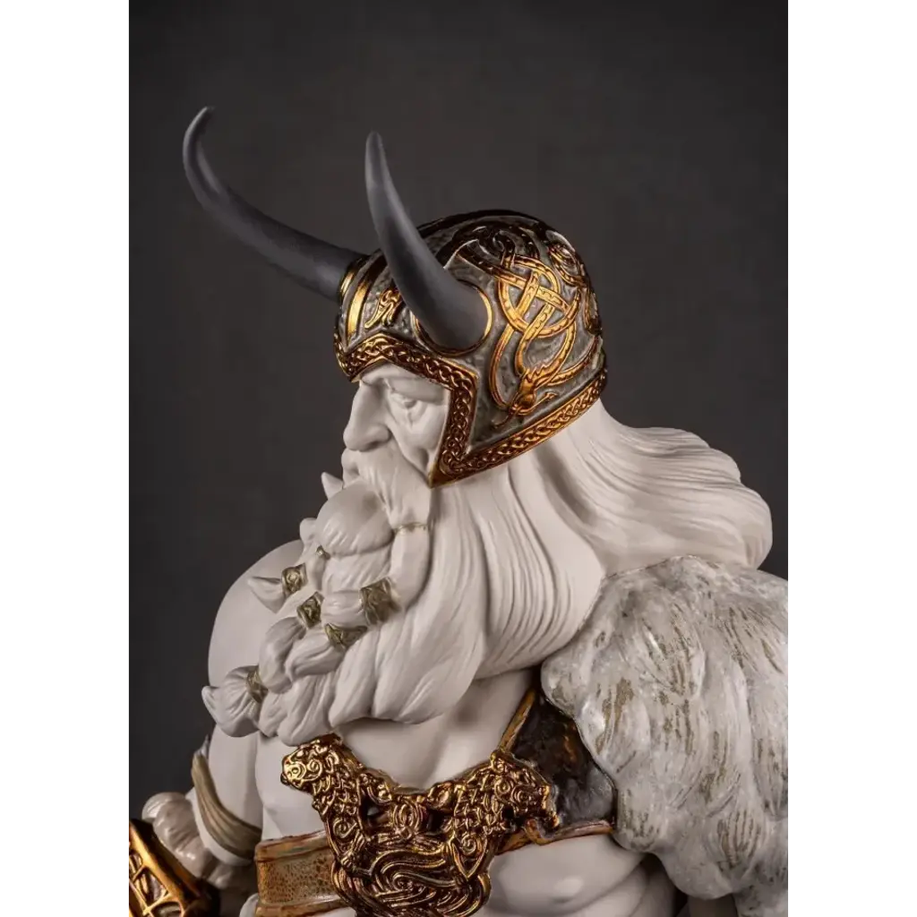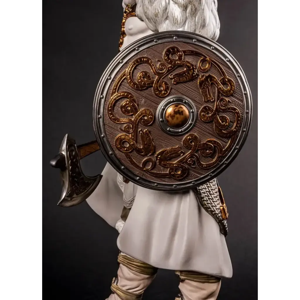 Odin is the god of war, wisdom and knowledge. From his palace in Asgard, he rules over gods and men, guiding brave warriors who have fallen in battle to Valhalla, where they are honored for their courage and prepared for Ragnarök, the final battle. This matte white porcelain sculpture captures the essence of Odin, the majestic king of the gods in Norse mythology, ready to fight against the forces of chaos that threaten the world. Every detail of this piece has been meticulously crafted. From the modelling of the anatomy to the ornamentation and the application of metallic lusters, this creation conveys a heightened realism, exemplifying consummate control over sculptural and decorative techniques in porcelain. A particular mention is deserved for the expressive detail of Odin’s face, marked by a scar over his left eye, a symbol of the sacrifice he made at Mimir’s Well to gain infinite wisdom. In this sculpture, Odin is depicted with his impressive arsenal of weapons, ornamented with ochre, gold and silver lusters: a helmet with long horns, a battle axe and a shield engraved with four dragons. The matte white porcelain accentuates the contrast between the imposing presence of this mythical figure and the delicate wealth of its finishes. An iconic Spanish brand, Lladro is a world leader in the creation of porcelain art. Started by brothers Juan, Jose and Vicente Lladro in 1953, the ceramic figurines were initially inspired by the works of great European manufacturers like Meissen and Sevres. Over time, a unique style was forged, consisting of elongated lines, a revolutionary single-firing method, and soft pastel tones.