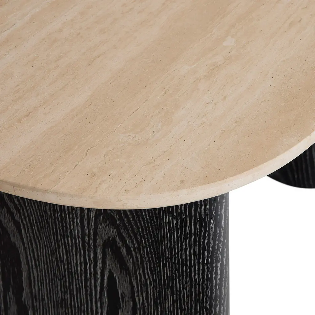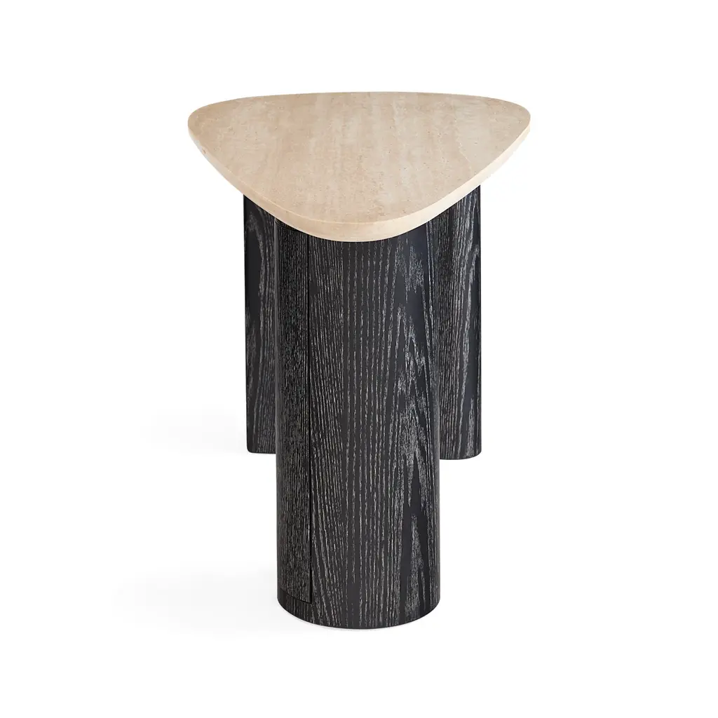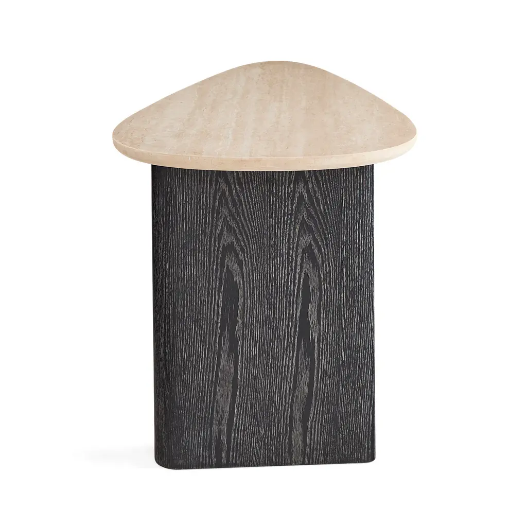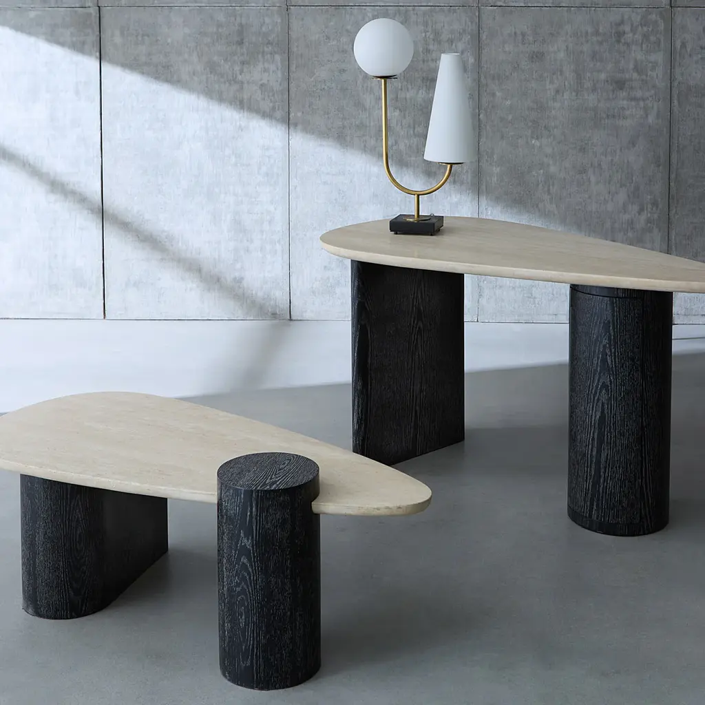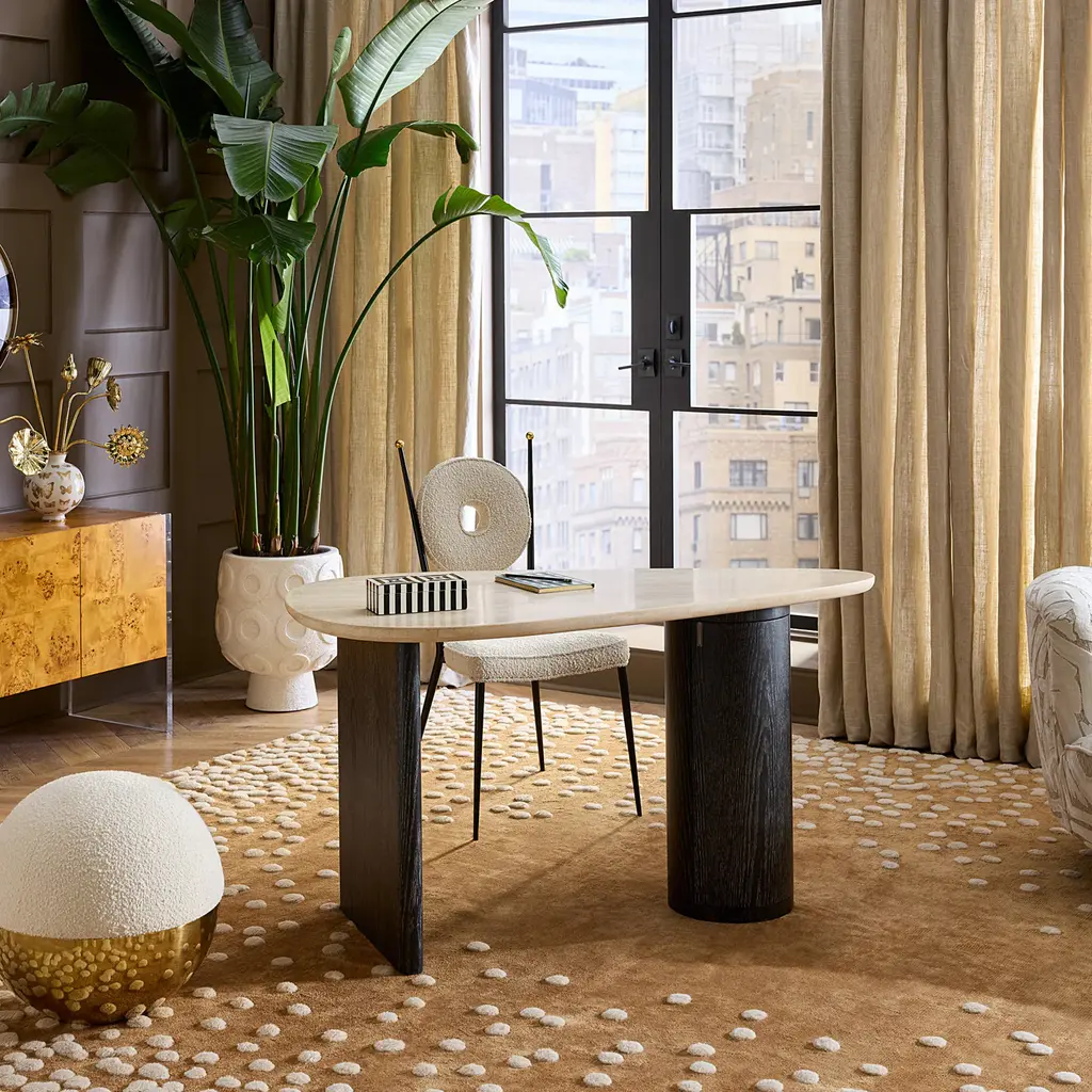 Warm Modernism. Featuring a familiar midcentury inspired shape to its top, our Oeuf desk is crafted from luxe travertine perched on asymmetrical ebonized oak supports with a wire-brushed finish. Its barrel leg opens to reveal interior storage. Perfect in a dude’s den or stylish study, tuck it into any room for a chic workspace that doubles as abstract sculpture. Travertine, with its signature natural tones, is the stone du jour —warm, full of character, and with just the right amount of je ne sais quoi . Each tabletop is sealed, waxed, and polished for a hardworking finish that’s timelessly today and fabulously forever.