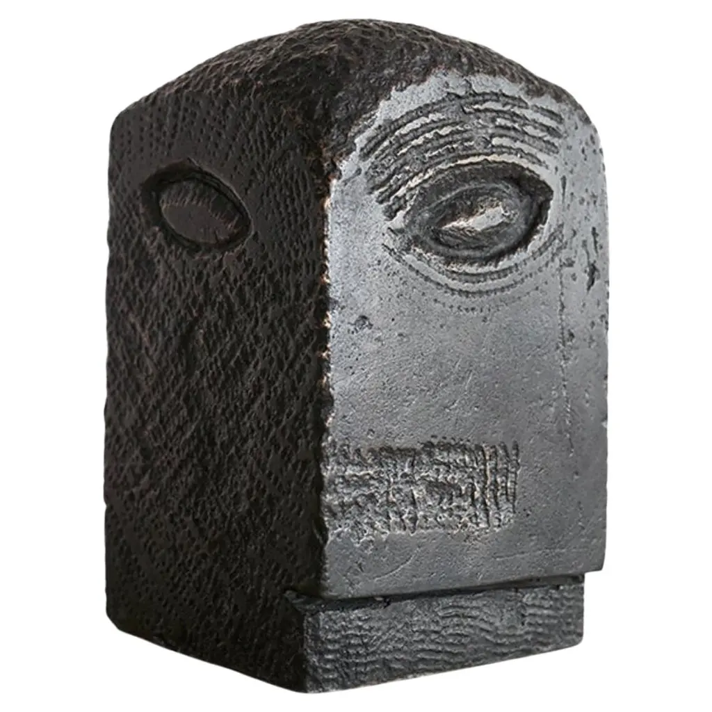 An arrestingly modern interpretation of a bust style artwork gives this face focused sculpture an unusual bearing. Old world finished iron plumbs the depths of shadows and light to highlight intriguing elements.