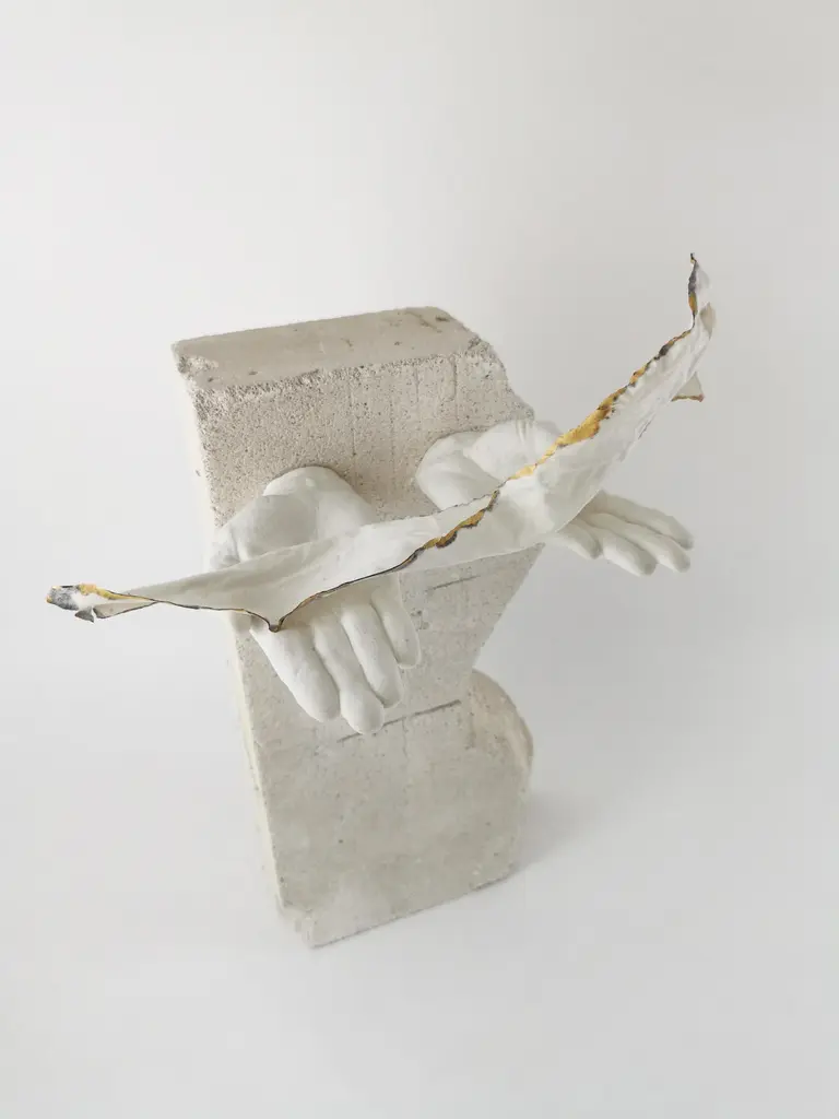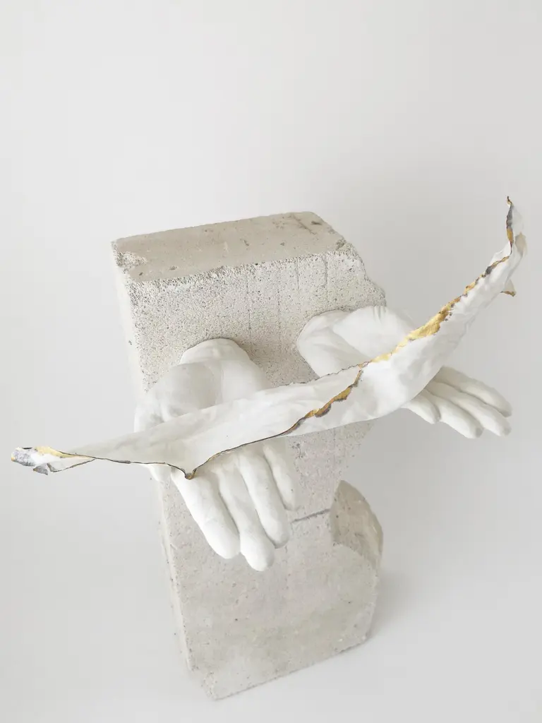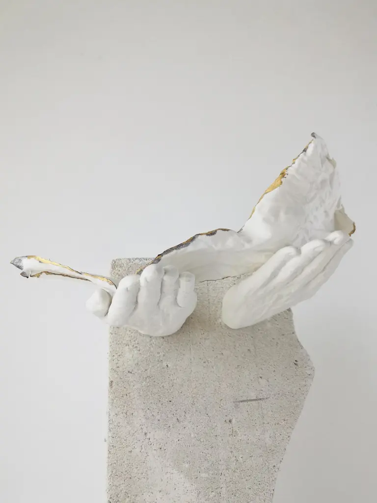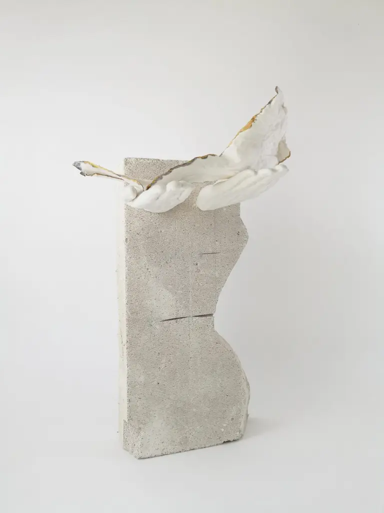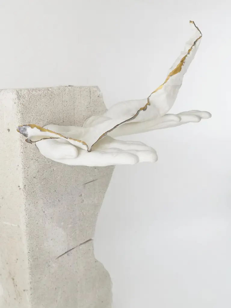 Offering II Sculpture by Dora StanczelOne of a Kind.Dimensions: D 15 x W 50 x H 37 cm.Materials: Porcelain, metal, support tufa and gold.I create bespoke and luxurious porcelain pieces with a careful aesthetic. Beyond the technical mastery of casting, what interests me is the unexpectedimperfection that occurs during the creative process. I like to make it a focal point of my pieces. For me, the intelligence of the hand lies in the collaboration with the material and not in its control.My pieces are the fruit of long experiments where technical processes arediverted. I obtain the harmony of forms by constantly seeking the limit of the material of the porcelain.I tear, fold, deform, glue, drip porcelain in a specific way that reveals the fragility and strength of the material. Indeed, a piece gains its strength through its final firing where the previously fragile material will finally be revealed. The beauty is in this transformation by the fire!My unique and stunning artworks are influenced by waves, curves and colors that I see when I go out on the ocean on my boat. This natural force and ecosystem essential to life is my source of inspiration.I consciously develop a vocabulary of forms based on the errors and theunexpected of this process. To obtain a unique piece, I divert the technicalprocess of porcelain.