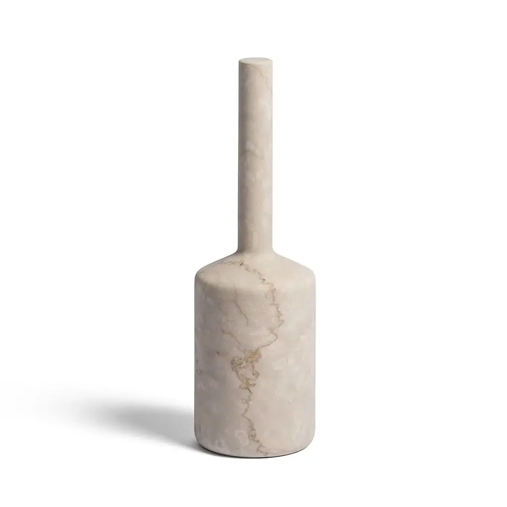 Inspired by the simple forms and lines in Giorgio Morandi's impressionist still life paintings, this unique sculptural work will add understated, timeless elegance to any decor. Crafted out of a beige Botticino marble with red veining and specs of white crystal, the distinctive silhouette features a round cylindrical base and sharply tapered, fluted neck and mouth. The delicate, sinuous veining elegantly contrasts with the clear geometrical silhouette. Designed by artist Elisa Ossino exclusively for Salvatori.