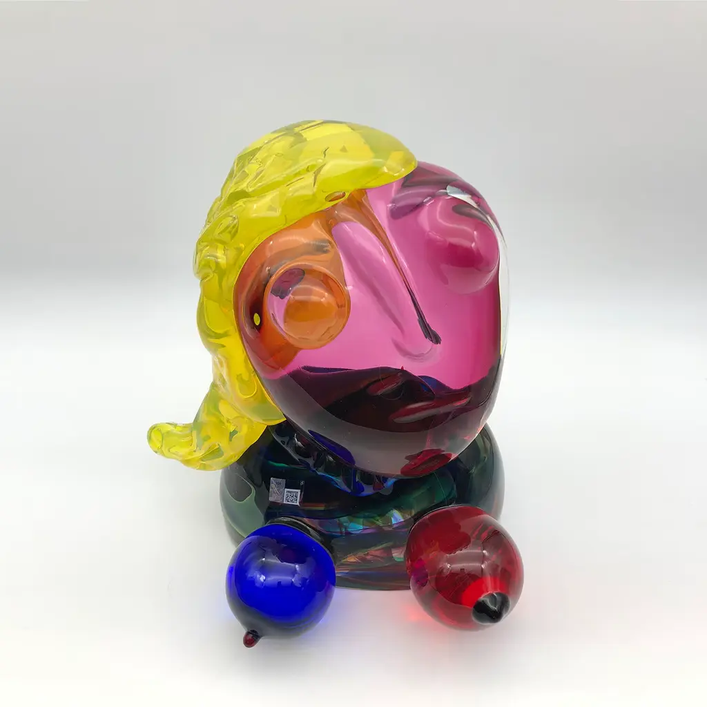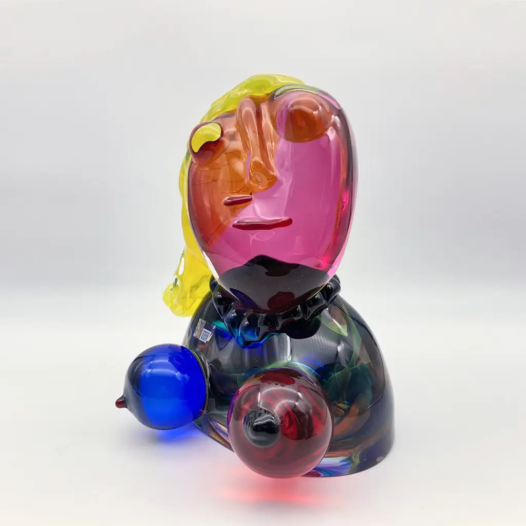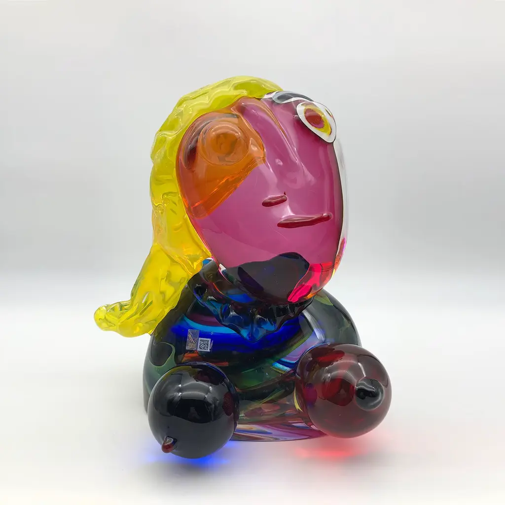 A tribute to visionary Spanish artist Pablo Picasso by master glassmaker Toso Cristiano, this stunning sculpture exudes a colorful charm of Cubist inspiration. Entirely handcrafted of solid glass, it depicts a female figure with blonde hair and a nostalgic or serious look. Stunning in its complexity and color, this piece will be a refined statement piece for a contemporary interior.