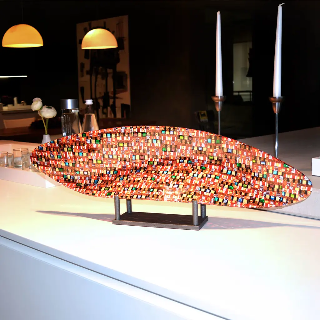 This stunning decorative sculpture crafted of hand-blown Murano glass is made with hundreds of small multicolored mosaic tiles. The sinuous shape makes it a versatile decor piece suitable for any environment, serving as both a standout centerpiece and an elegant accent. Venetian red, light green, aquamarine, black, ivory, and gold and silver leaf elements come together in a harmonious balance of shapes and colors. Each piece is meticulously crafted by Venetian glass masters.