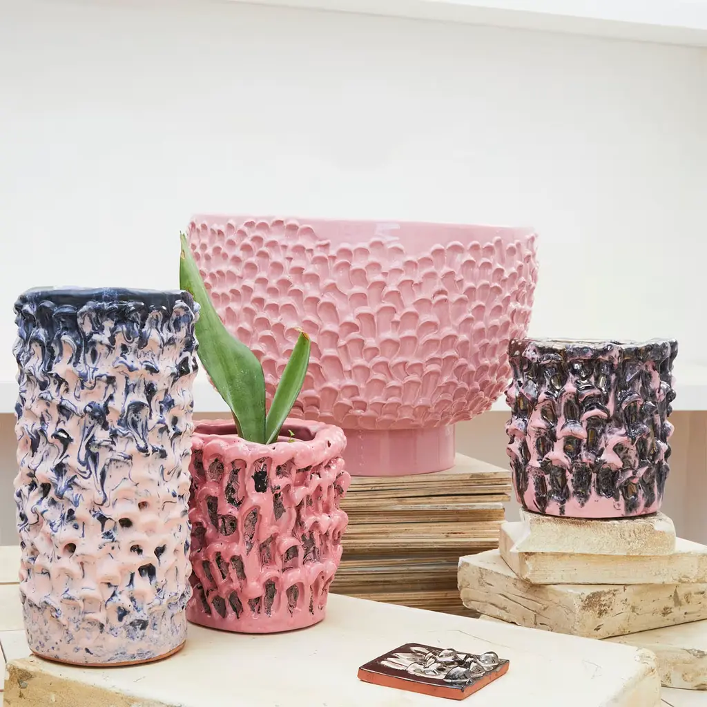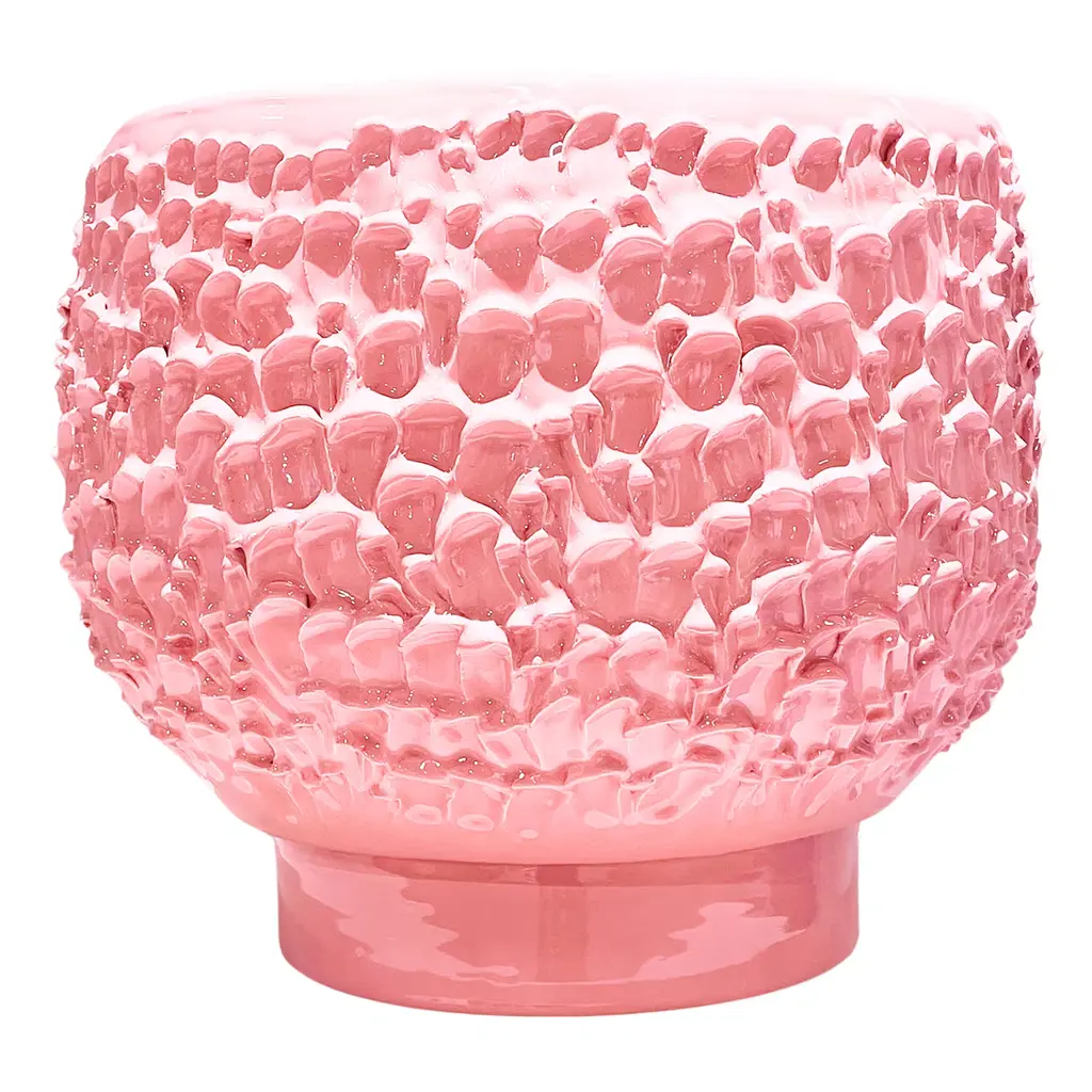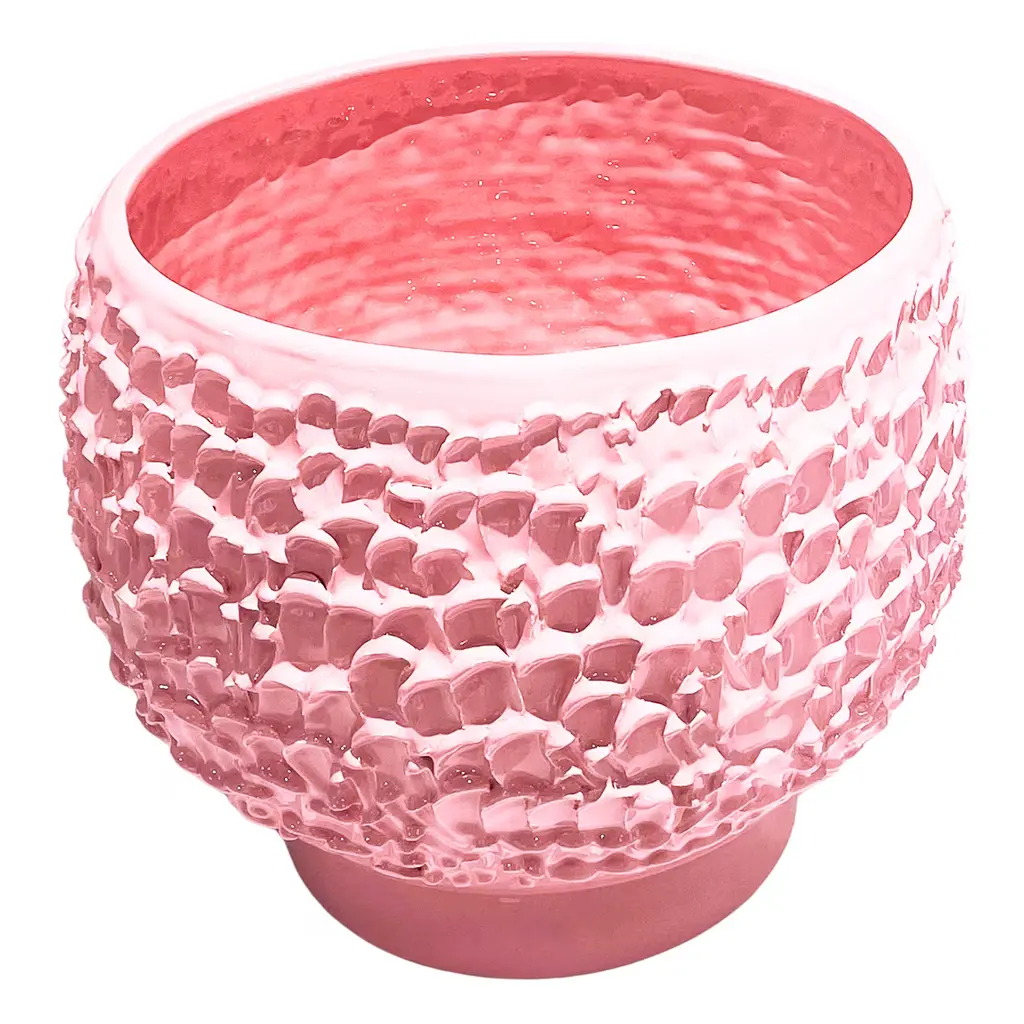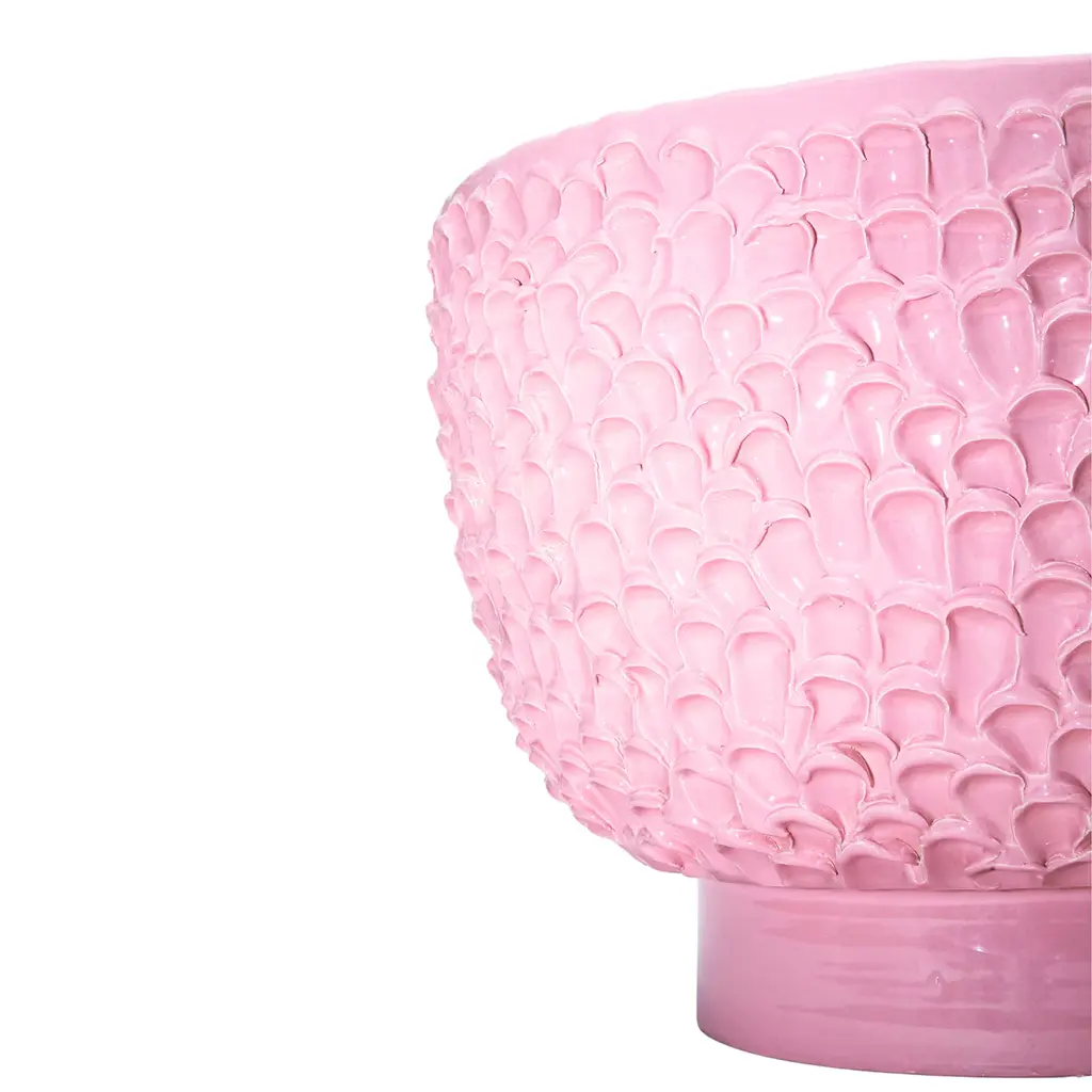 This handcrafted ceramic centerpiece combines decorative beauty with functionality, featuring a luminous pink hue and wave-like texture that evokes serene movement. Made in Daria Dazzan's Milan studio, it reflects her evolving artistry, blending design, ceramics, textiles, and sculpture. Each piece is uniquely shaped on the wheel, with subtle variations in color and form that enhance its distinctive character, making it a standout addition to any space.