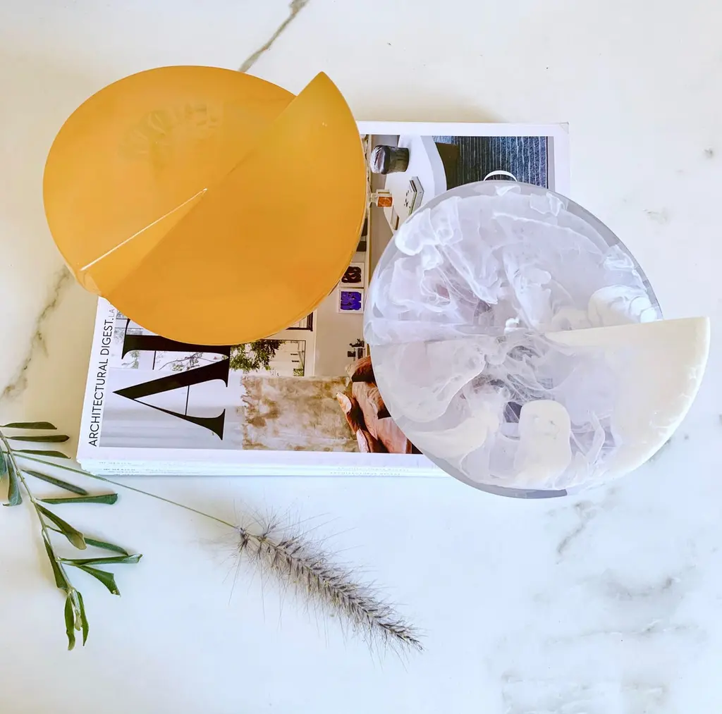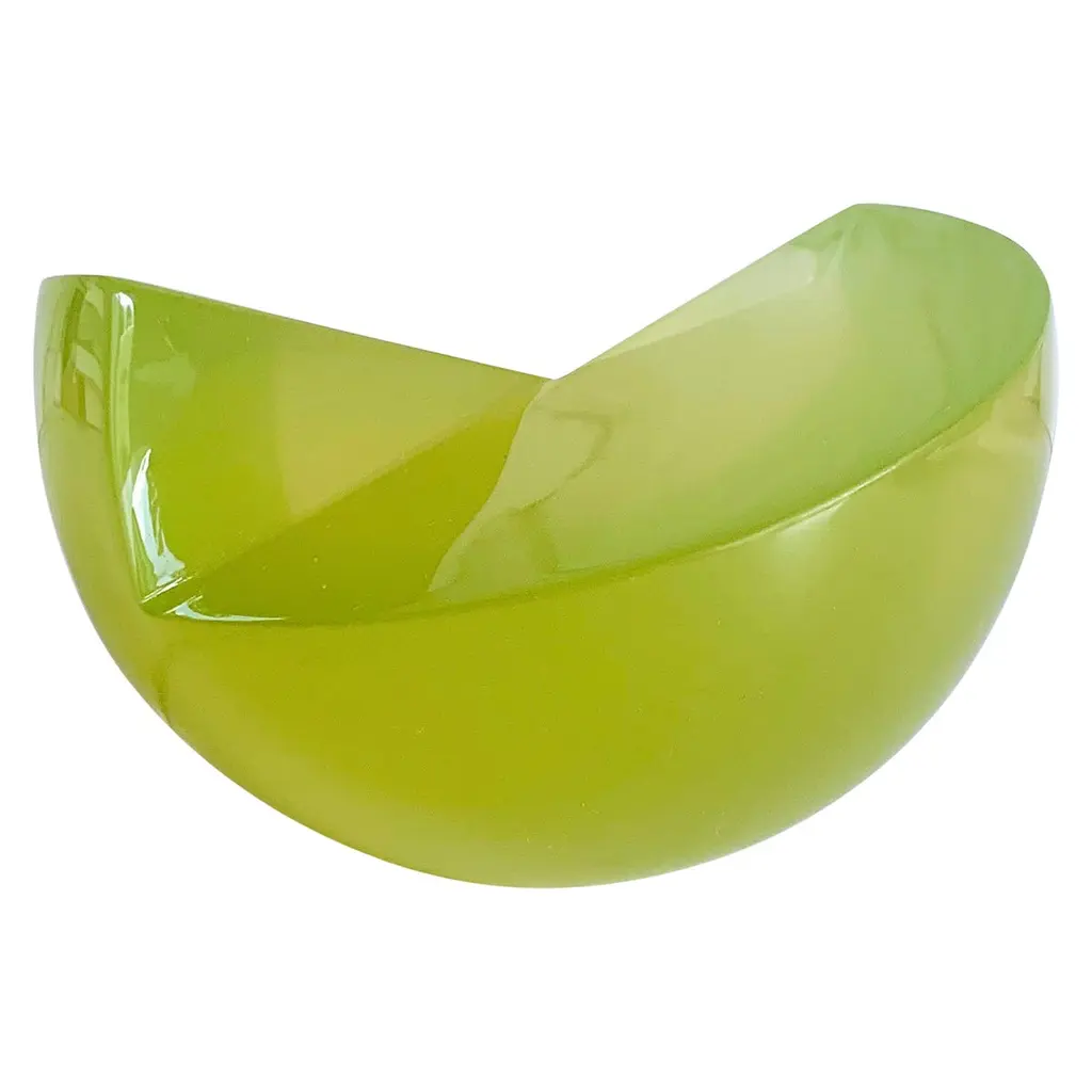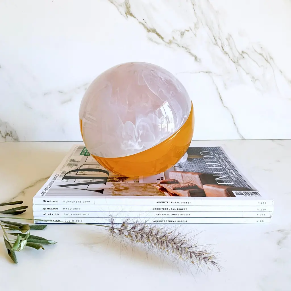 This Geometric sculpture is handmade in polished resin in a variety of colors. It is a modern and colorful piece that will liven up any space.Our Semi Sphere is a very cool and fun piece! It can be transformed into a complete sphere when you place another piece on top, creating a totally different sculpture. It looks beautiful on a stack of books on a shelf or on a coffee table. The possibilities are endless!Designed by Paola Valle and manufactured in Mexico City by extraordinary artisans. Our goal is to work hand by hand to create outstanding pieces that will represent our passion.Please avoid placing your resin pieces in direct sunlight to avoid discoloration. All resin items are strong and durable but should be treated with care as they can break if dropped or knocked against a hard surface. Colors may vary slightly to the item shown in previous photos, as everything is handmade.