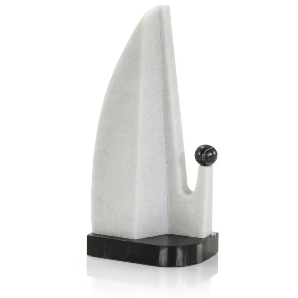 The Orbito Sculpture is a folded, gracefully arched form crafted of shimmering stone, presented on a distinctively shaped black marble base with a matching spherical accent. This piece boasts a soft, modern design suitable for transitional and modern interiors.