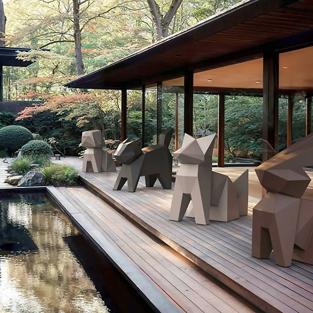 The Origami Neko Outdoor Statue from Vondom distills feline grace into pure geometric expression. Standing alert, this cat figure appears ready to prowl through your garden with its angular body and pointed ears, creating an immediately recognizable outline. The matt polyethylene material transforms traditional paper art into lasting outdoor sculpture. As sunlight moves, shadows shift across the flat planes and sharp angles, giving this static figure an impression of potential energy. Each precisely calculated facet contributes to the overall impression without unnecessary ornamentation.