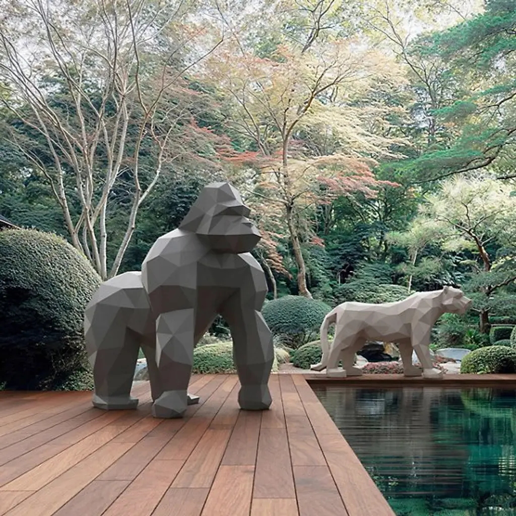 The Origami Saru Outdoor Statue from Vondom embodies raw strength through geometric abstraction. This gorilla representation stands with an imposing presence, its muscular form suggested through the strategic placement of angular planes. Made from matt polyethylene, the statue withstands outdoor conditions while maintaining its sharp-edged precision. In Japanese cultural tradition, the gorilla symbolizes courage and power, giving this garden piece meaningful depth beyond pure decoration. Every facet catches light differently as the sun moves, creating an ever-changing interplay that brings the static form to life.