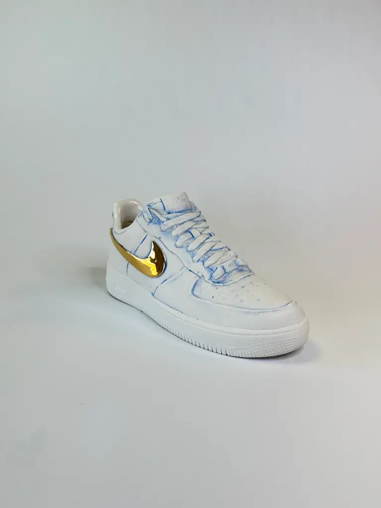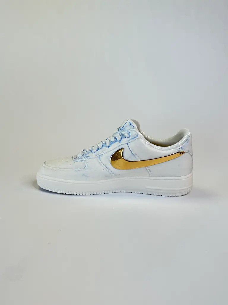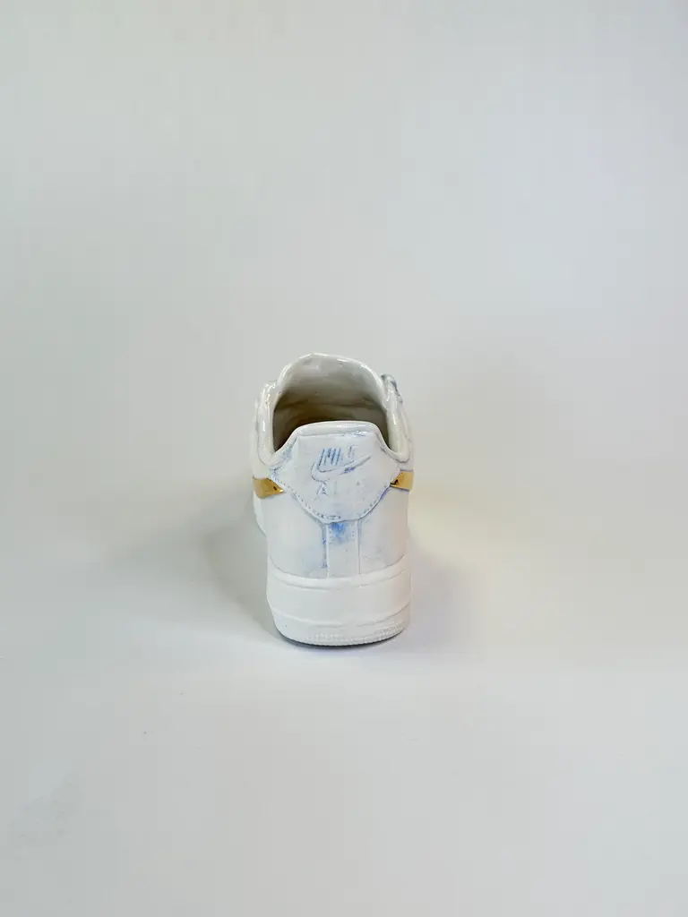 The porcelain Air Force 1 features a refined design with a subtle blue wash, highlighting its sleek profile. A striking bright gold Nike swoosh adorns the side, adding a touch of elegance to the classic silhouette. porcelain, cobalt oxide, glaze, gold luster 5" x 11" x 4" Brock DeBoer is a ceramic sculptor specializing in porcelain. He lives and works out of his studio in Joshua Tree, CA