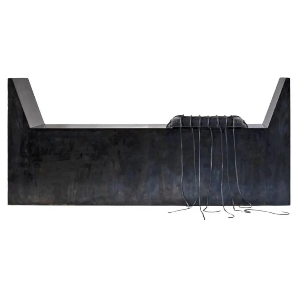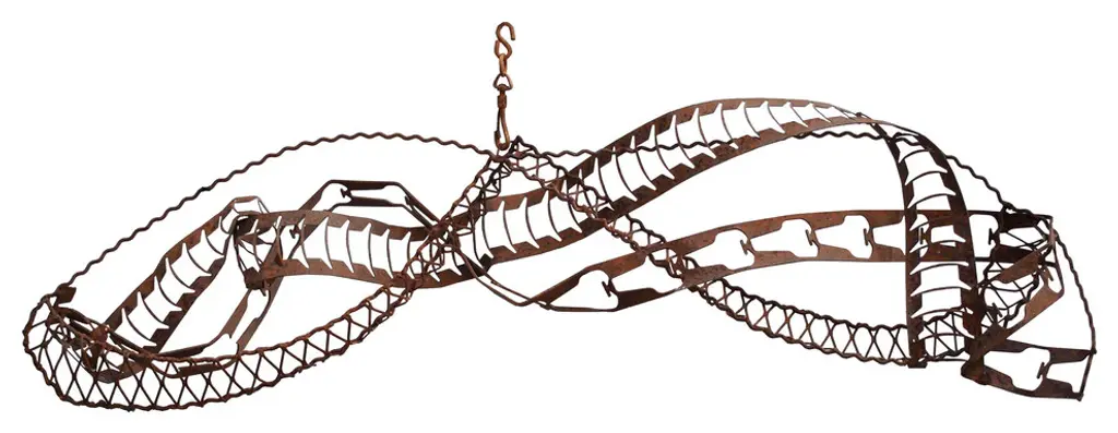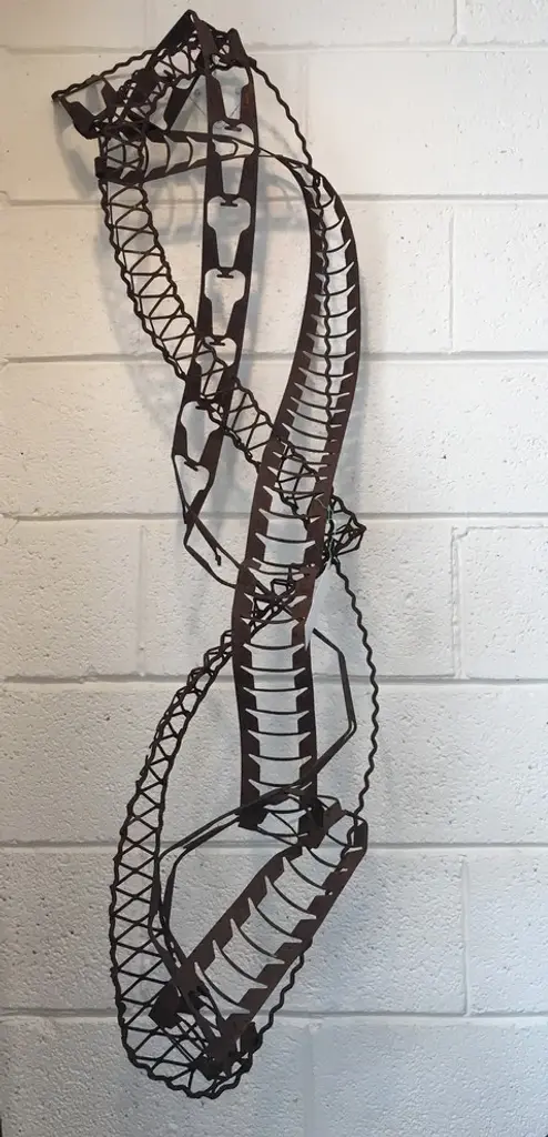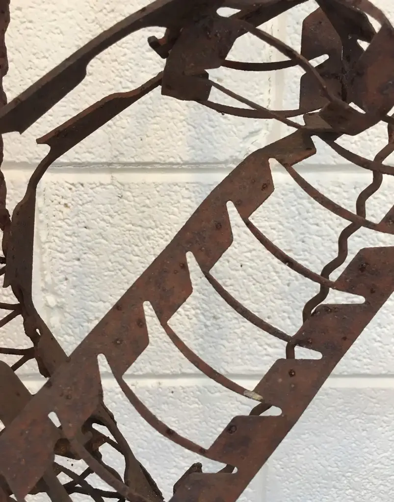 This is an original rustic metal wall sculpture titled "Chaos" by Carolyn Owen. The industrial freeform metal 3 dimensional sculpture is made from various found objects and has a naturally aged patina. This versatile piece would look great on the wall vertically, horizontally or at any angle of your liking. It could even be hung from the ceiling as an awe inspiring "œfloating"� sculpture. This beautiful, amazingly unique sculpture will surely make a statement and will be an instant conversation piece in any room. Overall Features:•Original Metal Wall Décor by Carolyn Owen•Overall approx. dimensions 50" x 12" x 5"•Weight 7.5 lbs•Vintage hook and chain included with sculpture About The ArtistCarolyn Owen was born in Guilford County, NC in 1942 and still lives and creates here. A metal sculptor, Carolyn bases her art on found objects, mostly scrap metals, wood and stone. In a modernist way her pieces are both representative and abstract. Her emphasis on the natural and spiritual emanate from her foundation as a grounds maintenance/ garden expert with a great knowledge of flora and fauna and their habitats. She enjoys working in her home surrounded by nature and the forest and the frog pond she has created. In some of her creations she has collaborated with other artist, painters or weavers with whom she finds a connection. Her pieces are in a "�natural found state"� with no polishing or enhancement to achieve patina, she is the ultimate recycle/upcycle artist. A founding member of "œArtstock"� artist studio tour, a countywide organization of local artist, Carolyn fights for artist and their cause to inform and beautify the world. Carolyn has also shown her work in the Tri-state Sculptor Shows and is a member of the Greensboro NC artist league. She is a graduate of University of North Carolina at Greensboro in Natural History, this is where she took her welding classes.