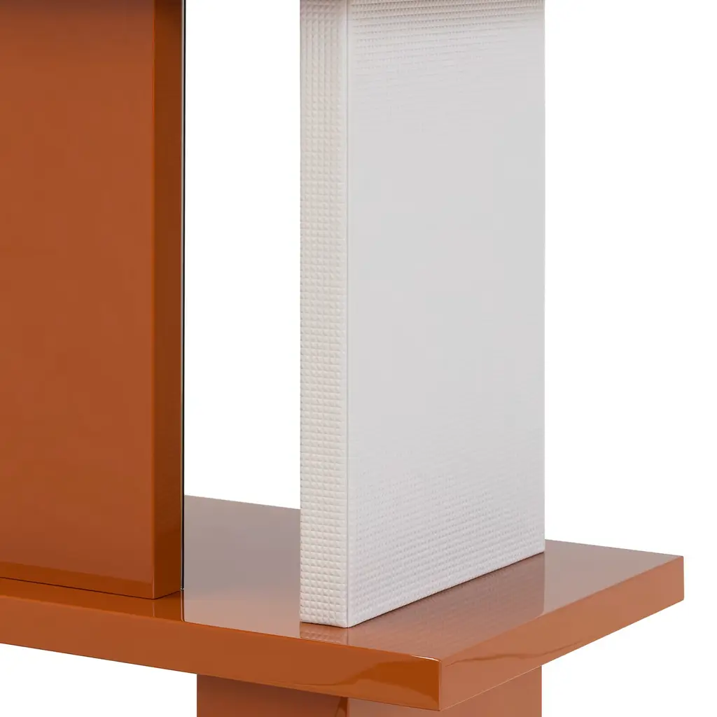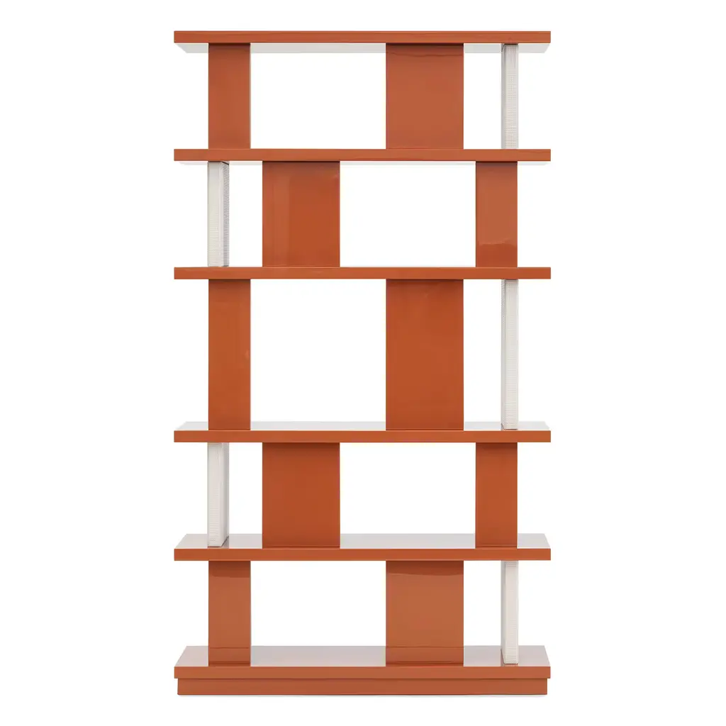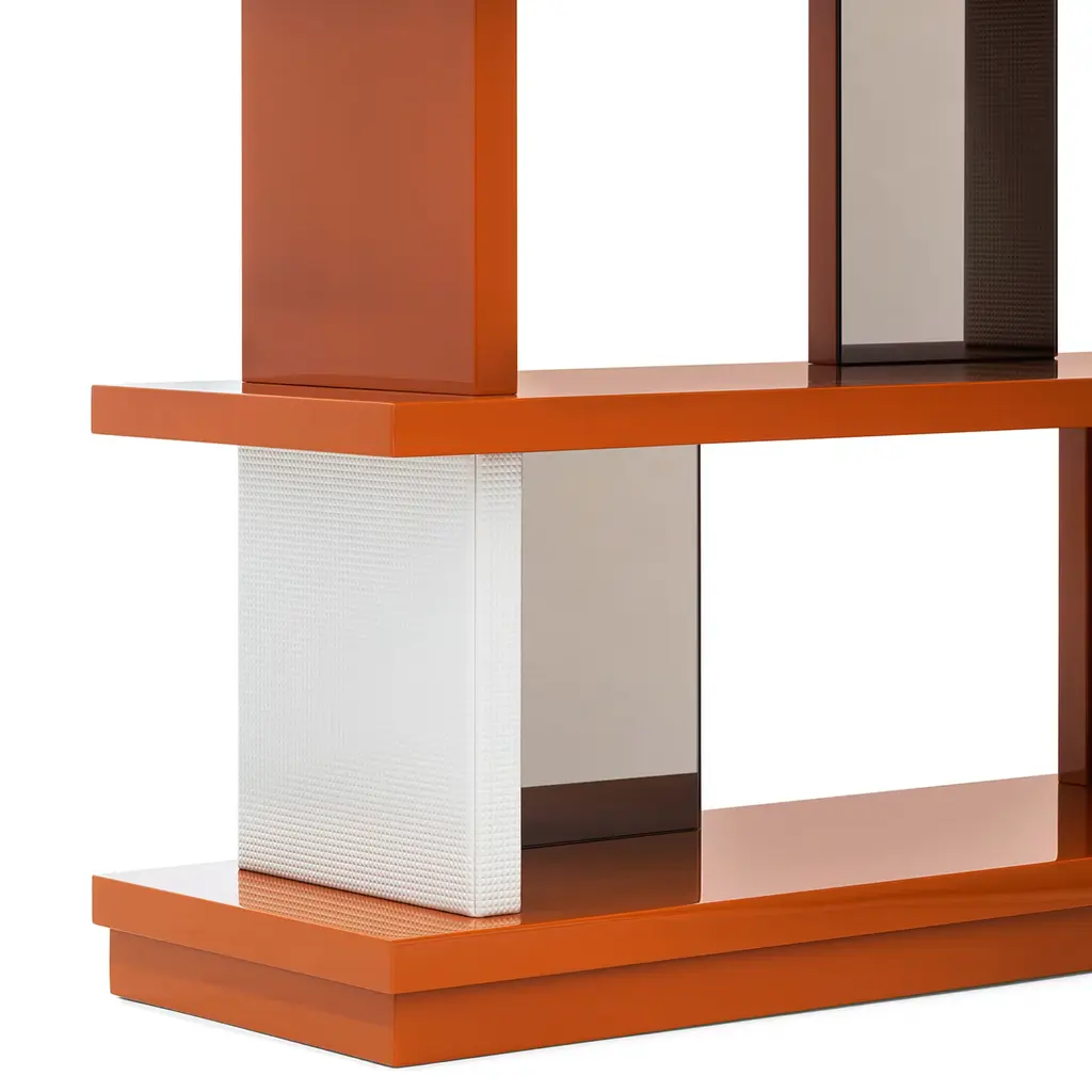 A contemporary design displaying clean and essential lines, this bookcase is crafted by merging traditional methods with innovative technology. A vertical sculpture, it features a polished coral-lacquered wooden structure with five shelves, enriched with separating cream-white-colored leather inserts and contrasting bronzed mirrors. Please ask the Concierge for further details.