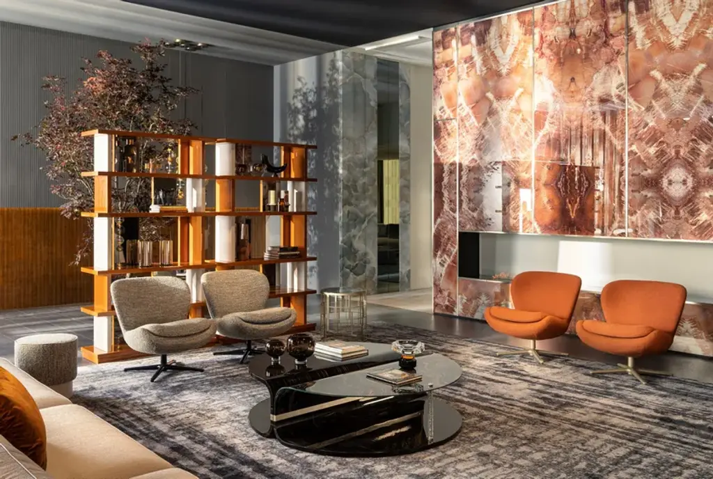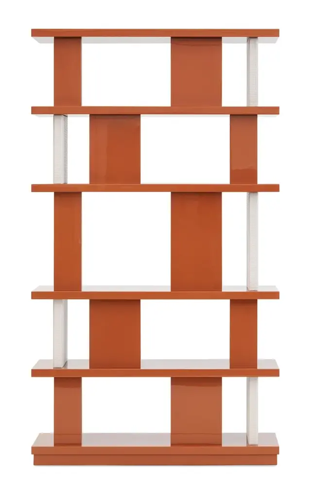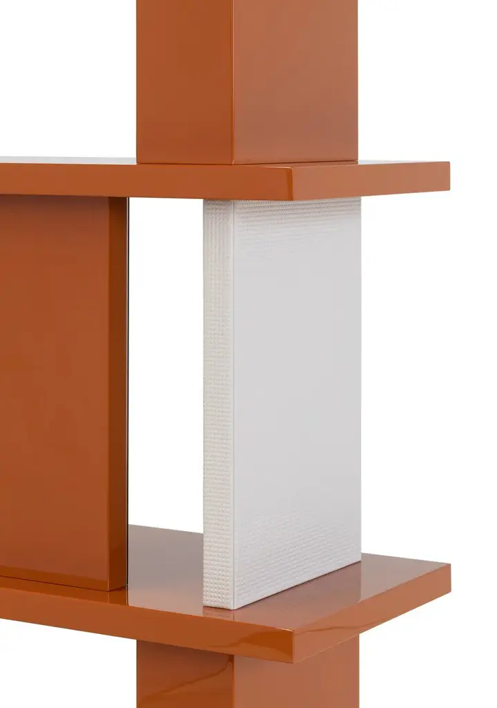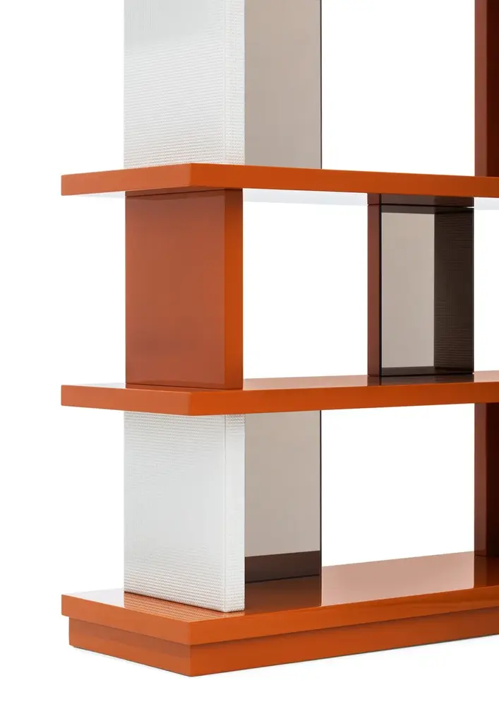 Osaka is a wooden open bookcase.Contemporary and simple lines for this bookcase in fine wood and leather, the result of modern technologies applied to traditional materials. A vertical sculpture, a play of shapes and transparencies. MaterialsTall bookcase with structure in glossy ebony, shelves in glossy ebony finish, and dividing inserts in leather and bronzed mirror.