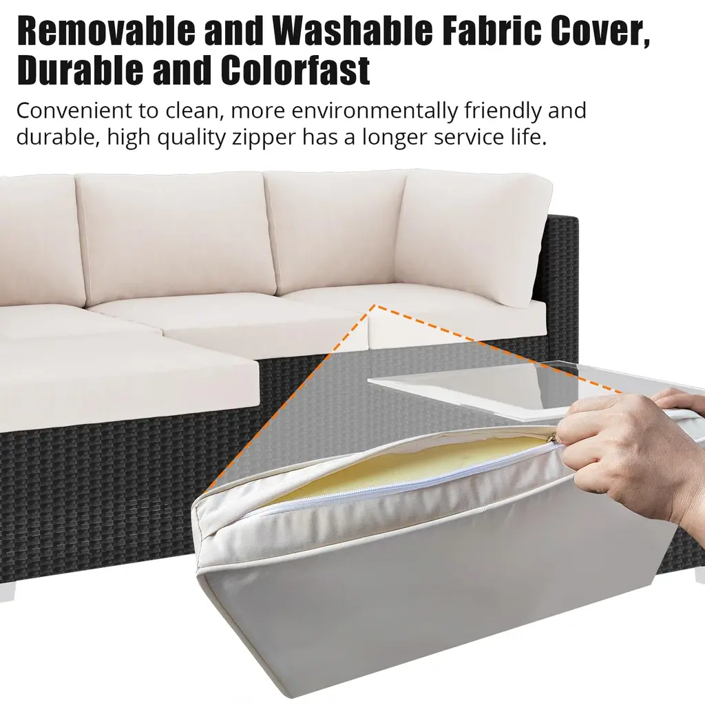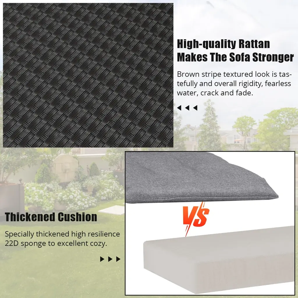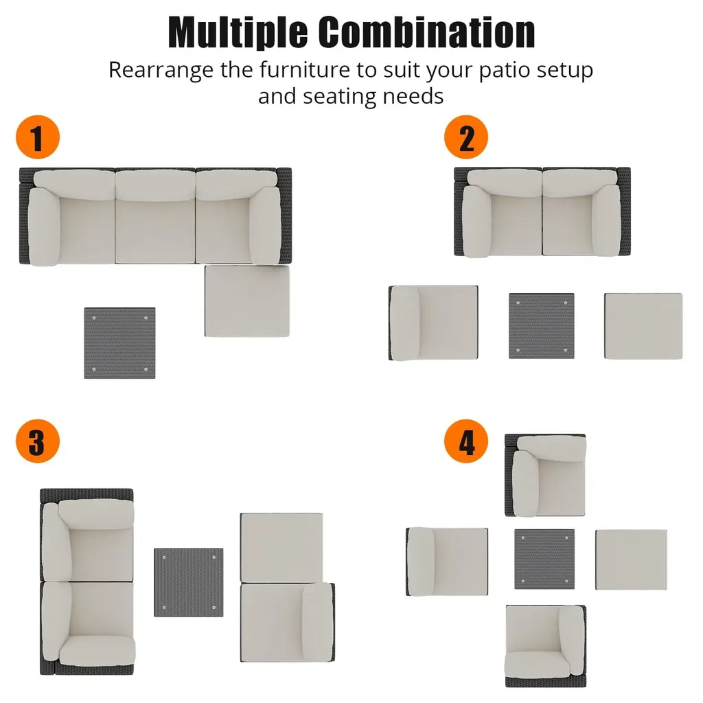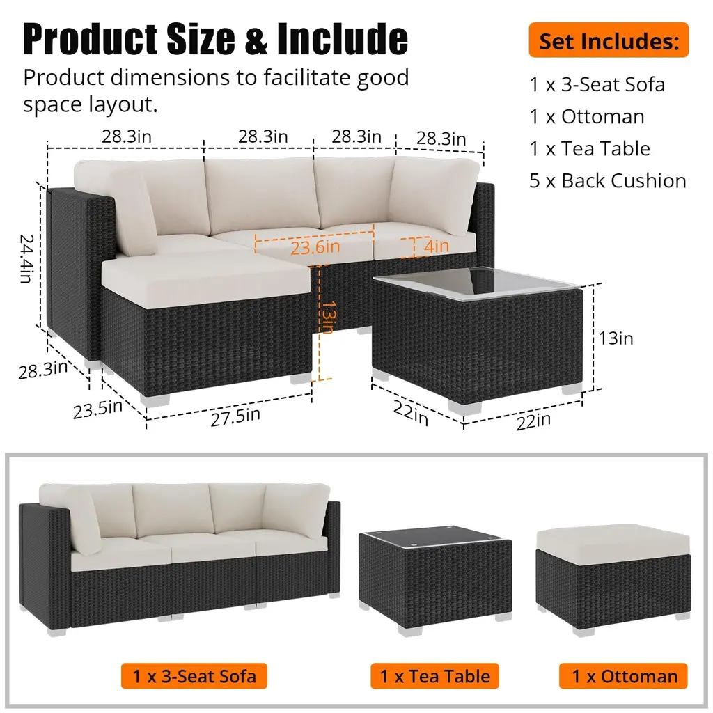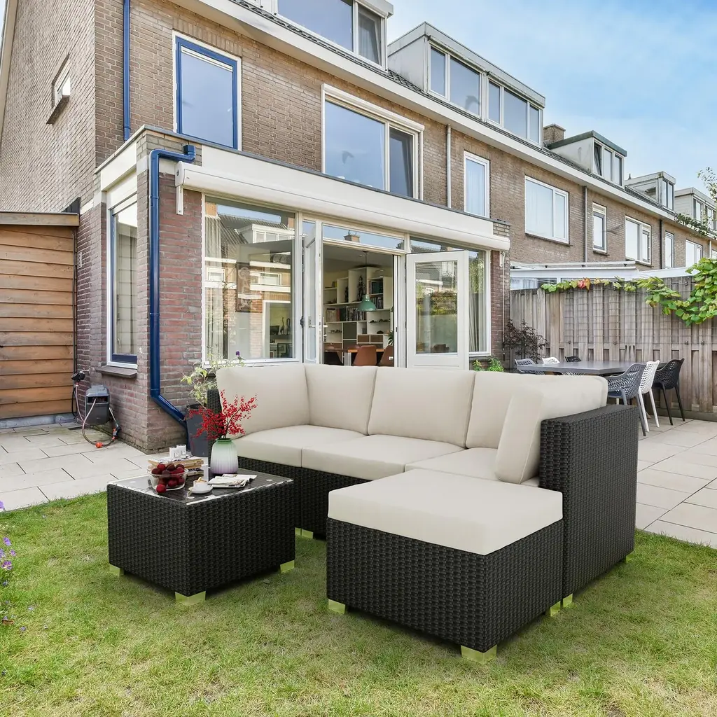 Weather-Resistant Material: Crafted from high-quality PE rattan, this outdoor patio furniture set is designed to withstand the elements, ensuring long-lasting beauty and functionality for your balcony, garden, or poolsideSturdy Iron Frame: Built with a robust iron frame, our 5-piece sectional sofa provides exceptional stability and support, making it a reliable choice for your outdoor seating needsComfortable Cushions: Enjoy relaxation with thick, plush cushions that offer superior comfort, allowing you and your guests to unwind in style during outdoor gatheringsModern Design: Featuring a sleek and contemporary aesthetic, this patio furniture set enhances any outdoor space, making it perfect for both casual and elegant settingsVersatile Outdoor Use: Ideal for various outdoor settings, this patio furniture set is perfect for entertaining guests or enjoying quiet moments alone, making it a must-have addition to your outdoor furniture collection
