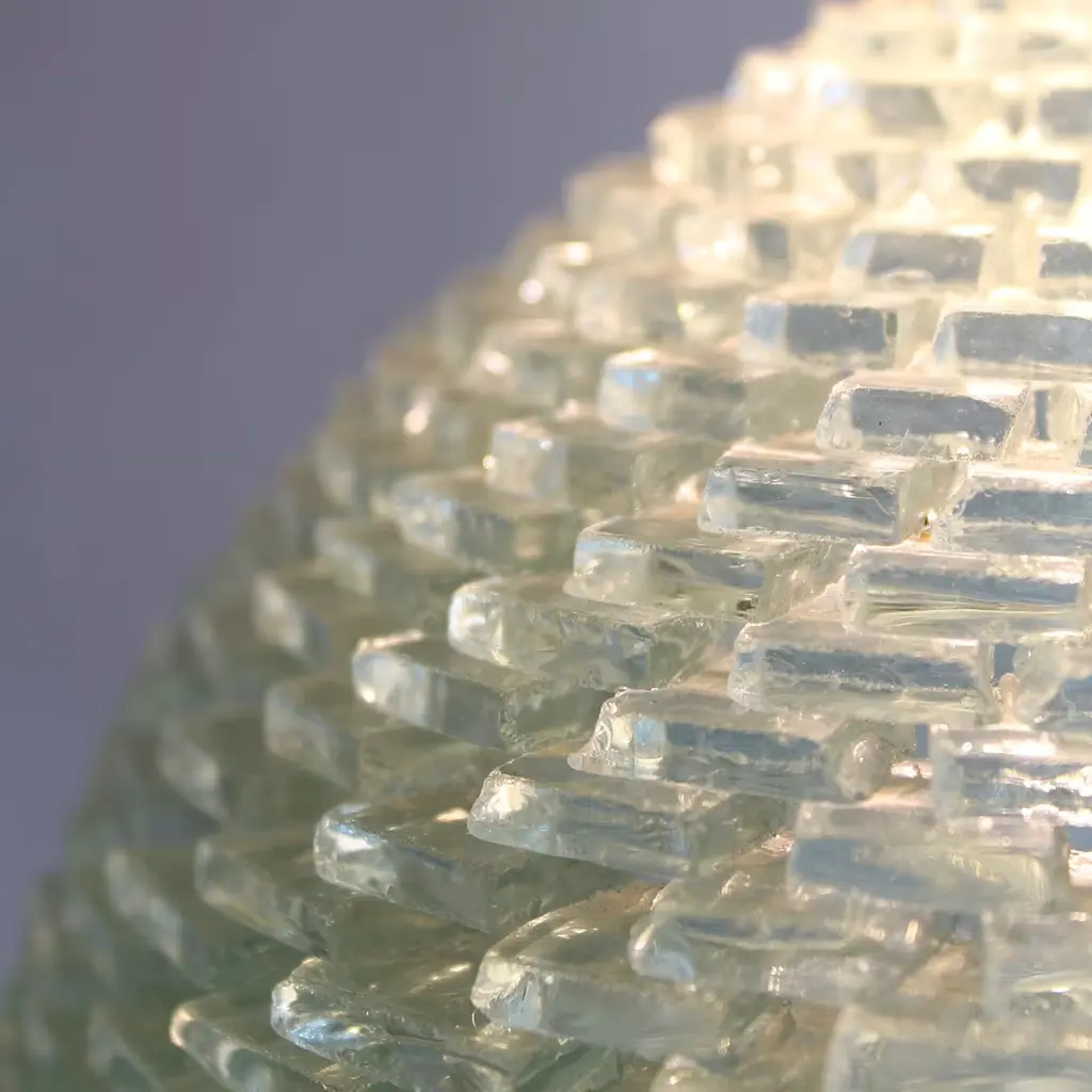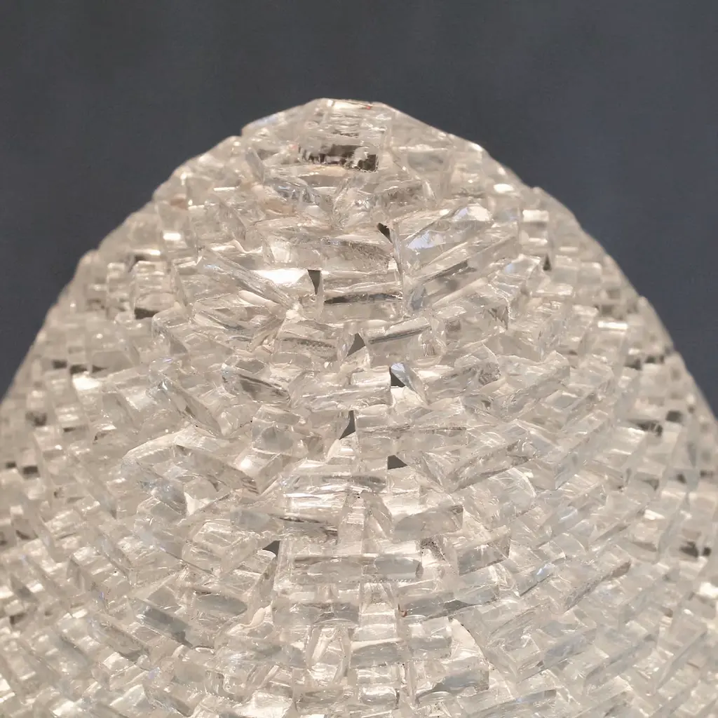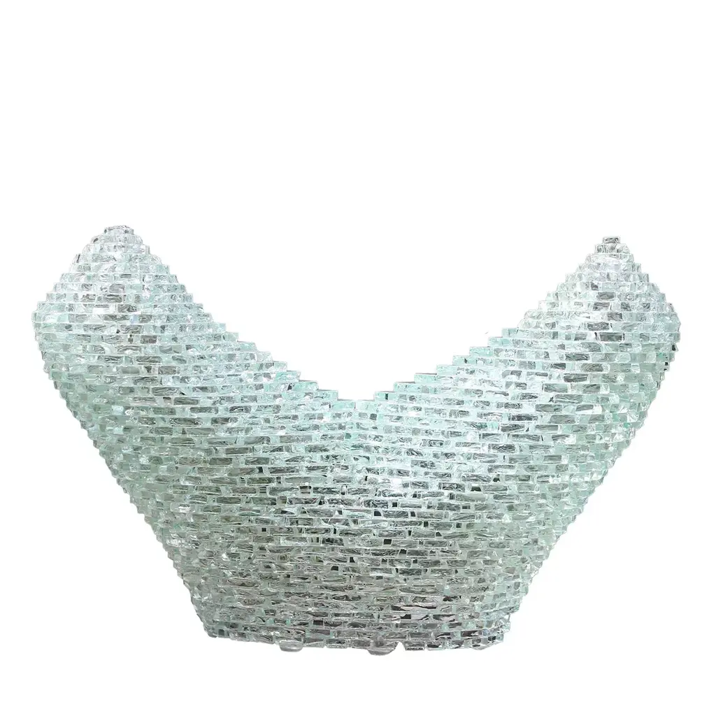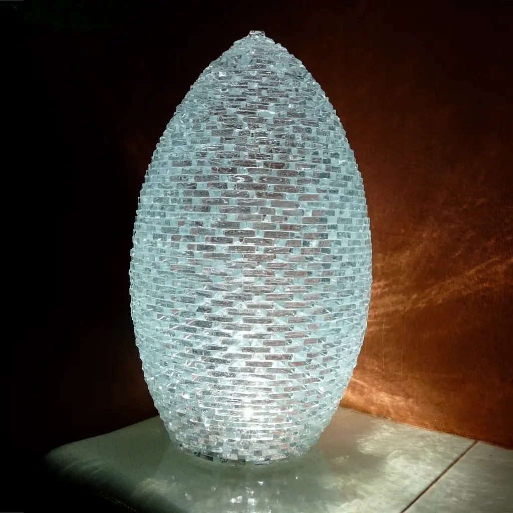 This striking, egg-shaped luminous sculpture by Gianfranco Coltella piece will imbue any style decor with unprecedented charm thanks to a glorious interplay of lights and transparencies. Filled in with an LED light source, it is handcrafted of hundreds of glass pieces cut, polished, and assembled by expert hands. Signed by the artist.