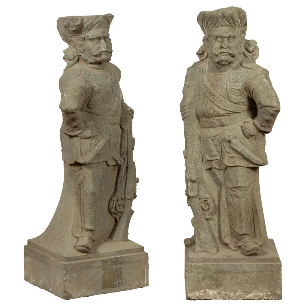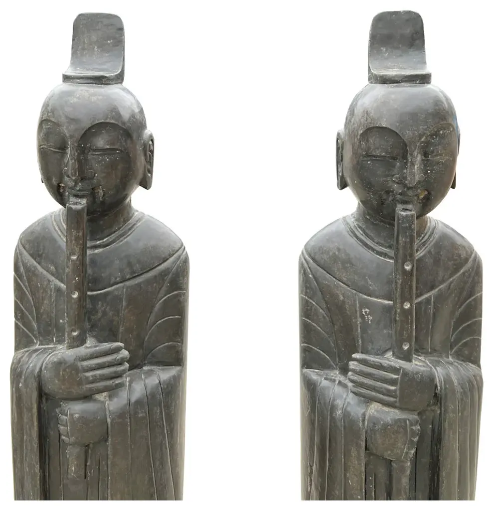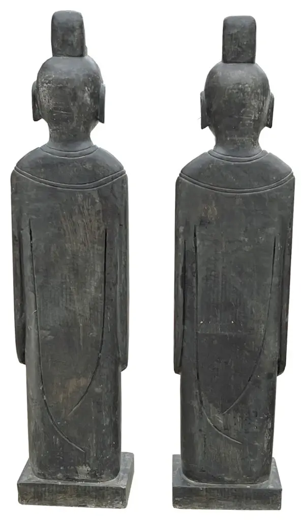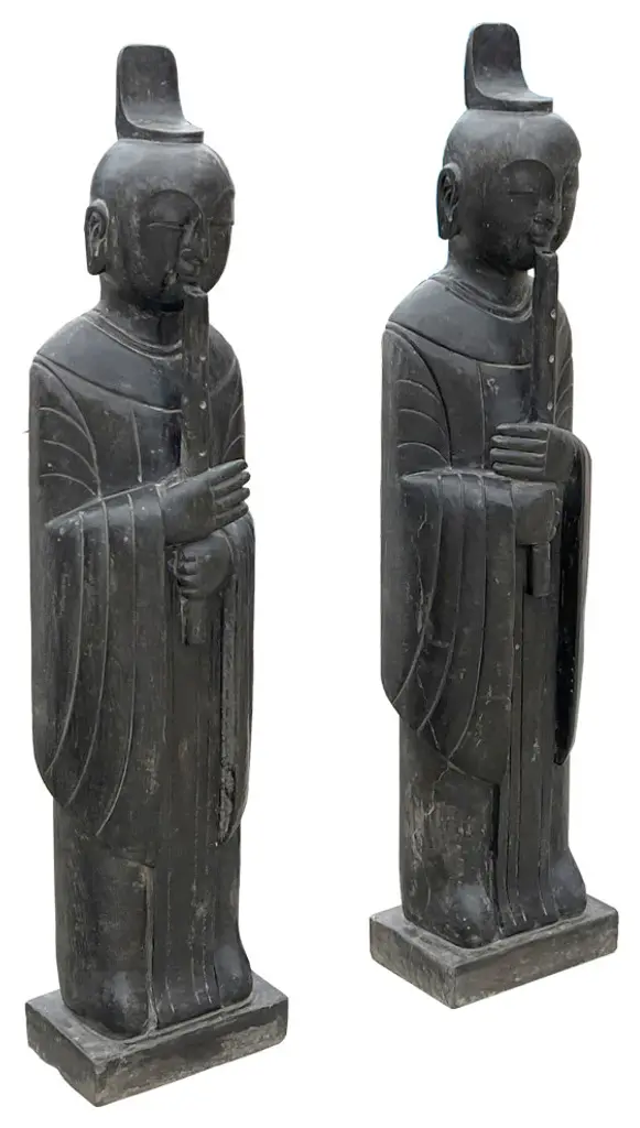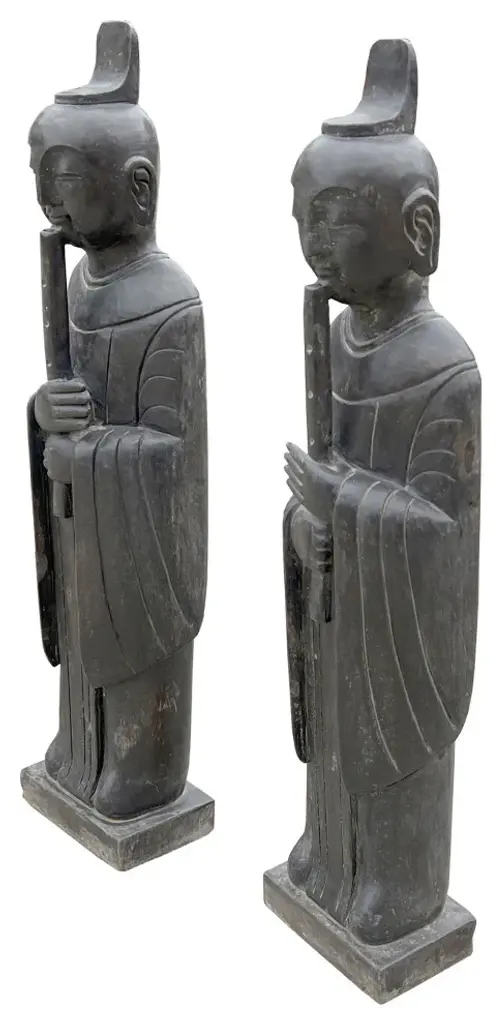 This is a pair standing Chinese oriental Zen style statue carved from grayish-black color stone. It is an ancient dynasty style person look. The body is carved with a simple outline robe dress. It is a nice piece for Zen garden design or indoor home decoration.Dimensions: w9.5" x d6.5" x h40"Origin: ChinaMaterial: StoneCondition: Handmade, natural stone imperfection, minor chip at the base bottom, dirt marks will be removedUS domestic continental buyer of 48 states pays $380 shipping charge for curbside delivery. Customer from New York, Hawaii, Alaska, US Island, Florida Keywest, and Canada pays extra shipping cost. Insurance and handling charge are already included in the shipping cost. In-store pick-up is highly welcomed if you are in San Francisco Bay Area. (No charge) White-Glove (4-8 weeks transit) service can be arranged with additional cost - needs quotation based on the destination.When your shipment is delivered, carefully inspect the outside of the packaging before the delivery personnel leave. It is important to clearly indicate if there is any visible damage to the packaging or items on the delivery paperwork. Carriers usually do not honor concealed damage claims so it is crucial to clearly indicate any visible damage to the packaging or items on the delivery paperwork.