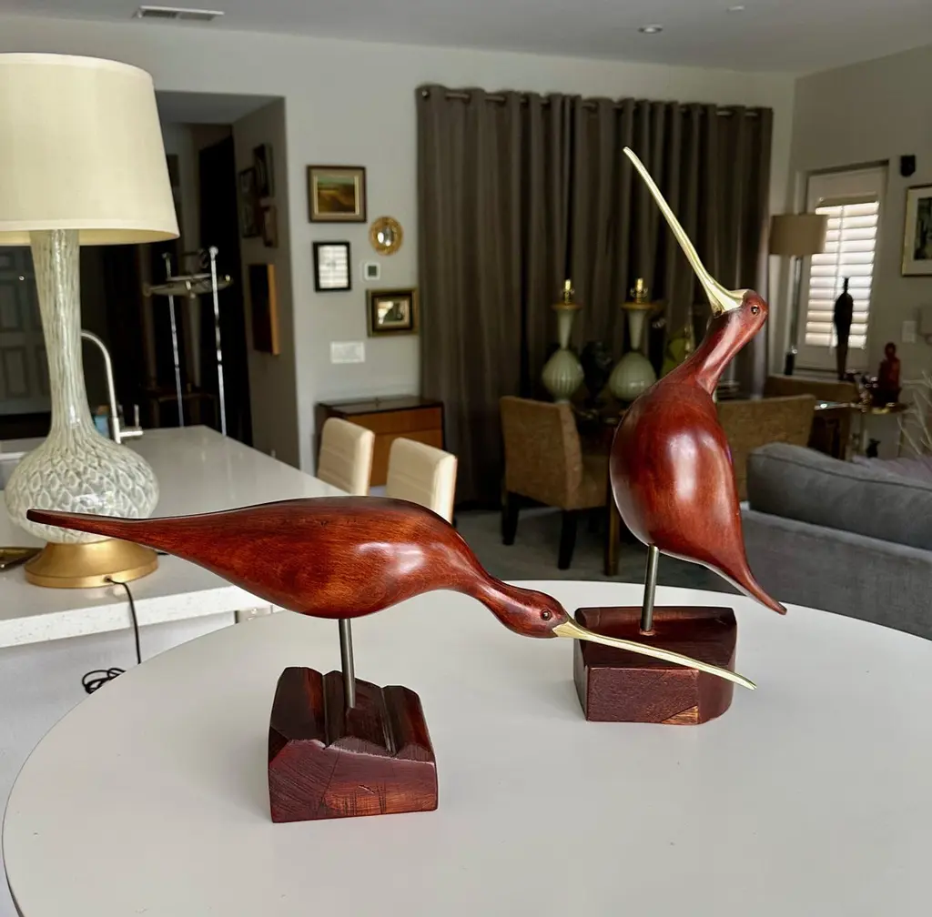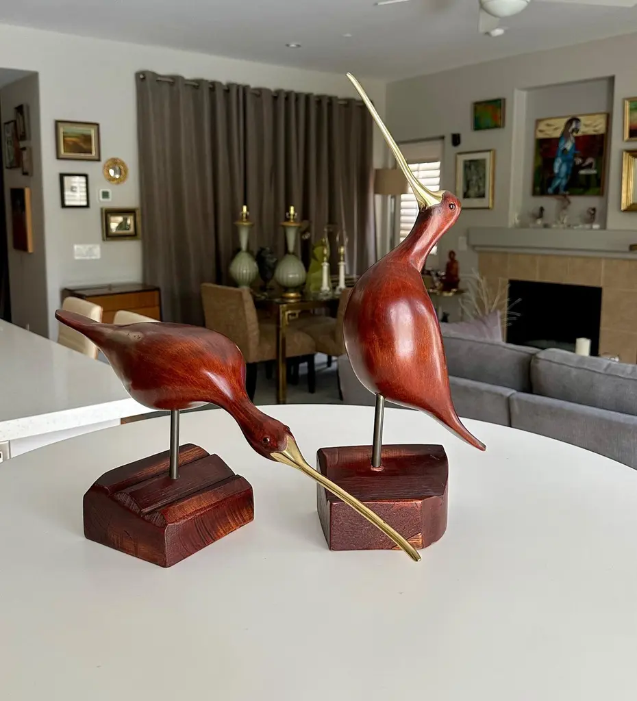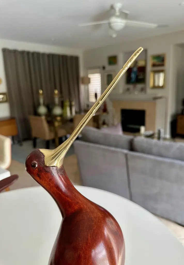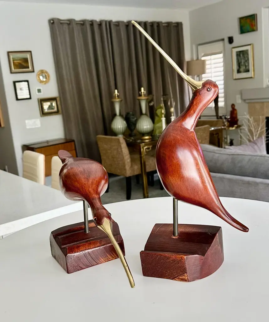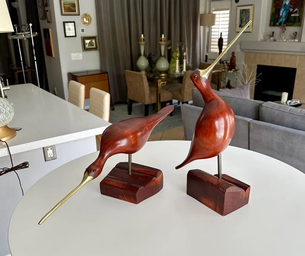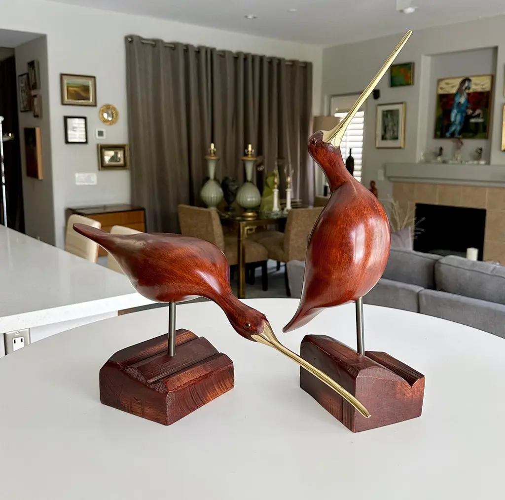 Pair Midcentury Modernist Carved Wooden And Brass Bird Sculptures