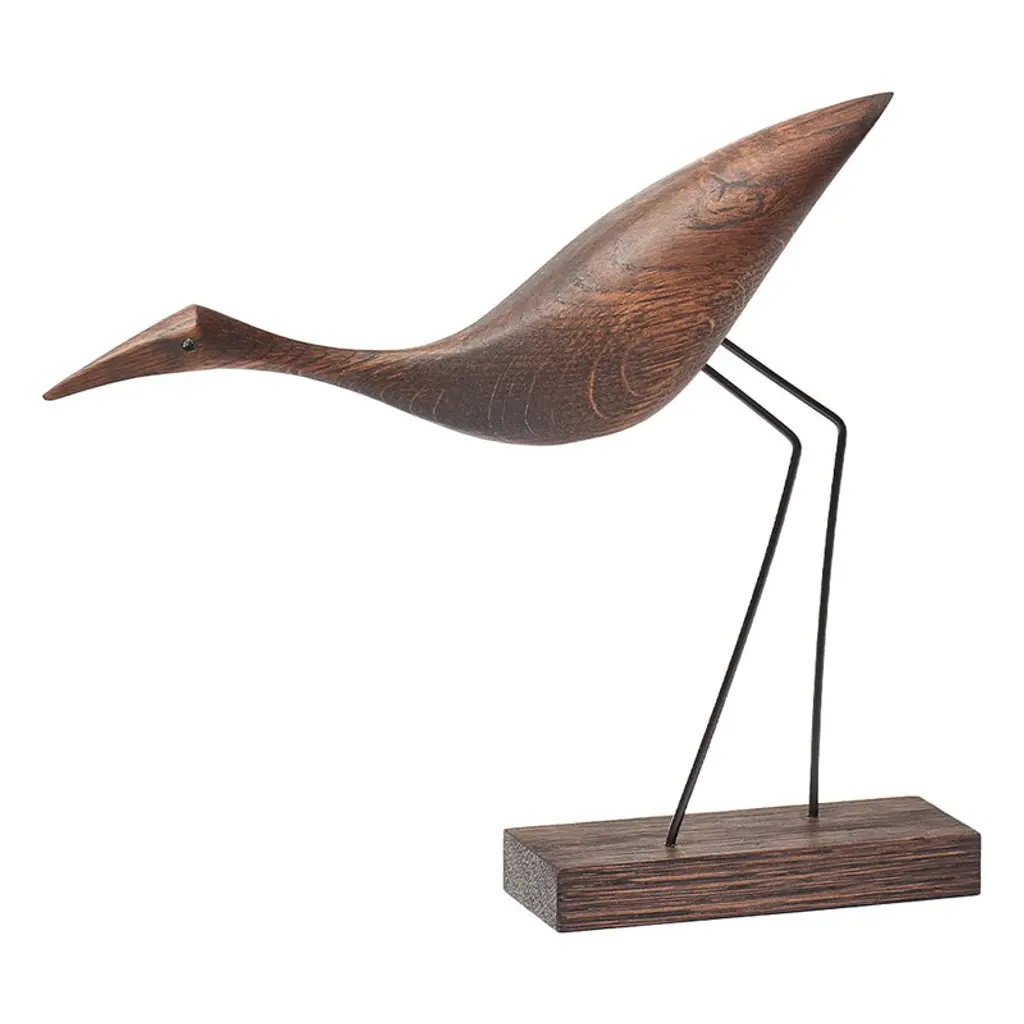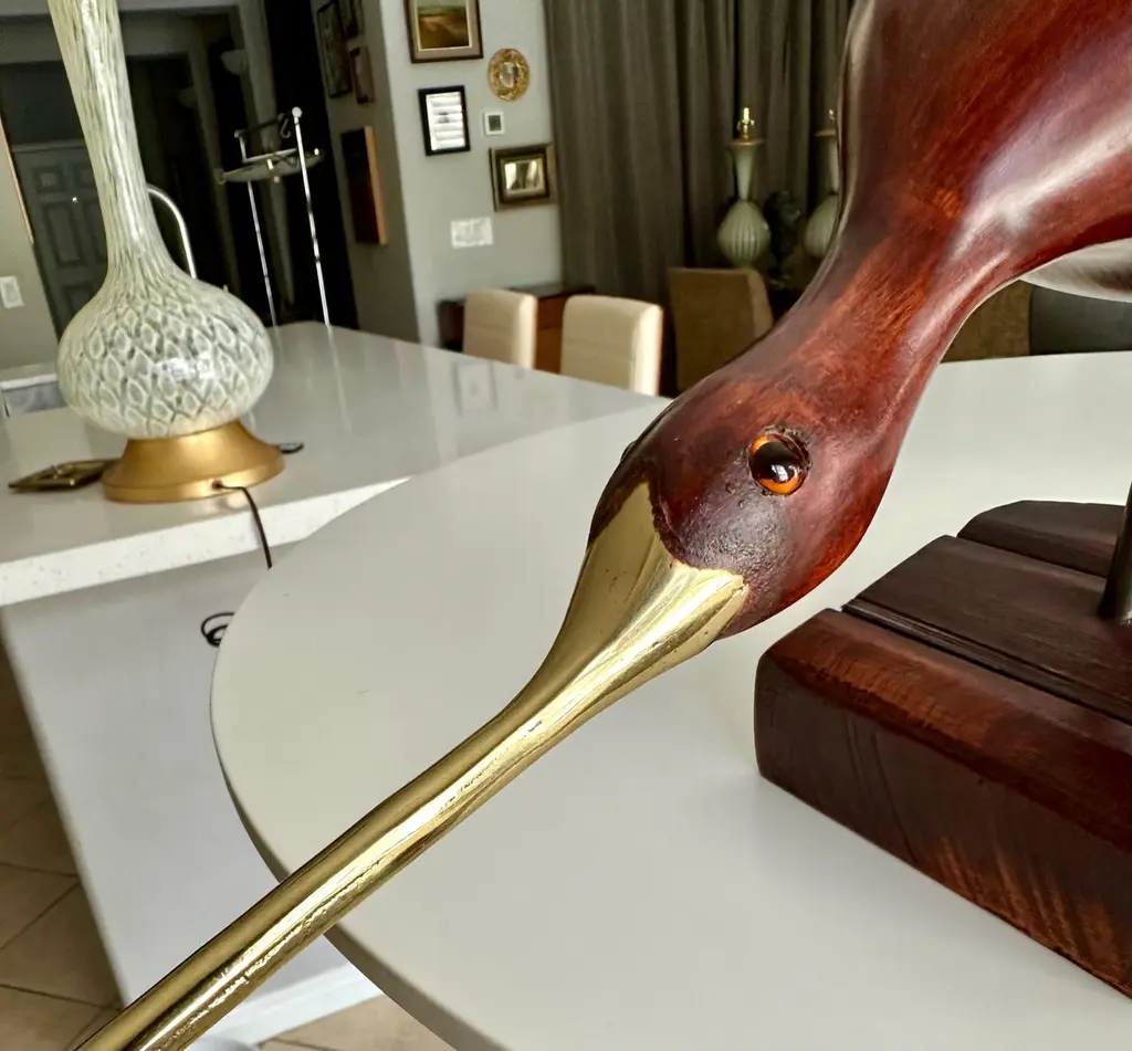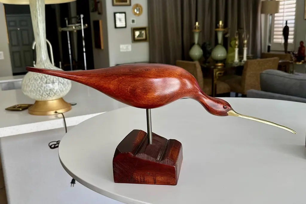 Pair of vintage hand carved sandpiper bird sculptures with elongated brass beaks and glass eyes, each mounted on stylized wood carved bases. Each measures:9" t x 22" w x 6" d19" t x 10" w x 5" d