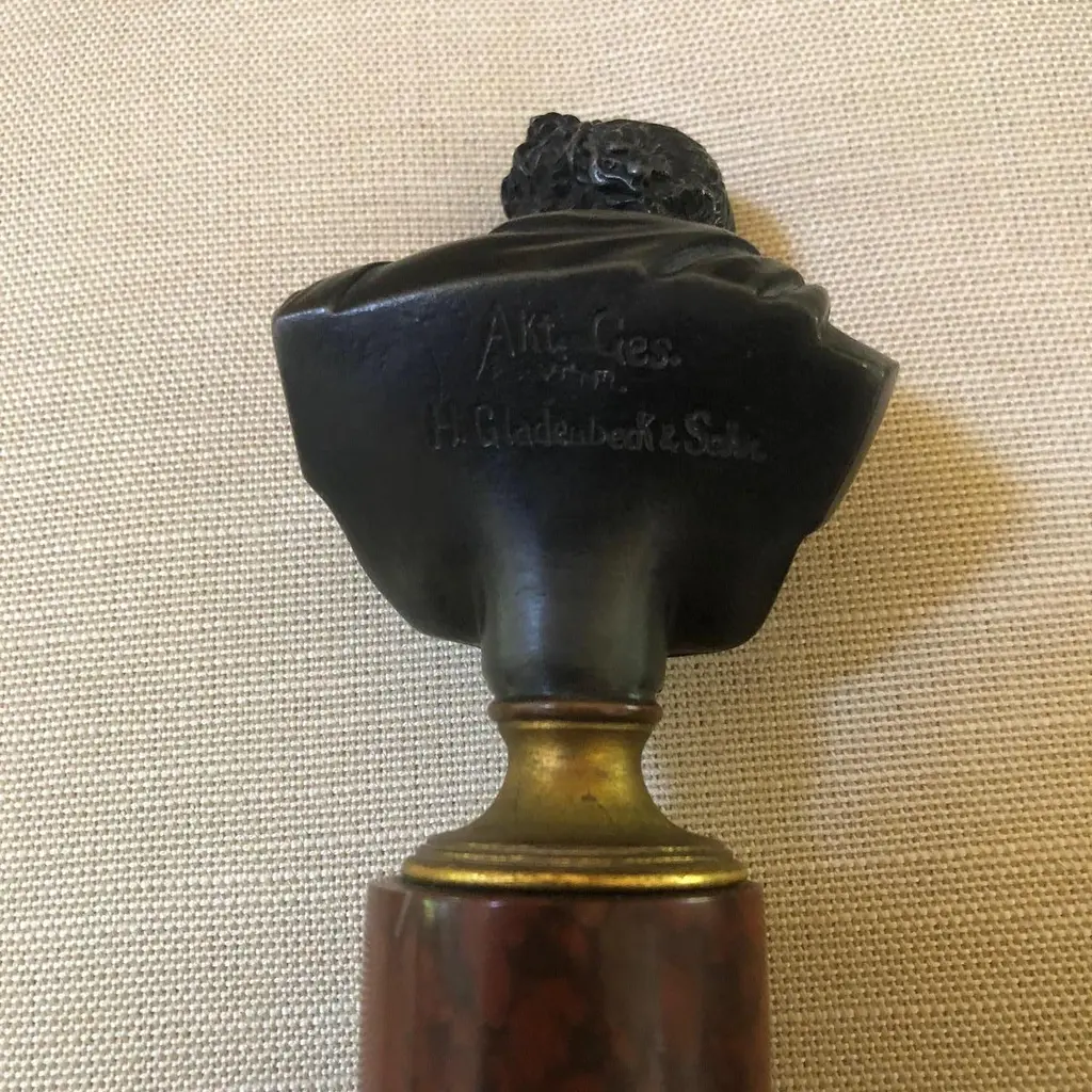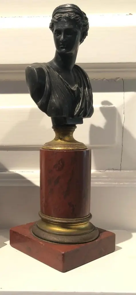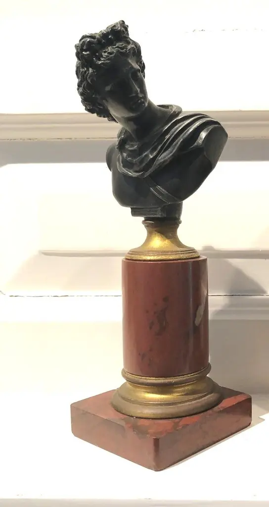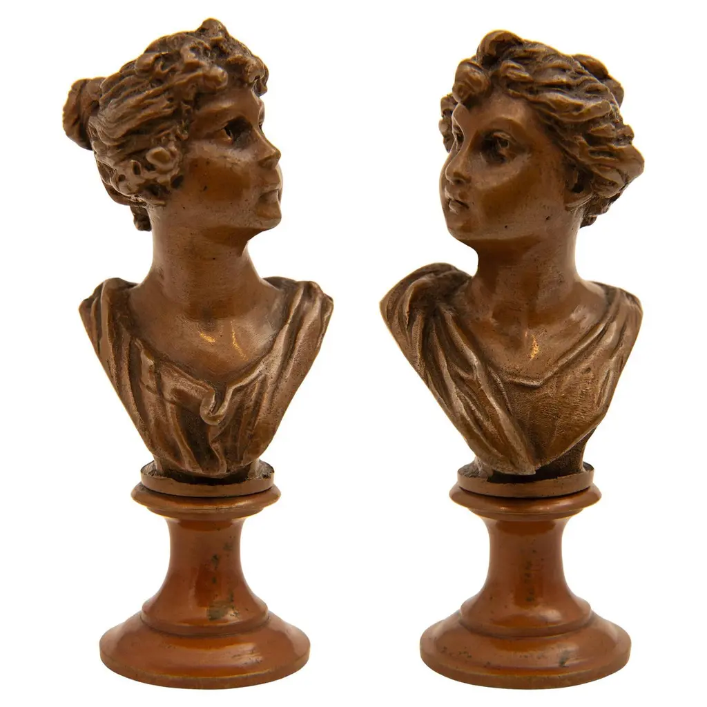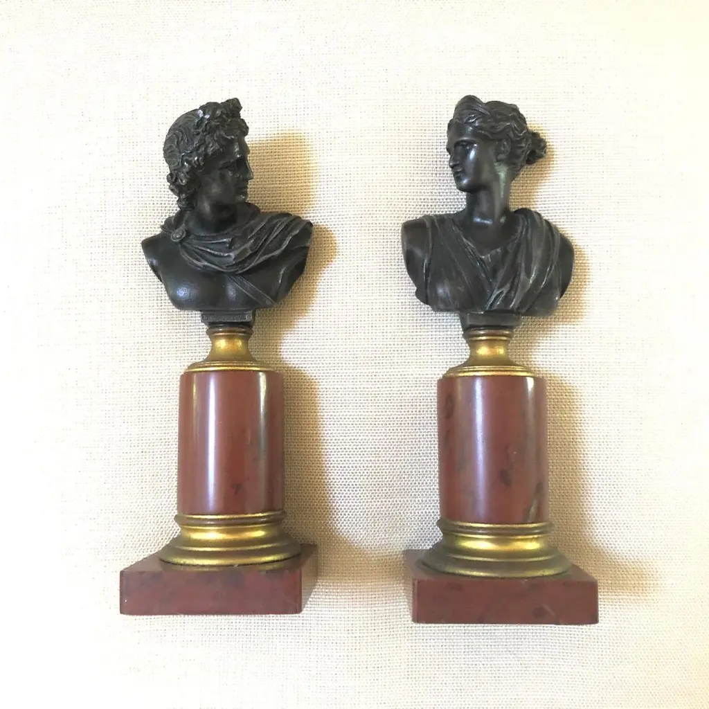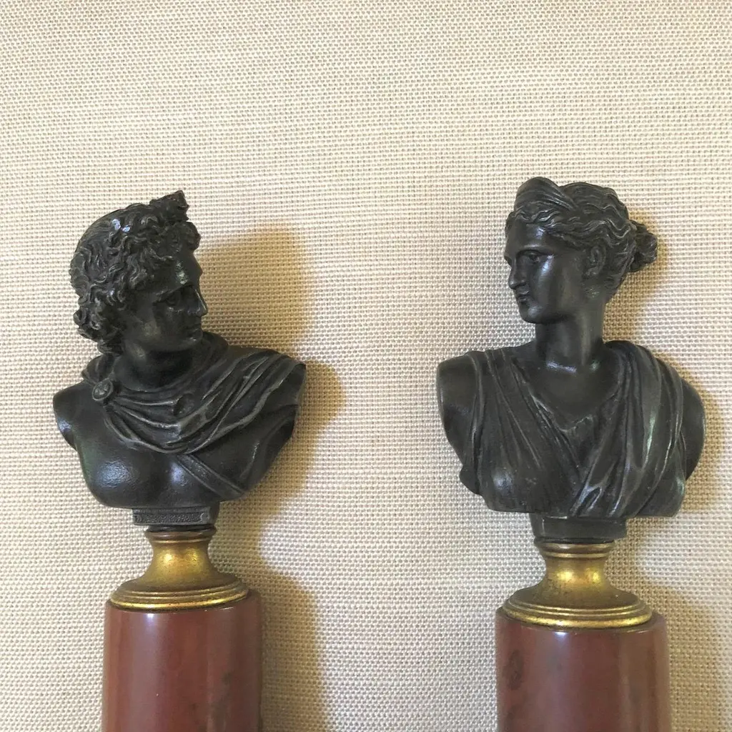 Pair of marble and bronze Neo Classical Grand Tour decorative sculptures, w Bronze busts of Diane and Apollo , standing on Red Marble columns & bases w. gilt Bronze mounts.Both signed w. Foundry Gladenbeck on back. Finest quality casting and patina , elegant gilt mounts & rare colored marble.#GrandTour #Apollo #Diana #Rougemarble #Busts #Roman