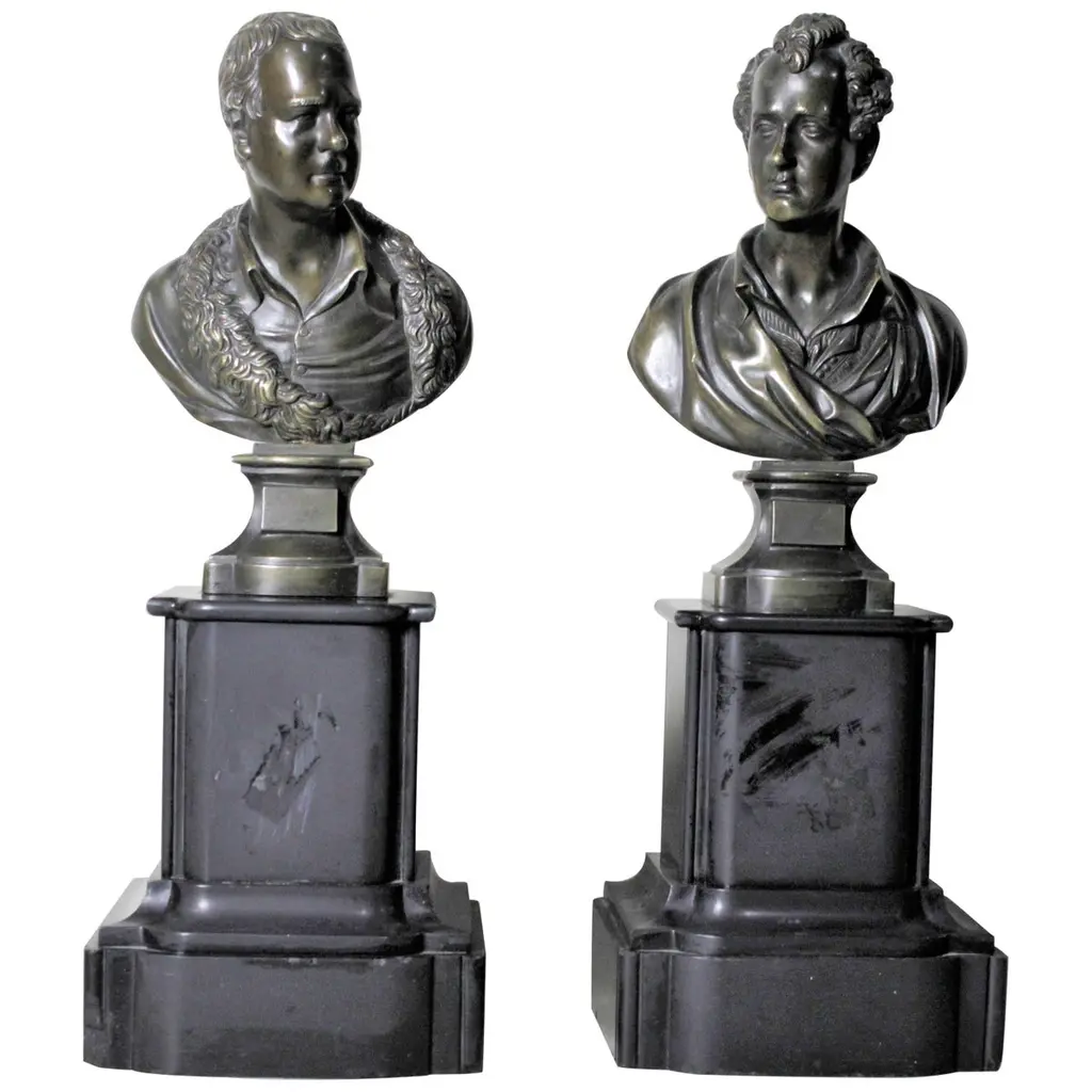 Pair Of 19th Cent. Diana & Apollo Bronze Busts On Rouge Marble Mounts