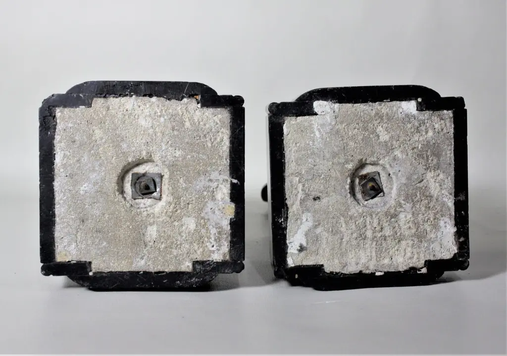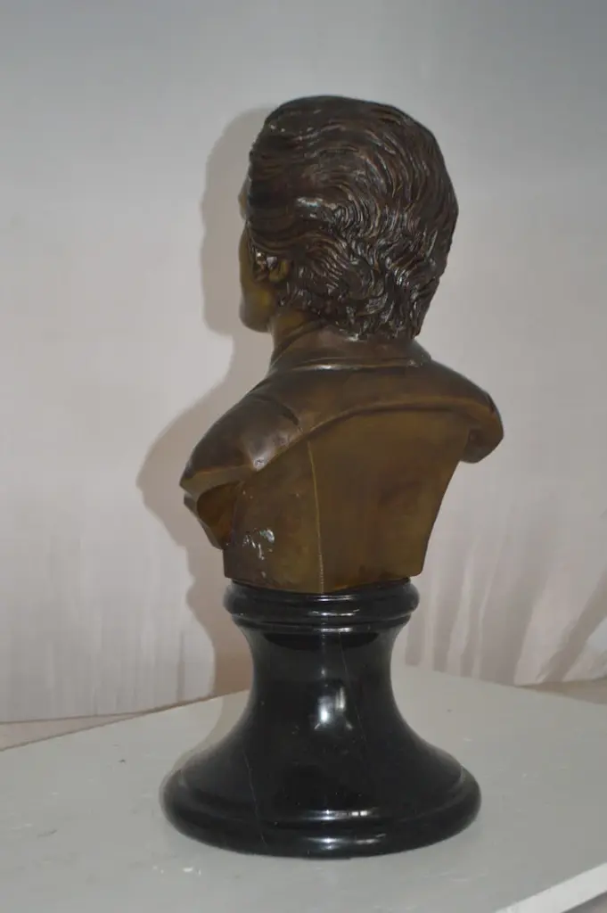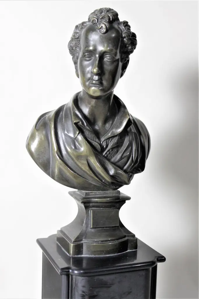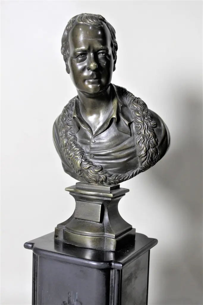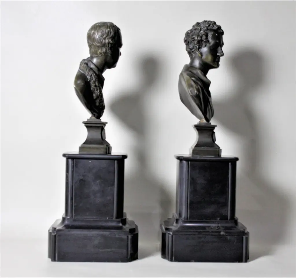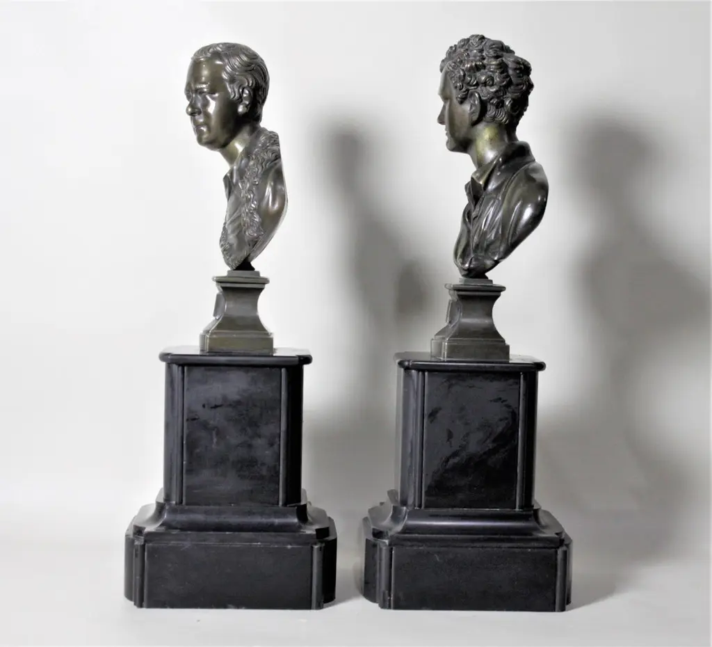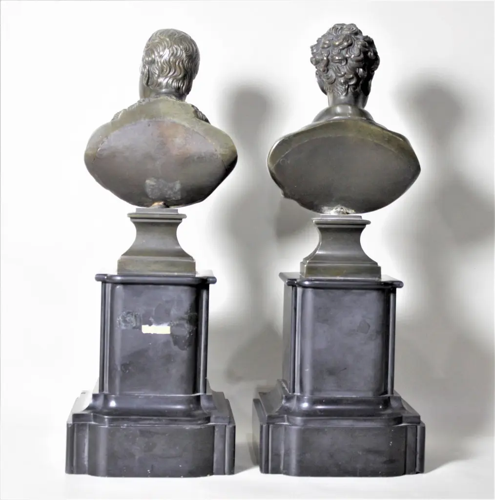 This pair of antique bronze statues are unmarked, but presumed to have been made in England in approximately the year 1900. These statues are well executed and depict both famous poets, Robert Burns and Walter Scott respectively. Each bronze is mounted on a stepped base composed of a stone which appears to have been painted black with a lacquer finish to mimic polished slate.