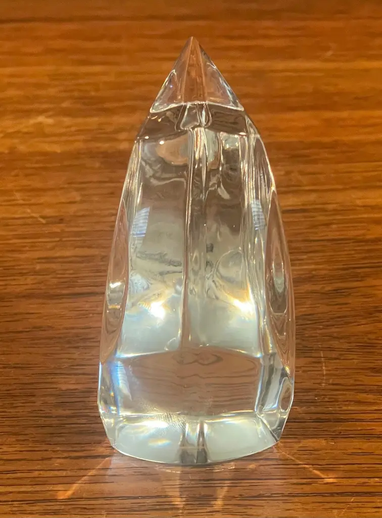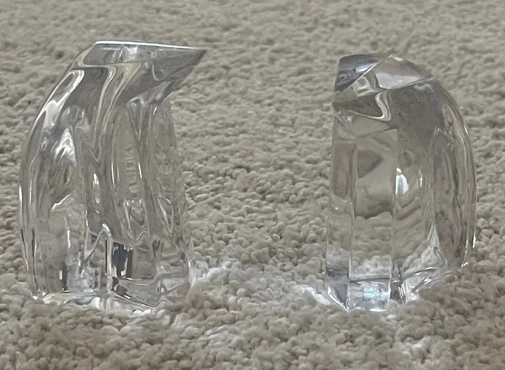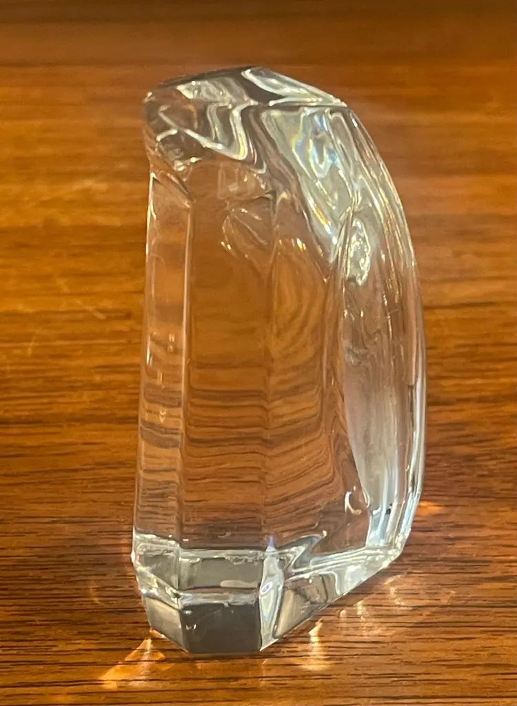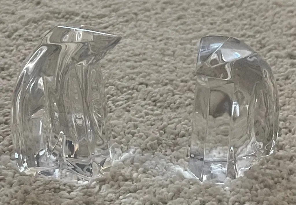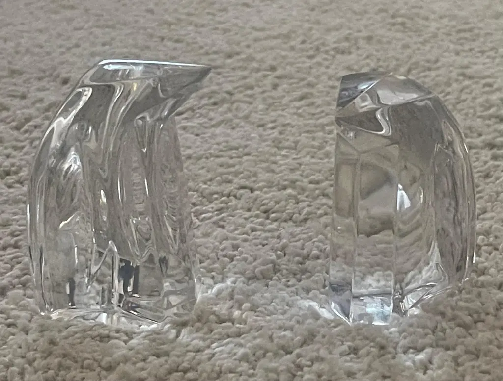 A pair of petite faceted clear crystal penguin sculptures by Val St. Lambert exclusively for the Danbury Mint, circa 1980s. The pair are in excellent condition with no chips or cracks and have a nice weight to them. Each penguin measures 1.75"W x 2"D x 3.25"H and are signed on the underside. Sorry about the photos, they are much better looking in person and really refract the natural light! #2742.