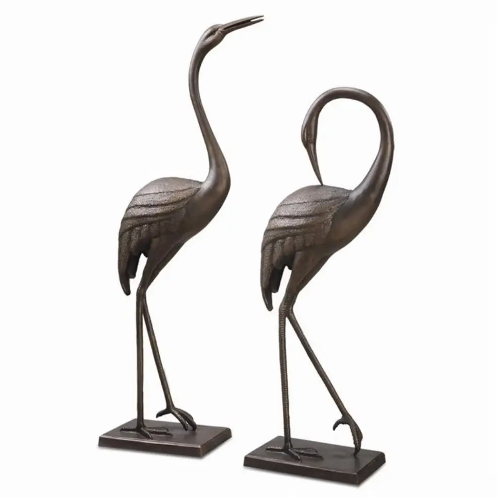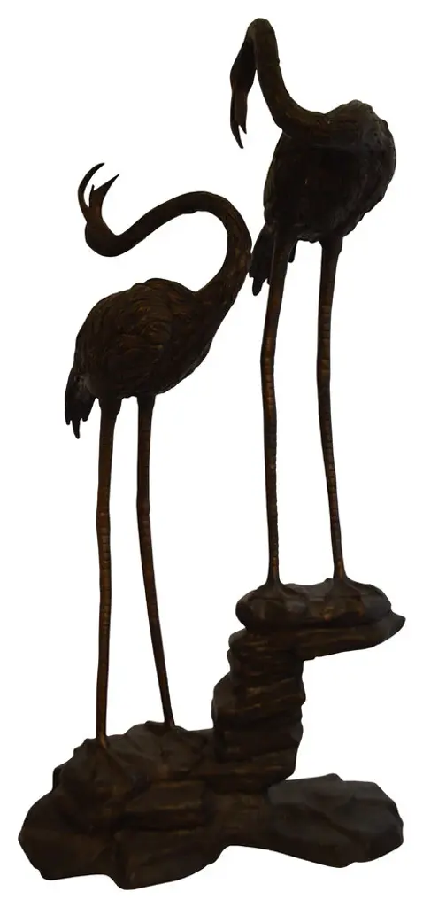 A pair of flamingoes are the center of this delightful indoor/outdoor bronze fountain. The detailed Bronze casting used to construct this fountain enables you to enjoy the texture of the flamingo"™s feathers. The statue is equipped with a hose that leads water out of the flamingo"™s mouth, with the use of a fountain pump (pump is not included). The figures feature a bronze finish that has been crafted to create aged, weathered nuance. This sculpture would be a great addition to your patio, garden, lawn, or anywhere else. Size: 33"L x 22"W x 60"H. Weight is: 80Lb