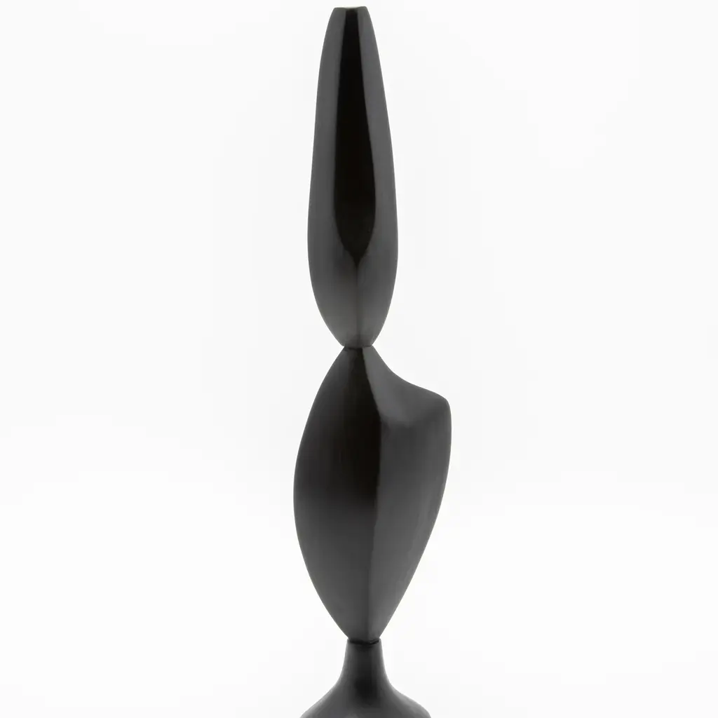 The pair of modern abstract sculptures, "The Sky and the Moon" by Patrick Coard Paris, is a stunning embodiment of minimalist elegance crafted from a rich black oak veneer inlaid on a fiberglass core. Each piece is meticulously hand-painted to accentuate the natural grain, creating a smooth, tactile finish that invites closer inspection. The dynamic silhouettes—one elongated, symbolizing the sky, and the other curved, representing the moon—form a harmonious yet striking duo. These sculptures are more than decorative objects; they are profound art pieces that bring a sense of sophistication and depth to any space, whether displayed individually or together, and are also available in a larger version for greater impact. Moon (Left): 20” X 4.5” X 3.8” Sky (Right): 20” X 3.8” X 3”