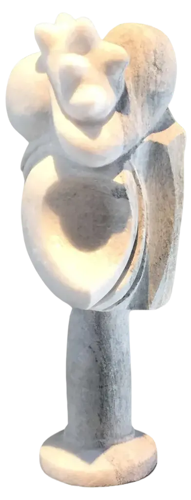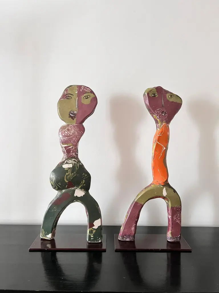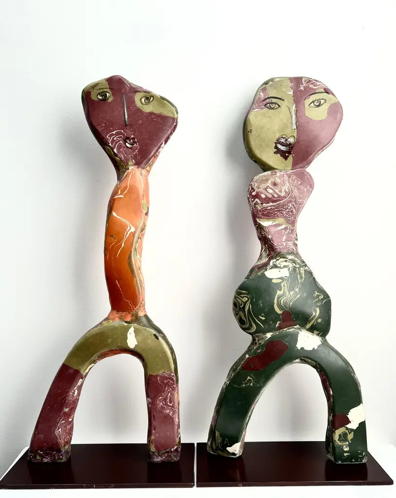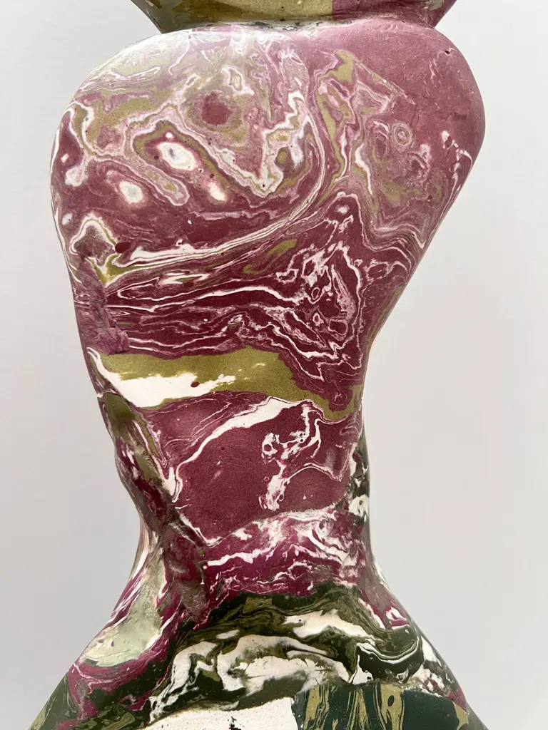 Standing 63cm tall, this pair of unique sculptures represent a couple, hand crafted in pigmented scagliola - a lengthy process that involves multiple stages of craftsmanship, sanding, filling and polishing to achieve a smooth marble-like finish. The marbled scagliola technique results in natural random patterns that emerge from the material, lending each piece an organic and one of a kind appearance. Scagliola is rarely utilised in sculpture, making these artworks particularly distinctive. Each piece, mounted on a steel base, serves as an elegant decorative accent, ideal for display on a console table or as a focal point in any interiors.63cmH x 20cmWOne of a kind pairAvailable now